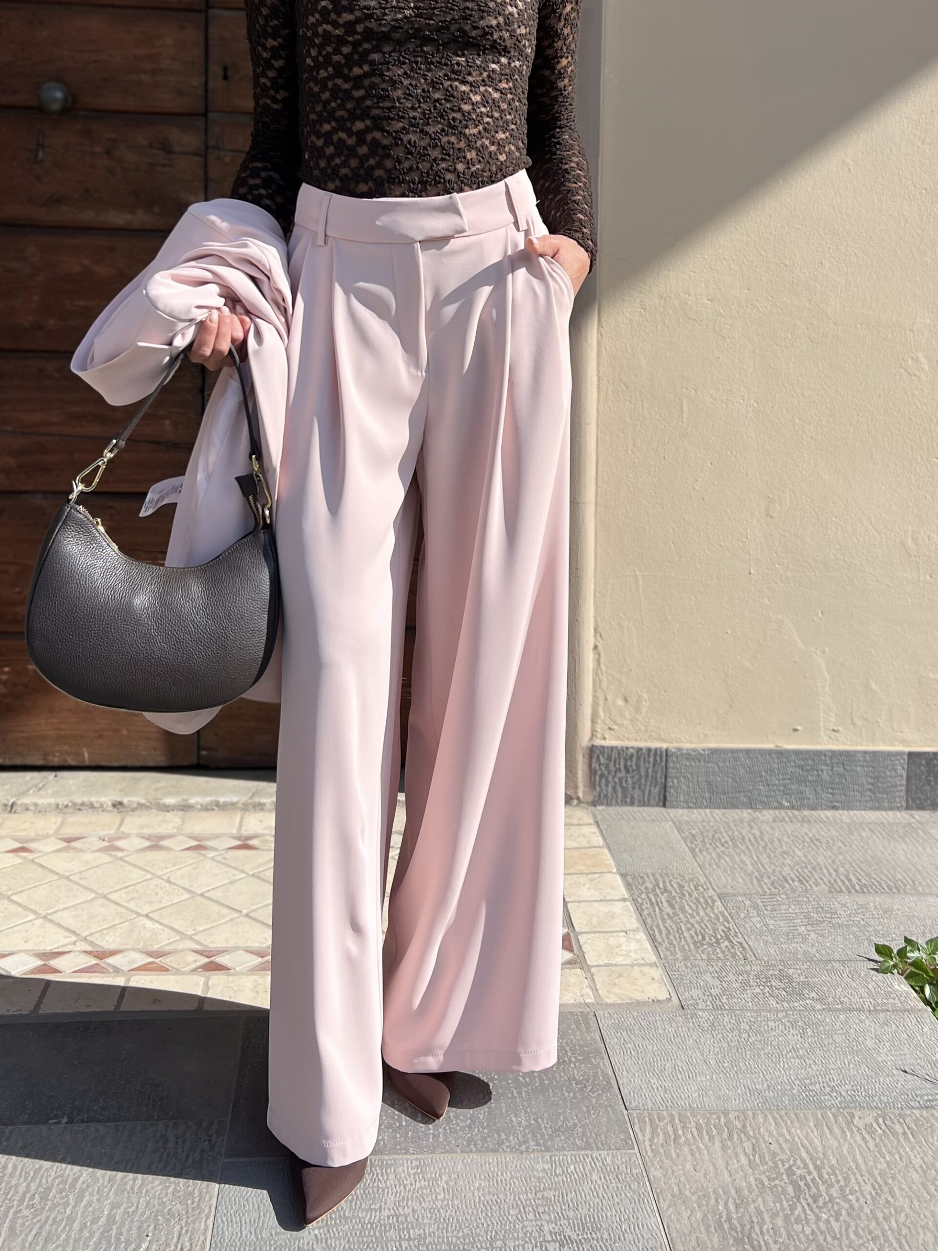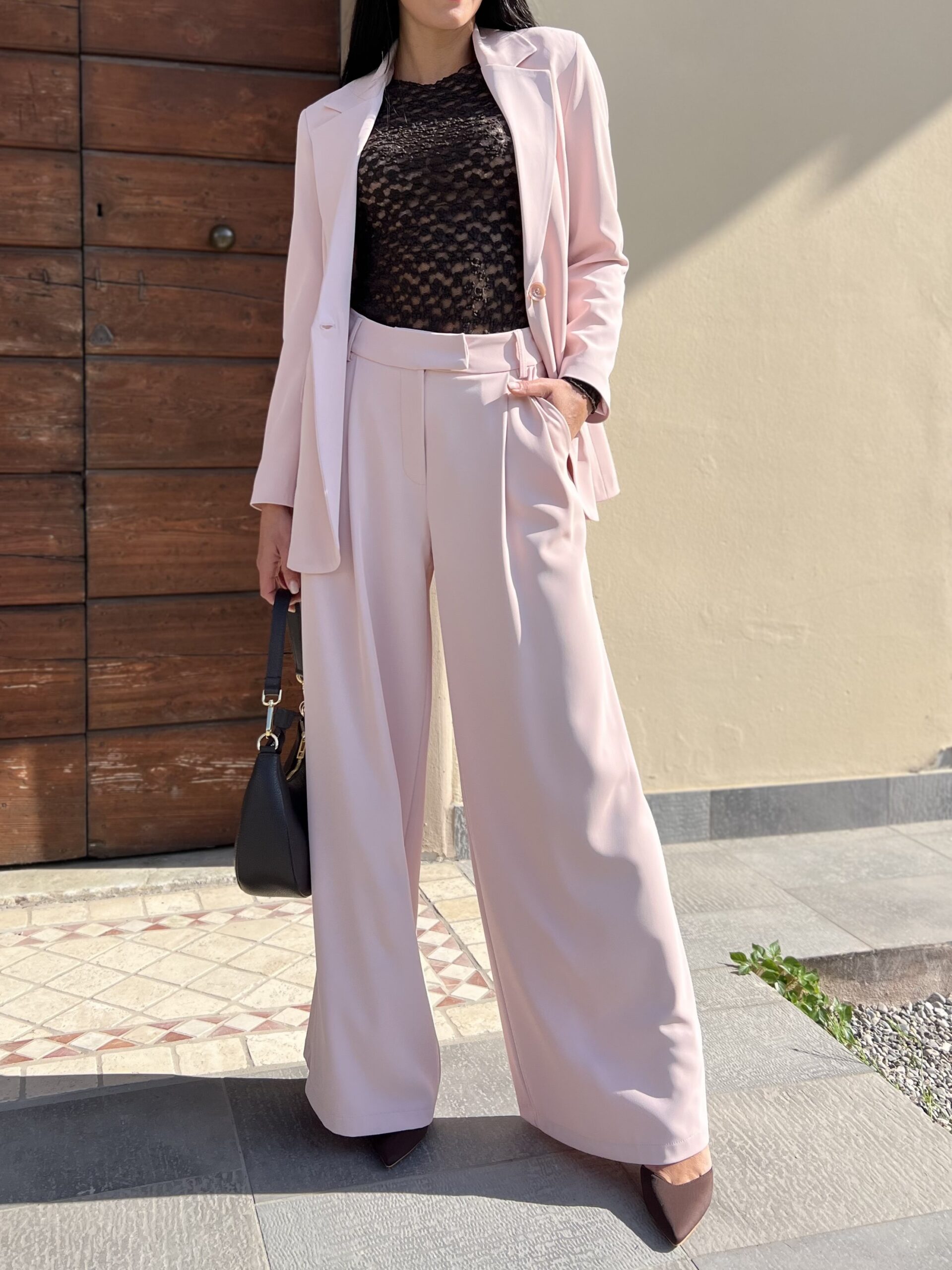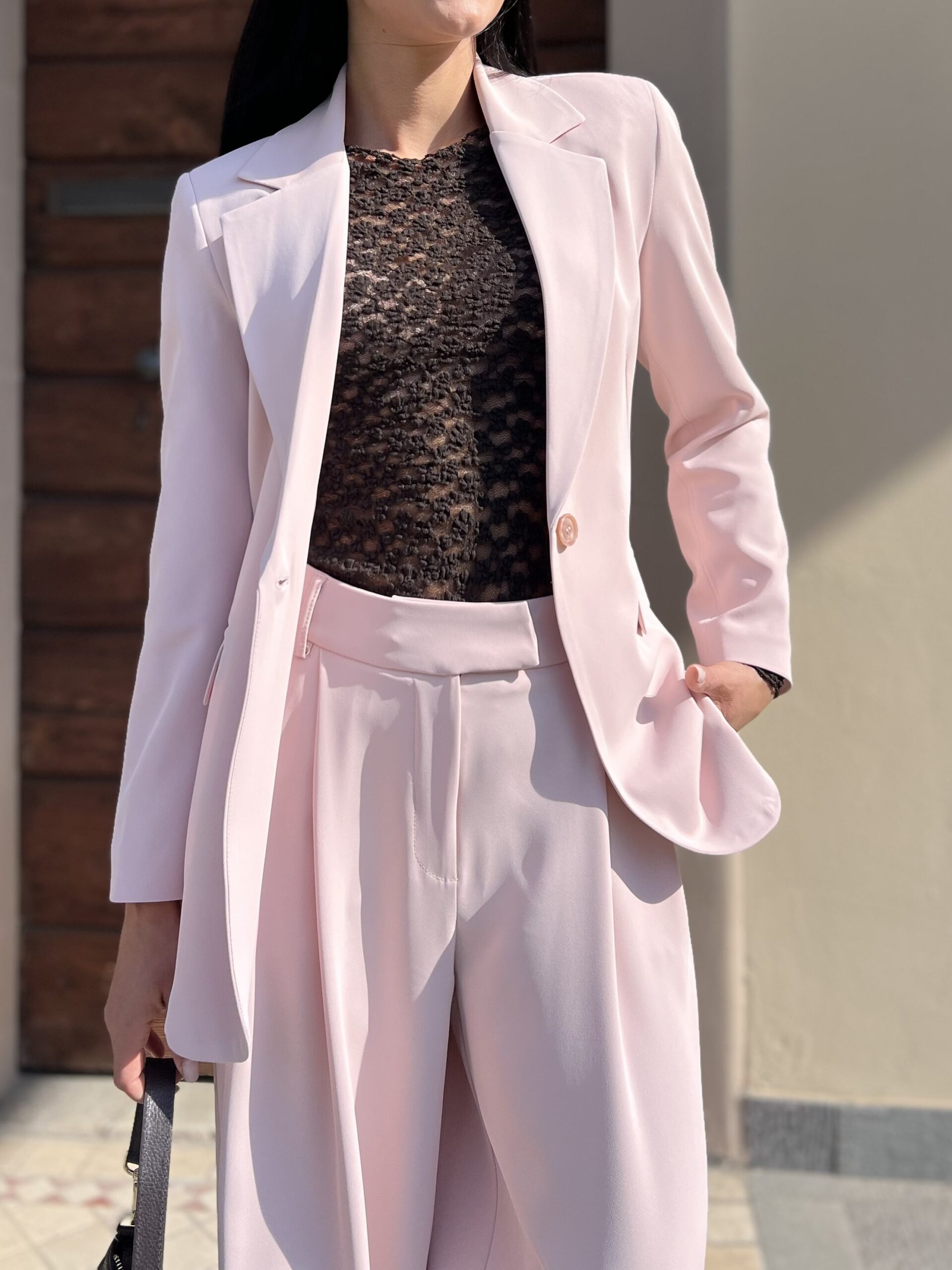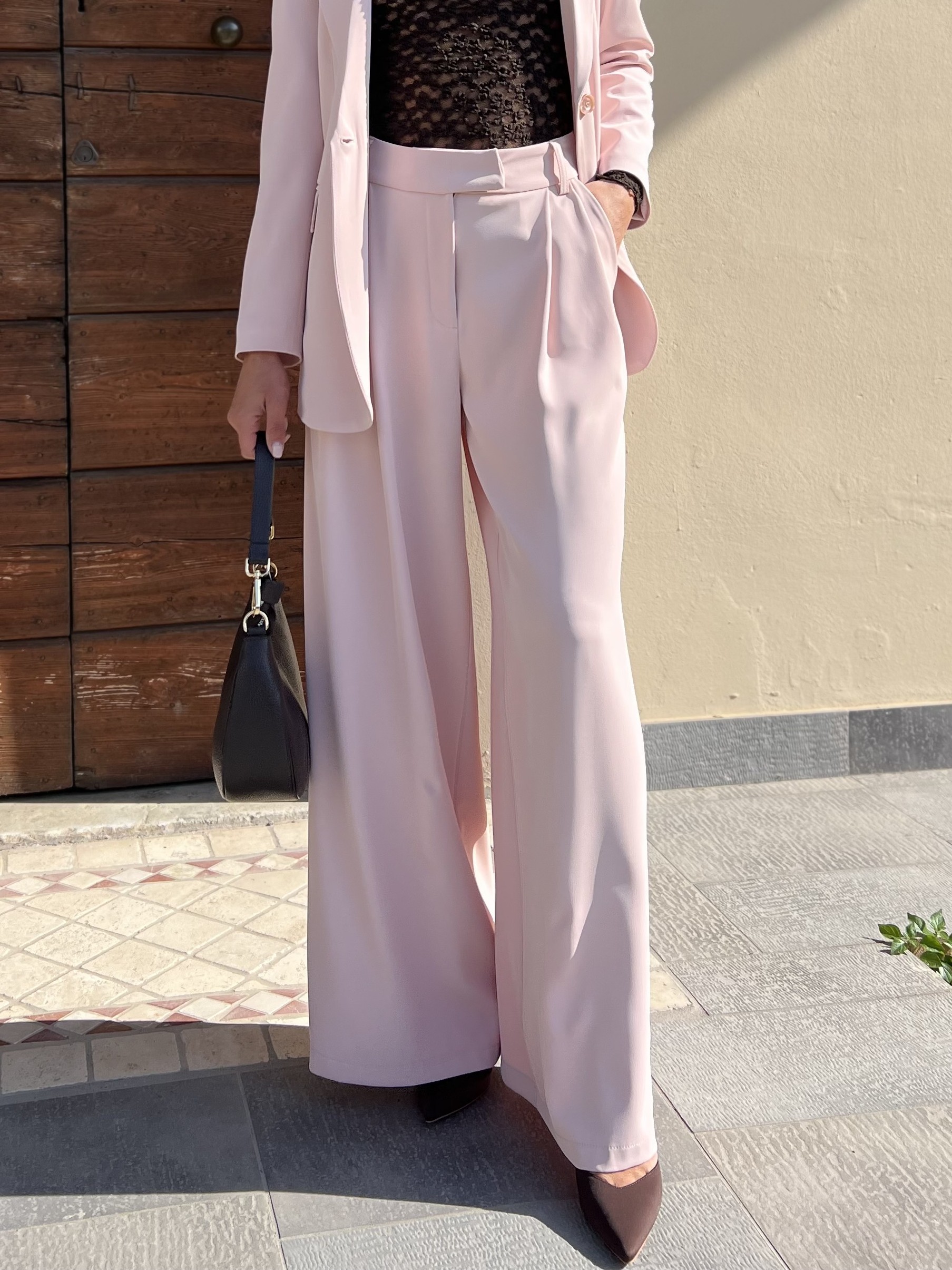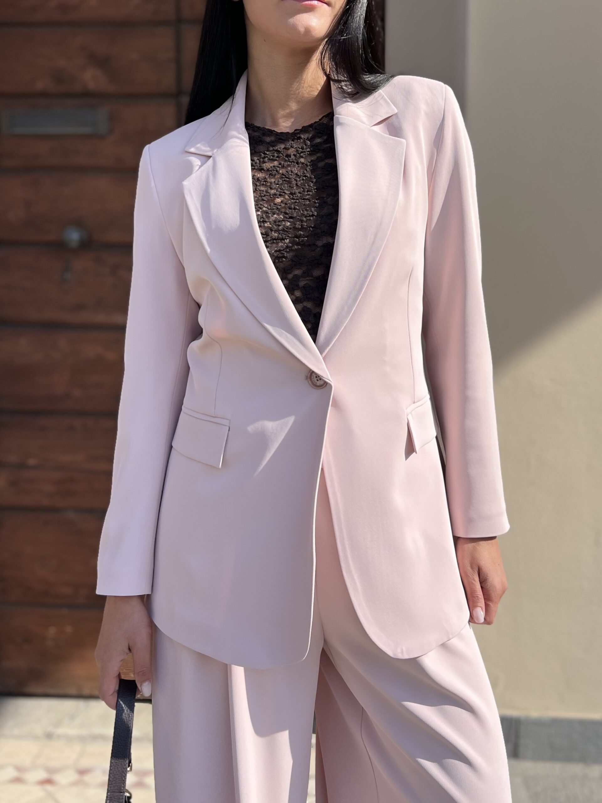 Completo con giacca monopetto leggermente sfiancata, foderata con chiusura con bottone singolo. Pantalone a palazzo con pinzes e tasca alla francese, vestibilità regolare.