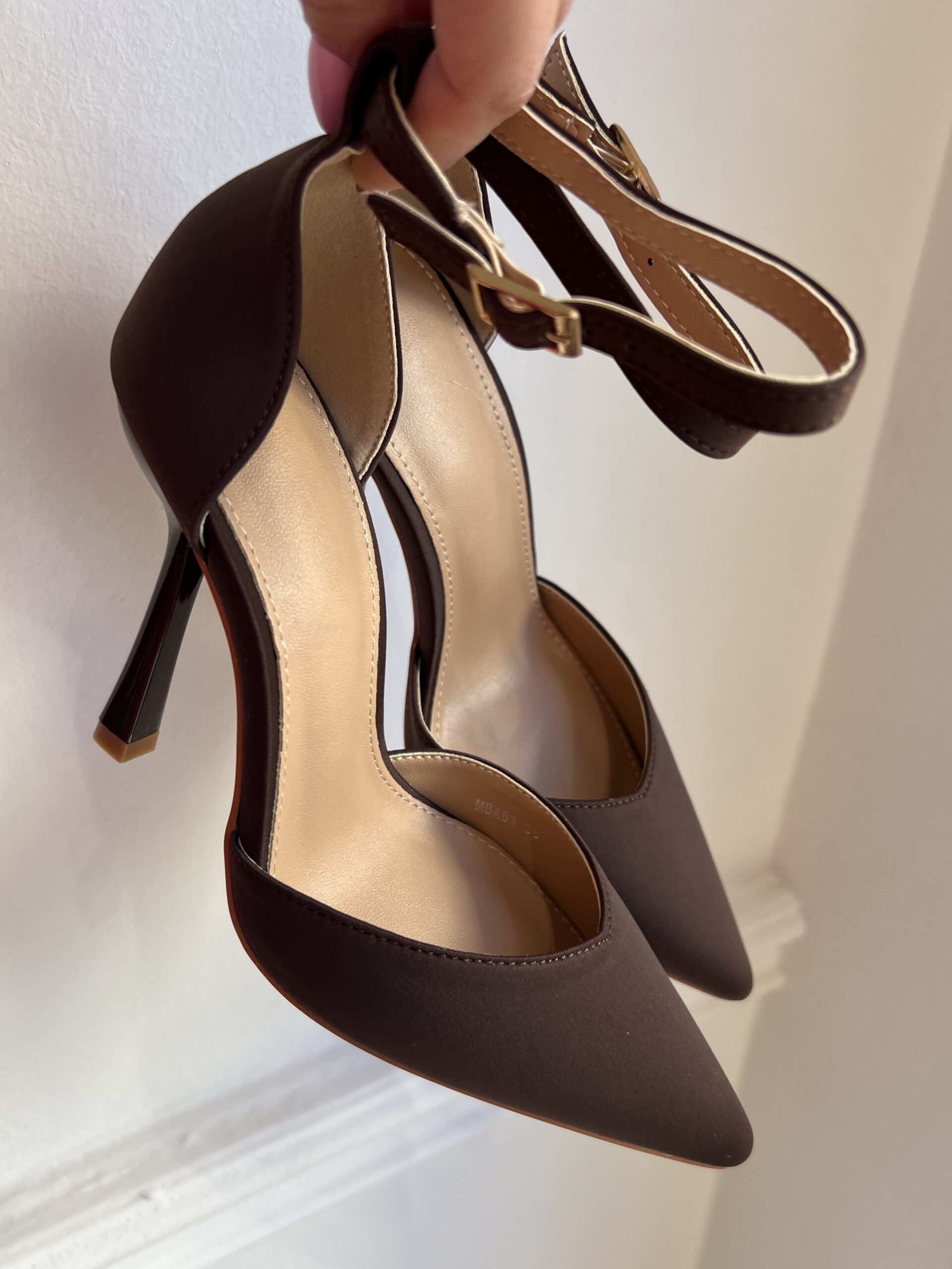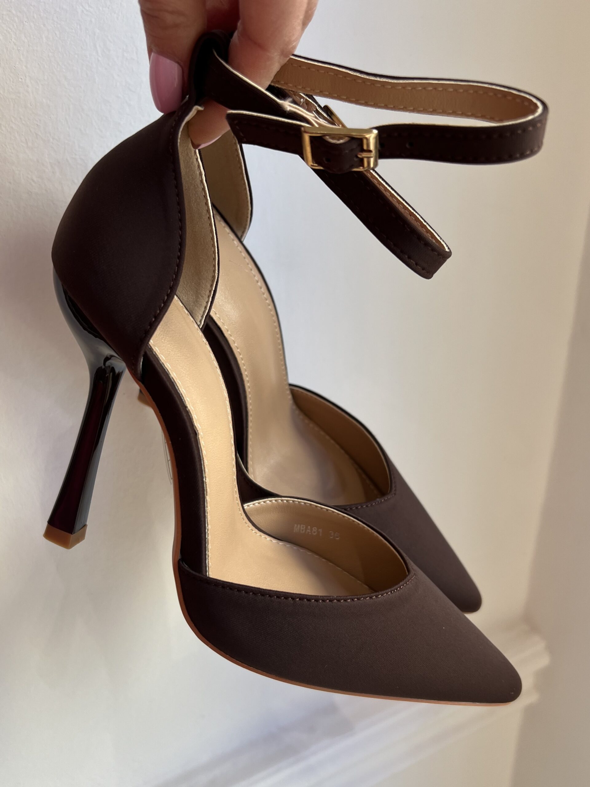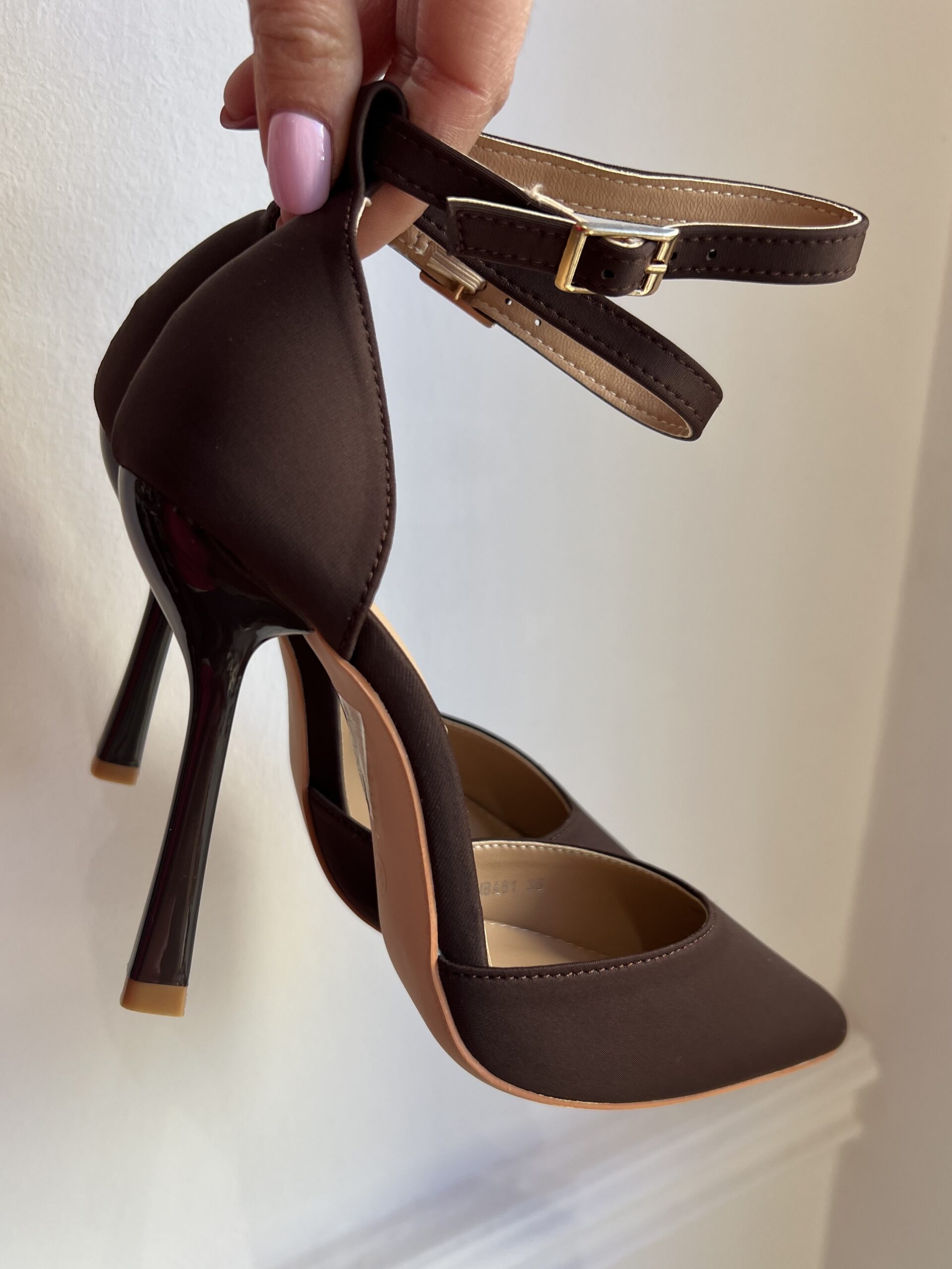 Décolleté con cinturino alla caviglia. Modello con scollatura leggermente a V, altezza tacco 10 cm.