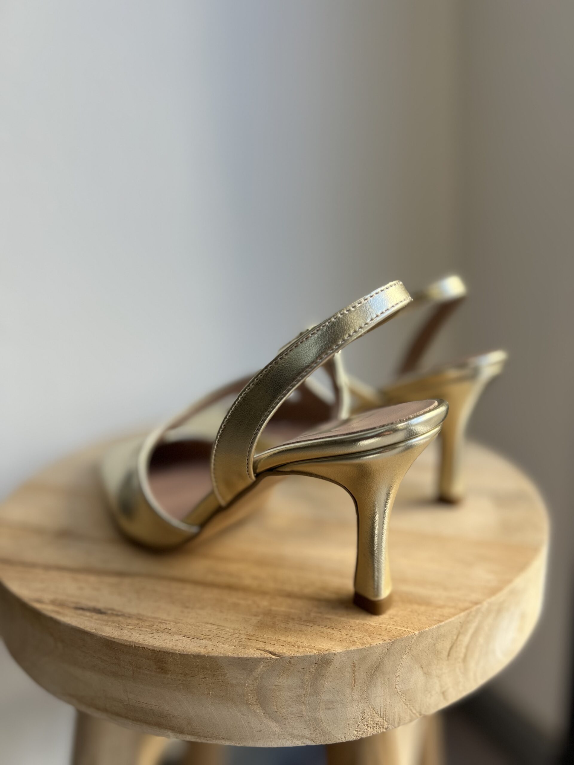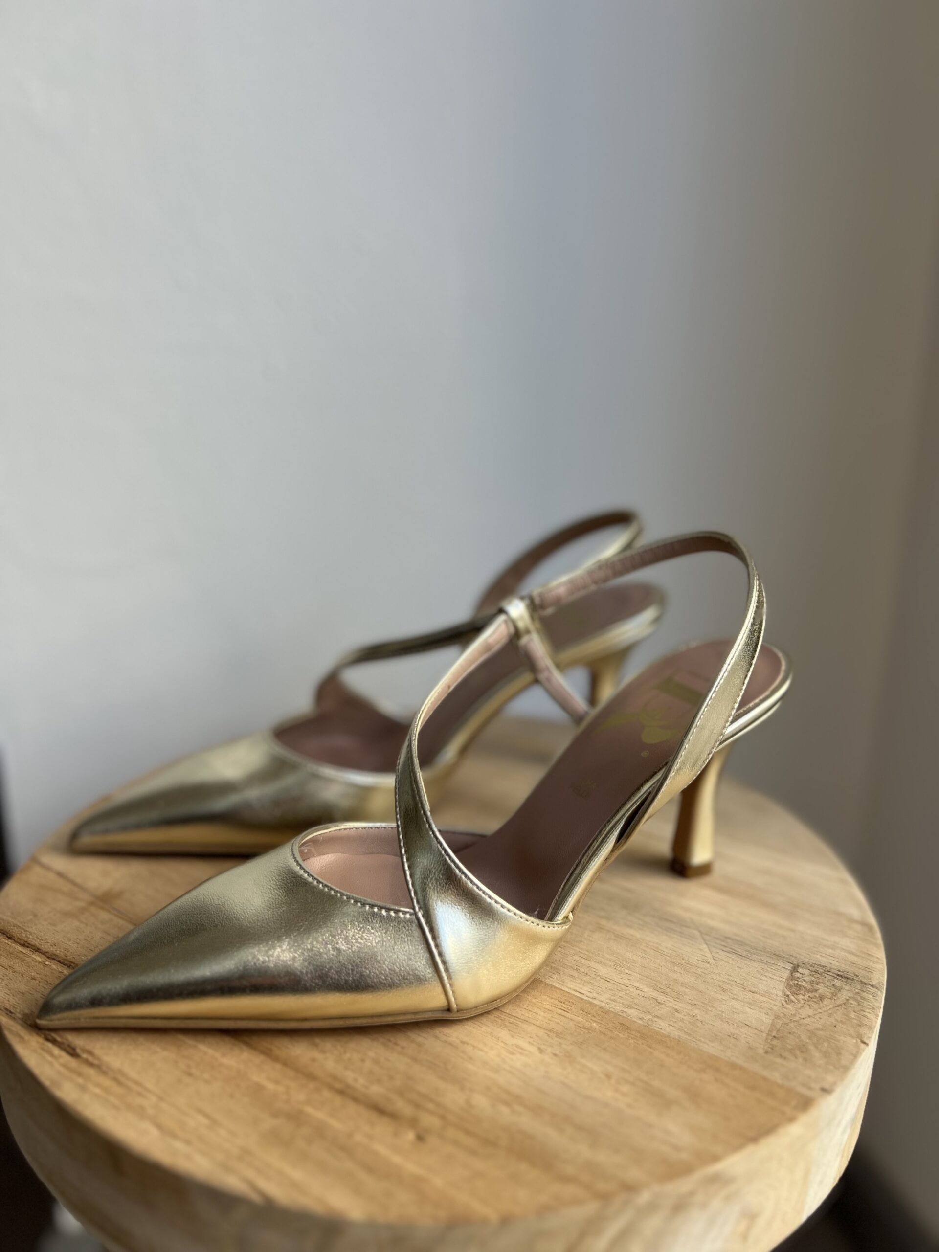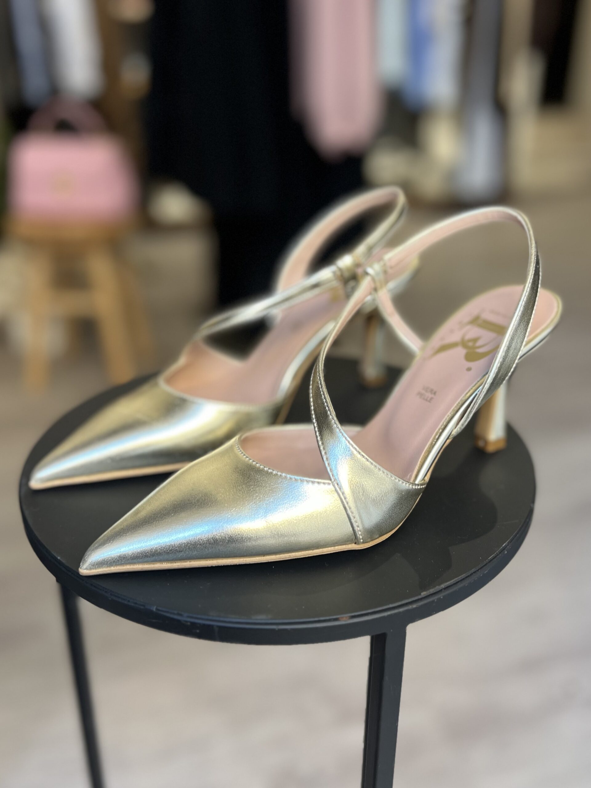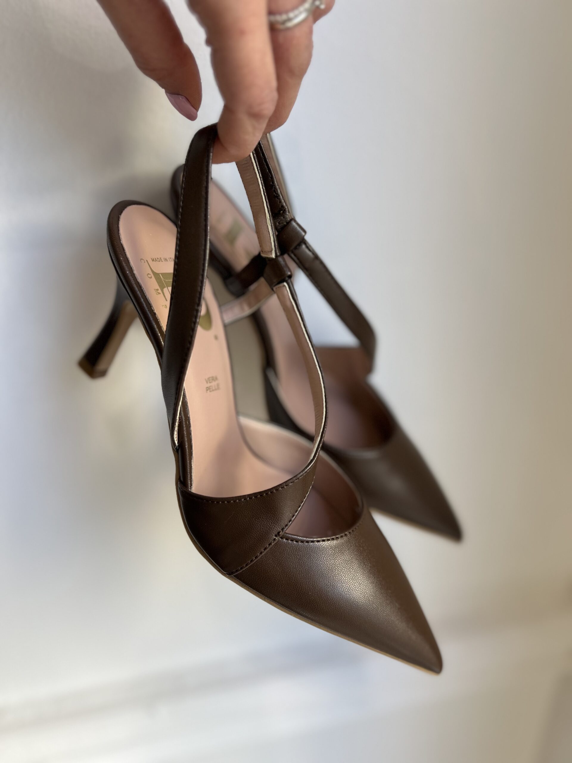 Décolleté in vera pelle con chiusura asimmetrica che slancia e tacco comodo a rocchetto 8 cm.