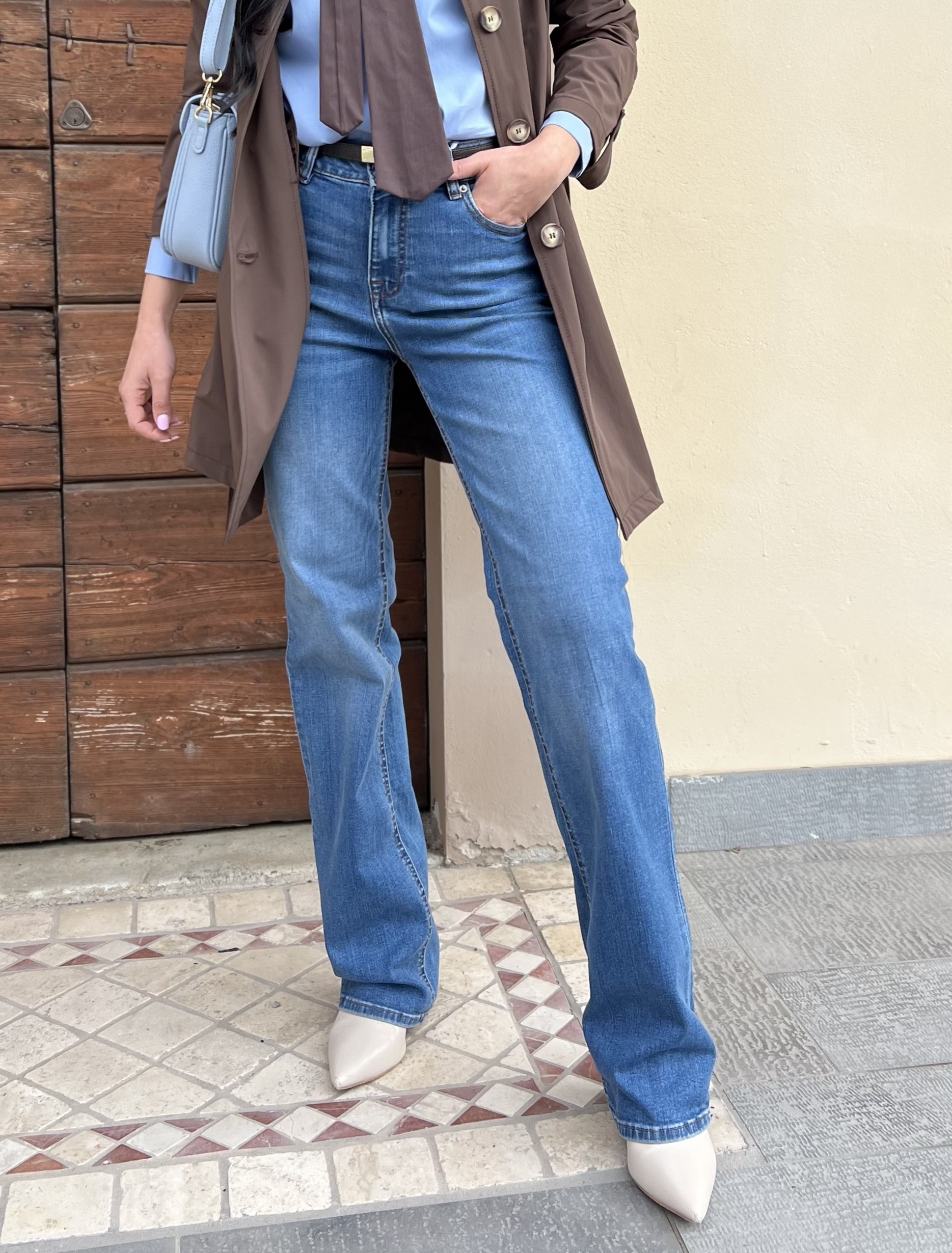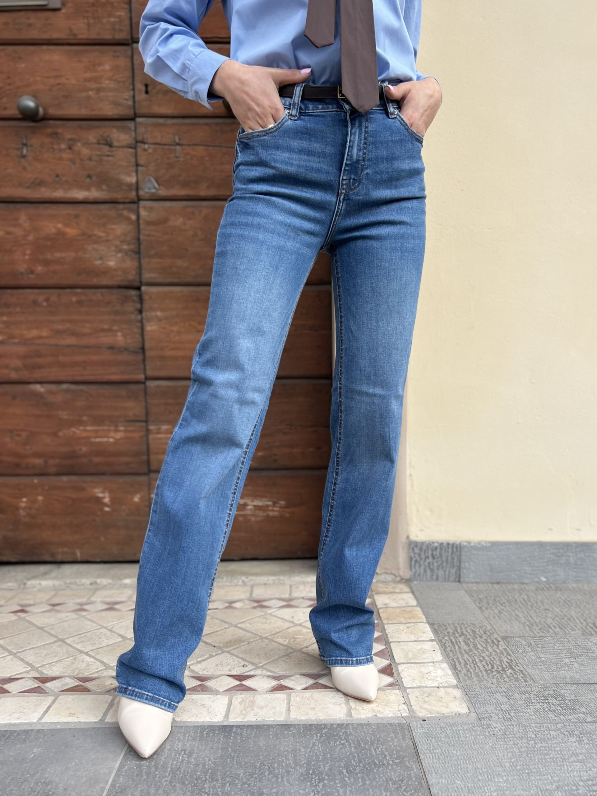 Denim a vita alta dalla tela elasticizzata e lavaggio medio. Modello dalla vestibilità regolare. Taglia americana, calcolare +14 per la taglia europea. Lunghezza dal cavallo alla caviglia 84 cm. Composizione: 87% cotone 11% poliestere 2% elastan.
