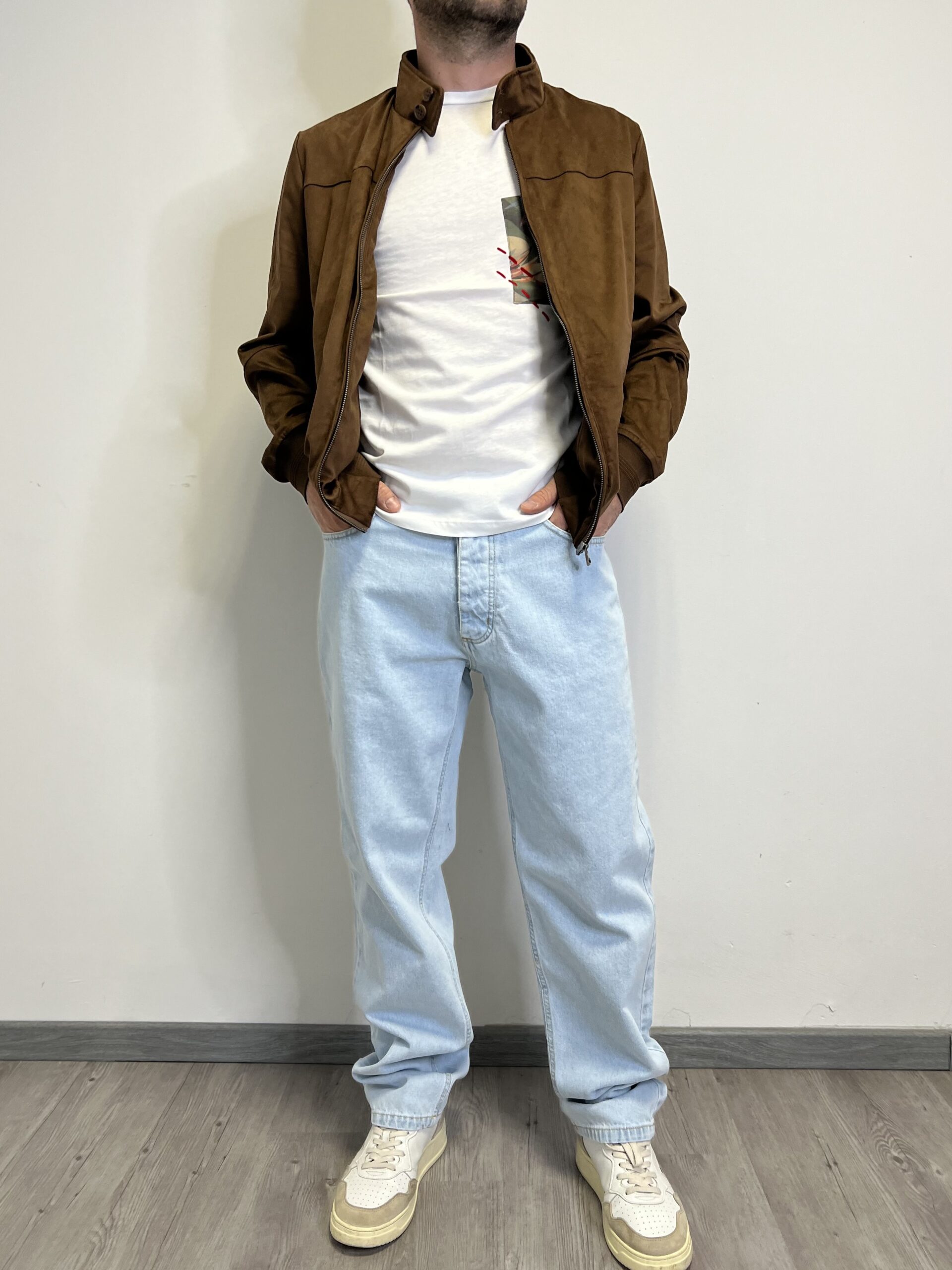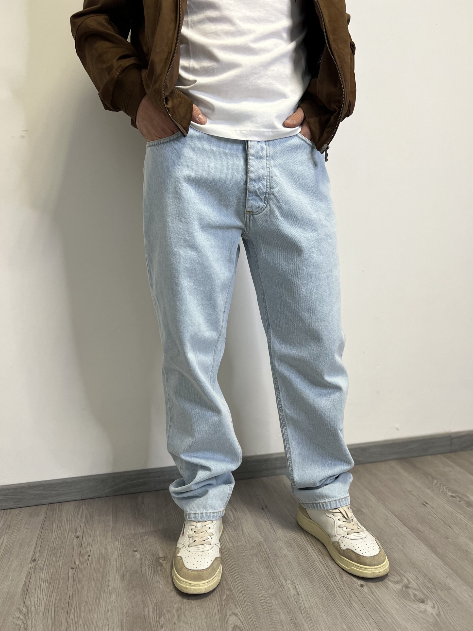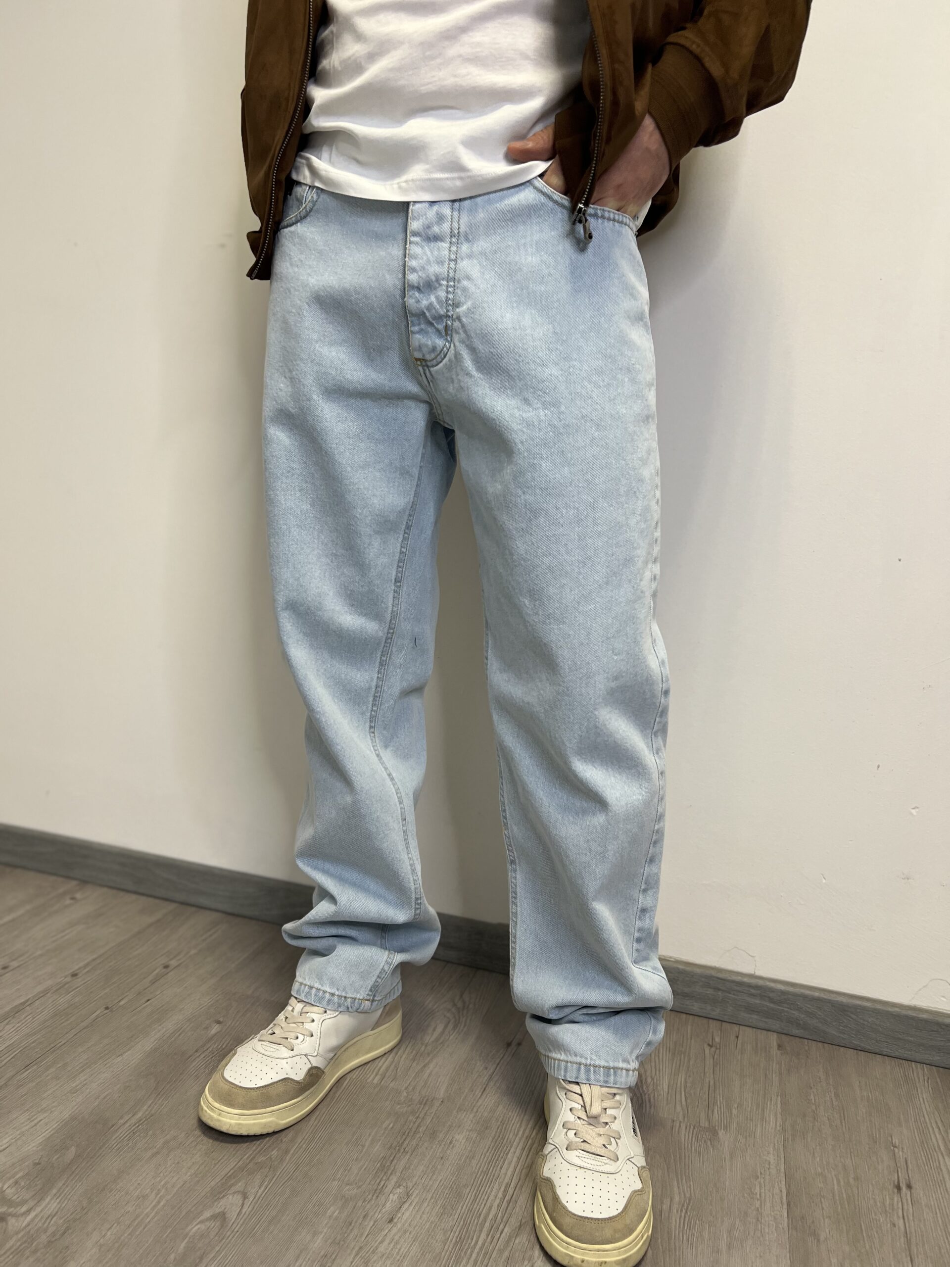 Denim dalla tela fissa con chiusura bottoni. Modello dal taglio ampio e dritto con classiche cinque-tasche.