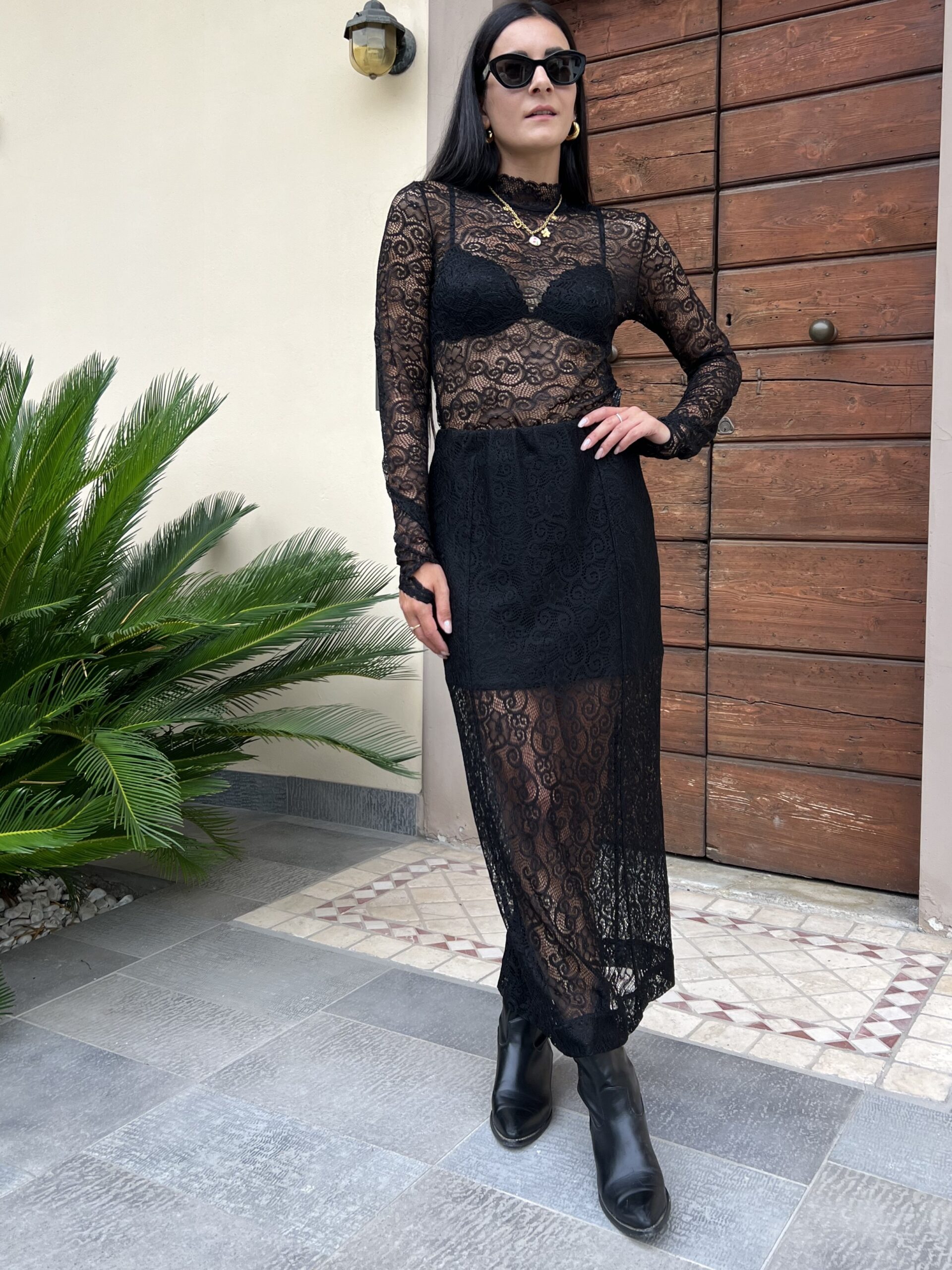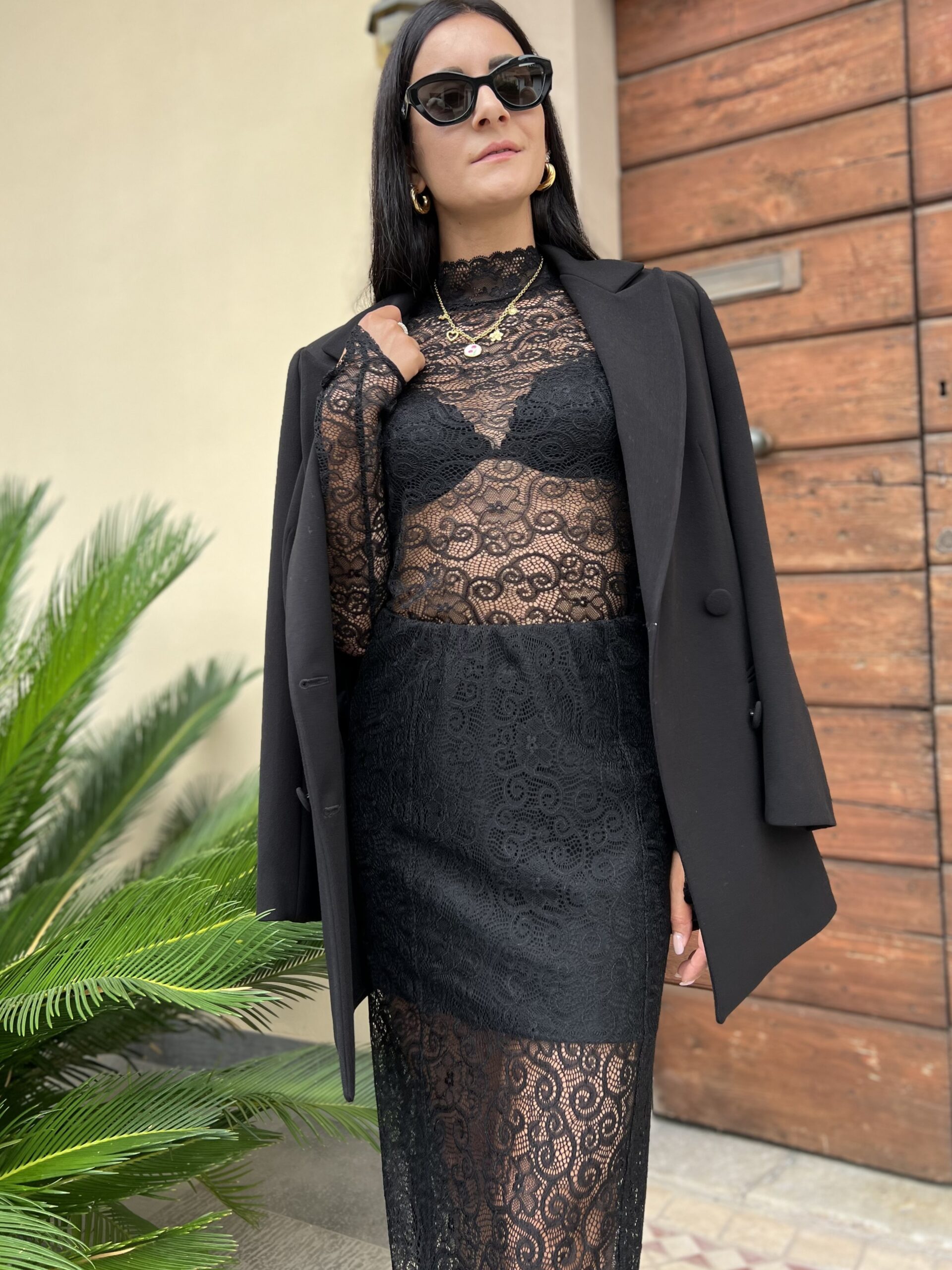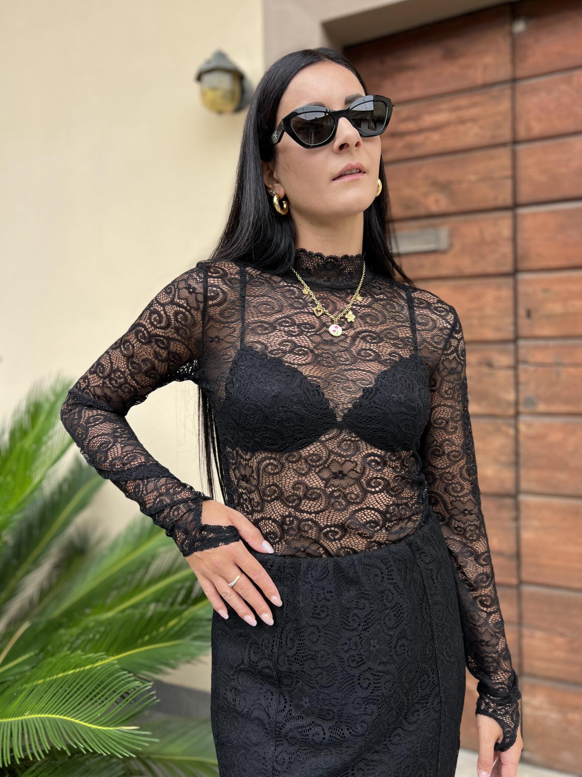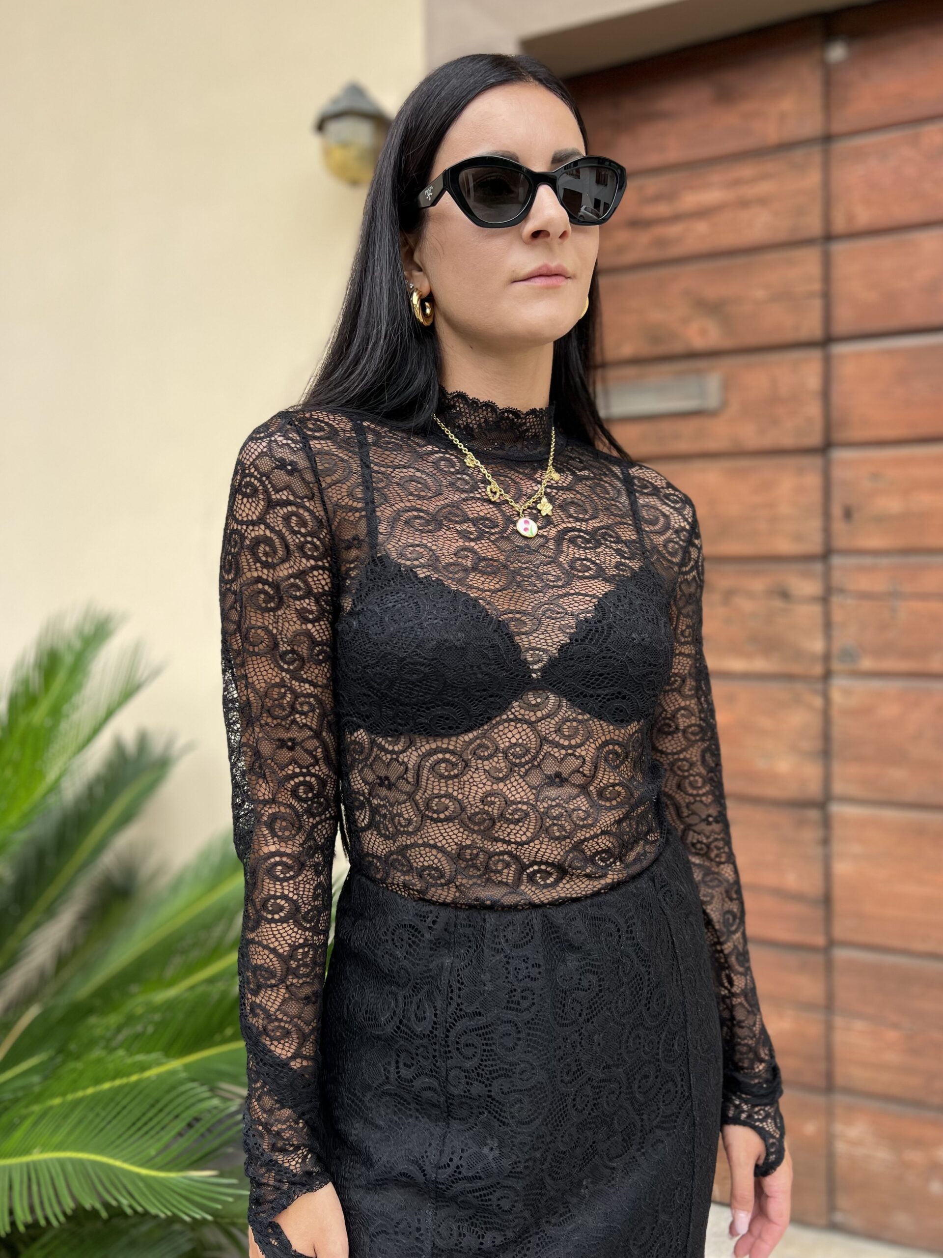 Maglia aderente in pizzo con collo alto, lunghezza fino al fianco. Vestibilità slim, pizzo leggermente elasticizzato, la M/L veste fino alla 44.