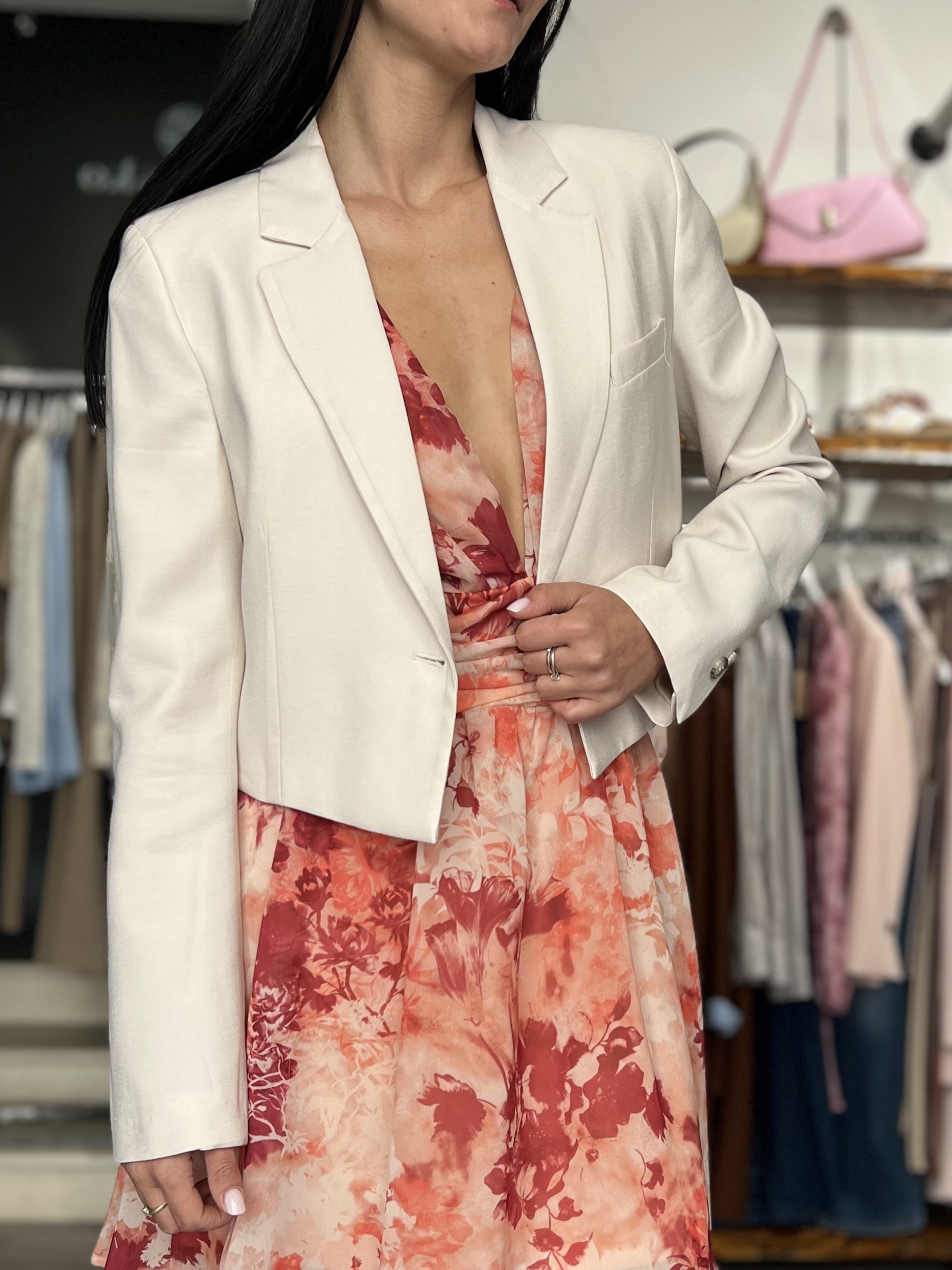 Giacca corta in viscosa, modello foderato doppiopetto con spallina leggermente costruita. Composizione 90% viscosa 10% pl , la taglia S veste 40/42 e M 44/46.