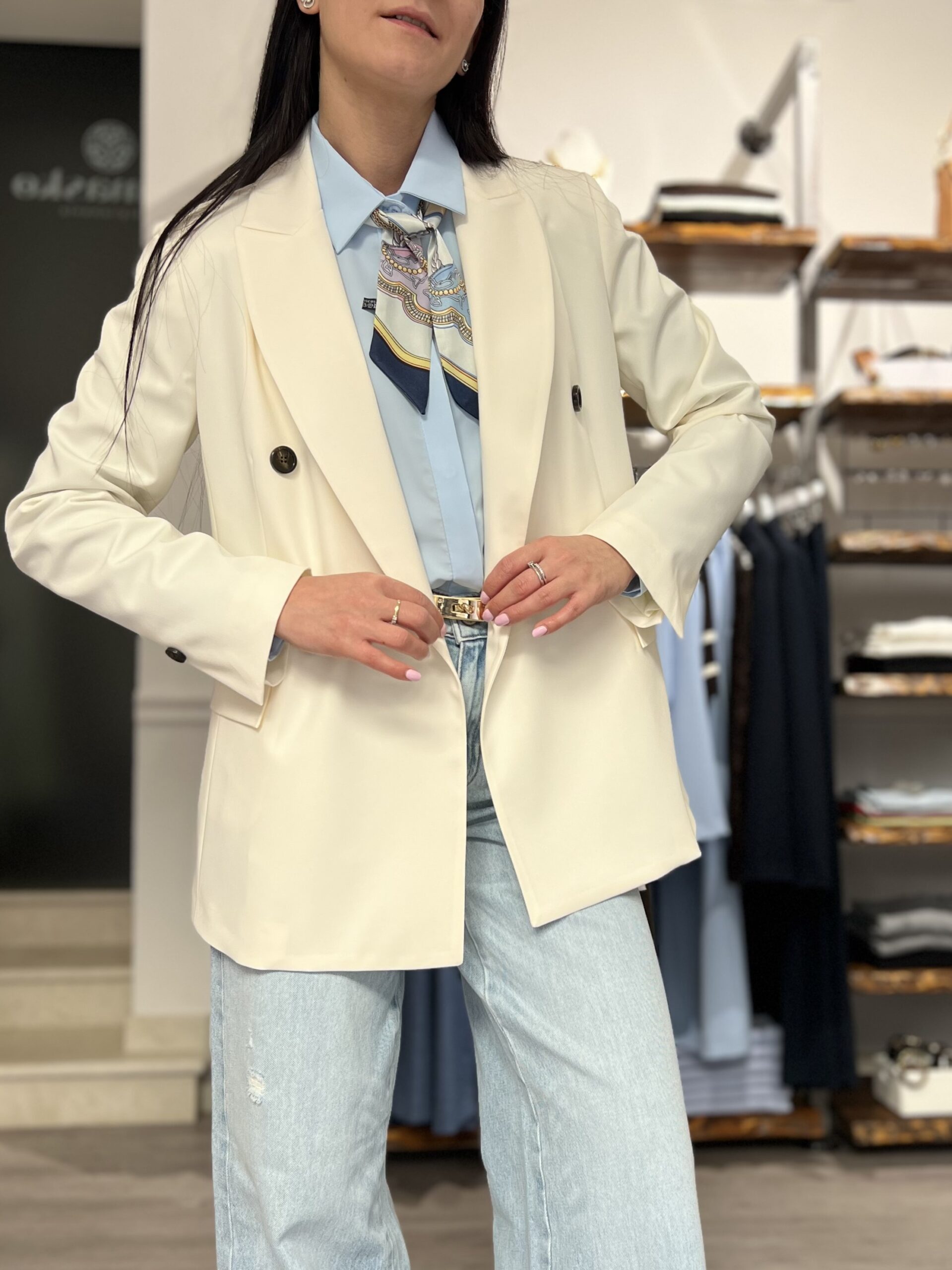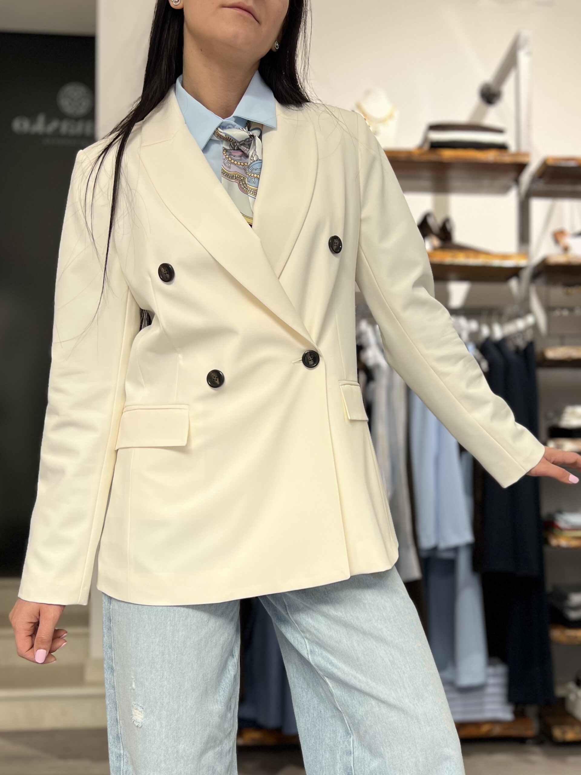 Giacca modello doppiopetto leggermente sfiancato in tessuto tecnico. Modello con bottoni a contrasto, revers classico e fodera interna. Composizione: 78% poliestere 18% viscosa 4% elastan.