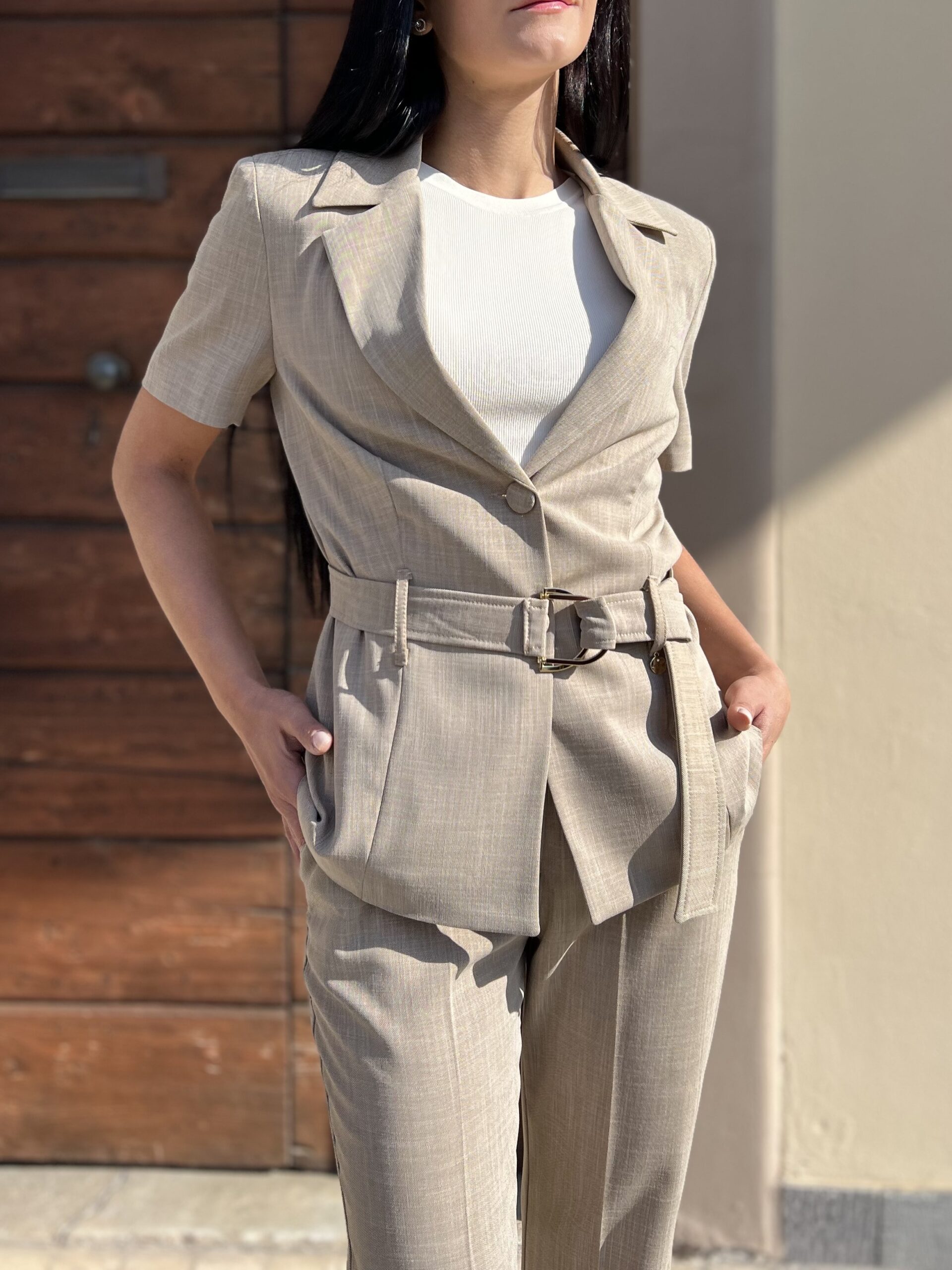 Giacca mezza manica foderata con cintura in vita. Modello in poli-viscosa, tessuto leggero effetto lino.