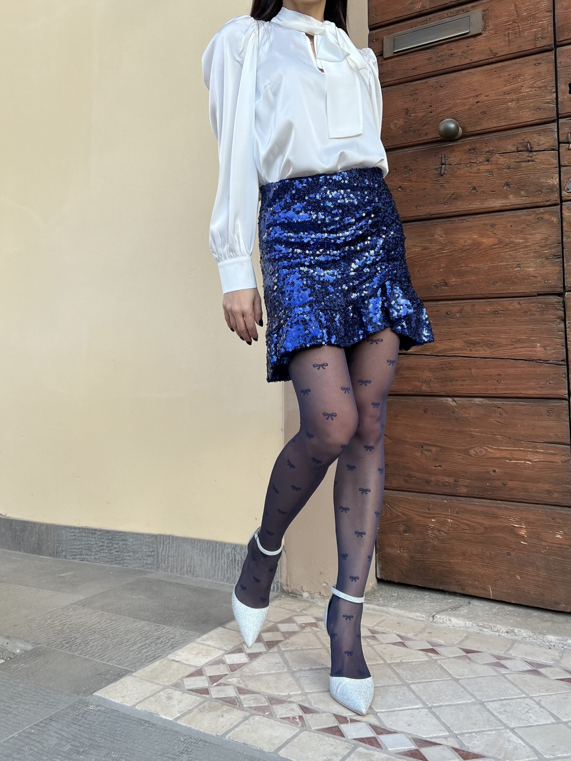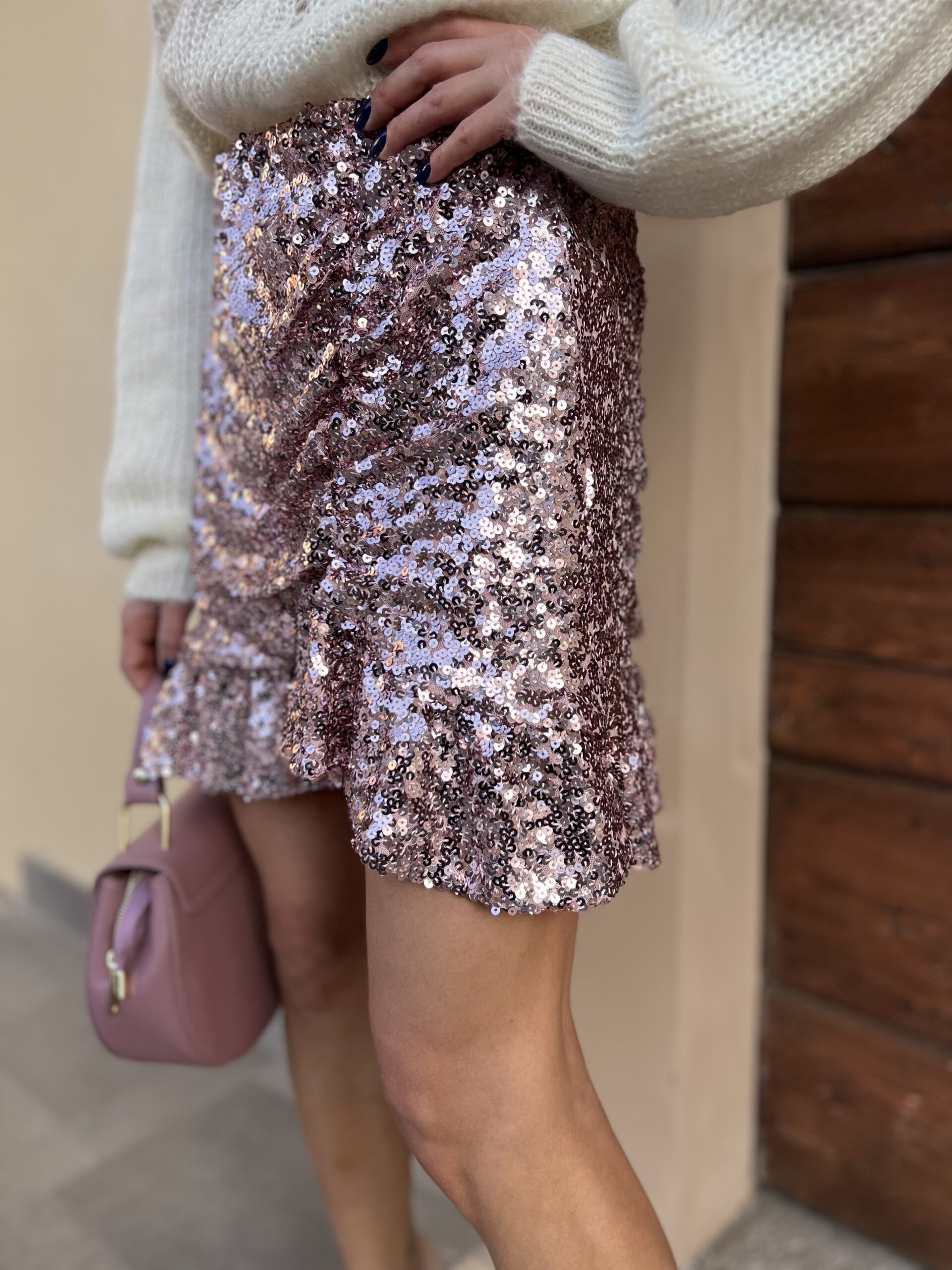 Minigonna paillettata, modello con elastico interno in vita, completamente foderata. Modello leggermente svasatoc on arricciatura e piccola balza sul fondo.