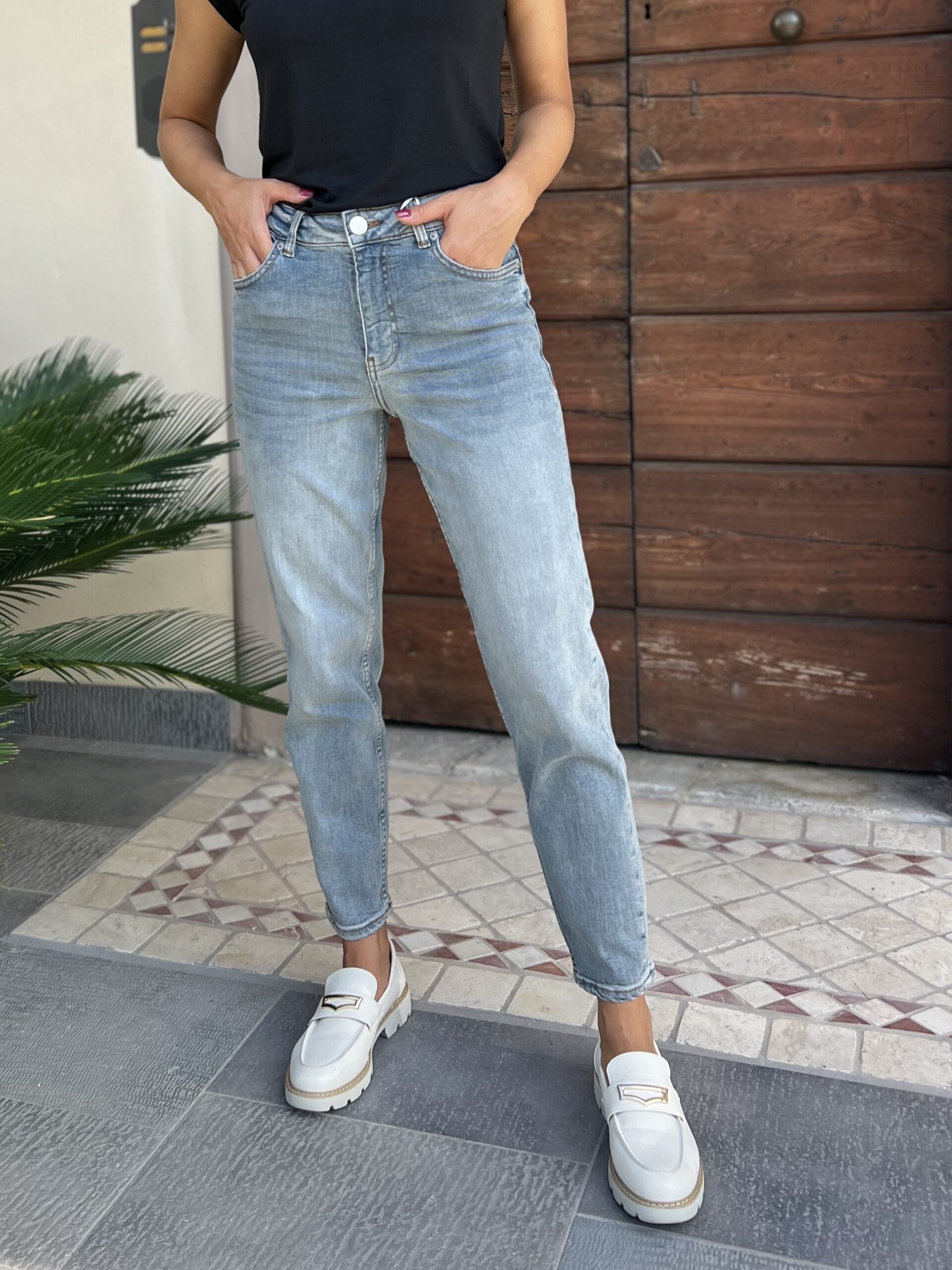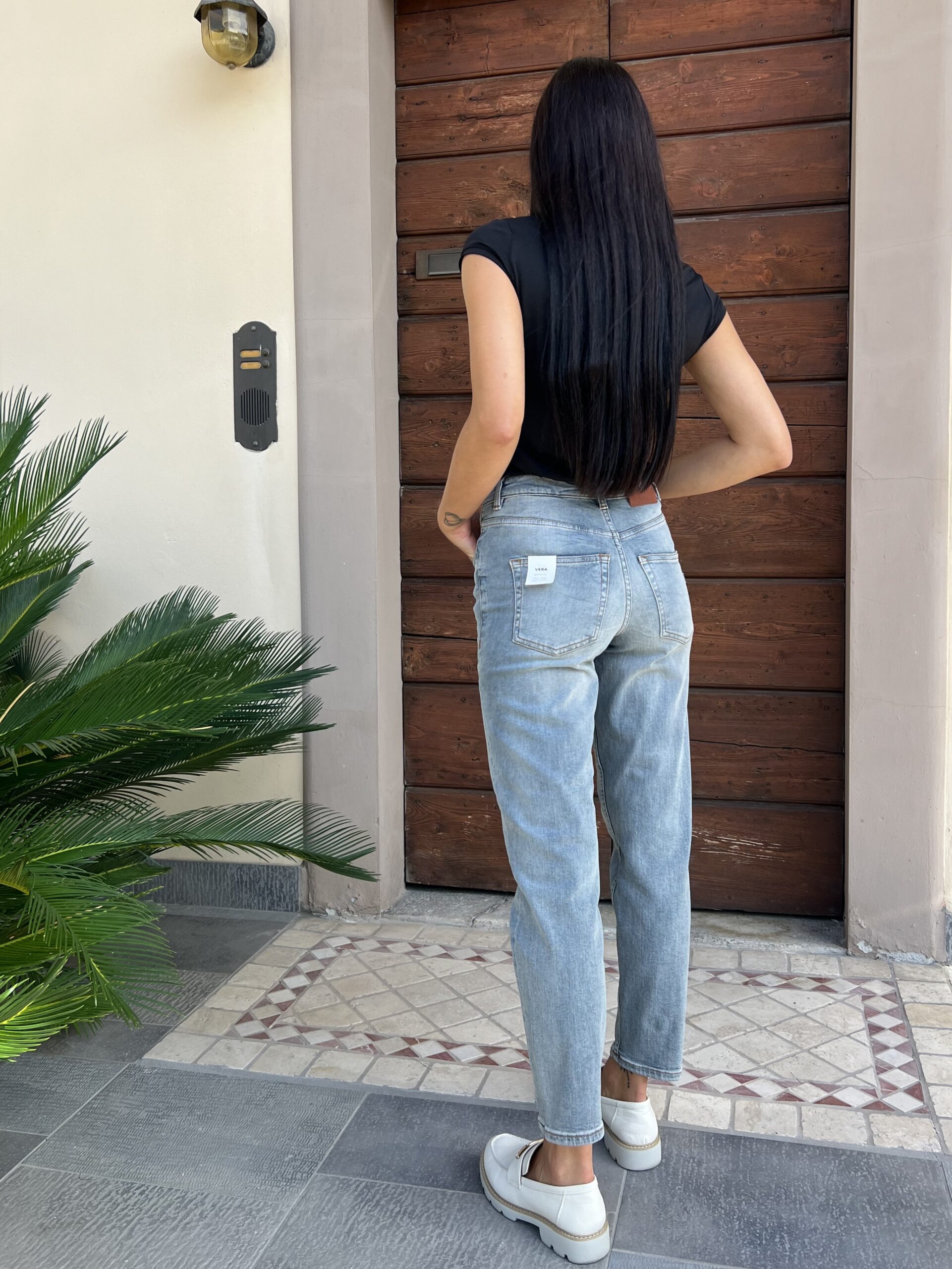 Denim dalla tela comoda e leggermente elasticizzata. Vita alta con classiche cinque tasche, zip e bottone. Modello mom fit slim. Taglia americana, per calcolare la classica taglia aggiungere 14. Quindi taglia 24 per la taglia 38, taglia 25 tra la nostra 38 e 40, taglia 26 per la 40 ecc… vestibilità perfetta garantita avendo anche la taglia di mezzo. Un centimetro di differenza tra una taglia e l’altra.
