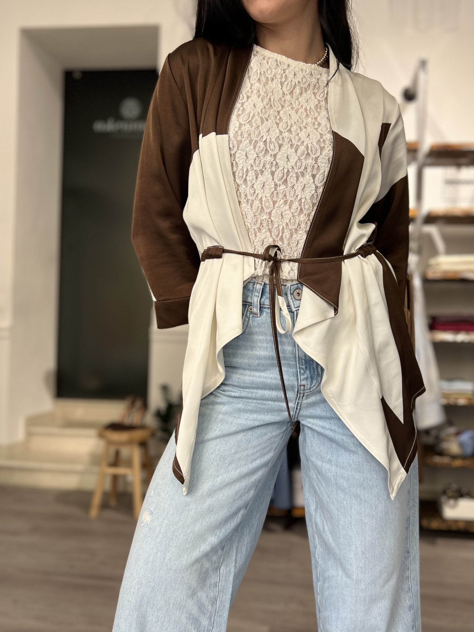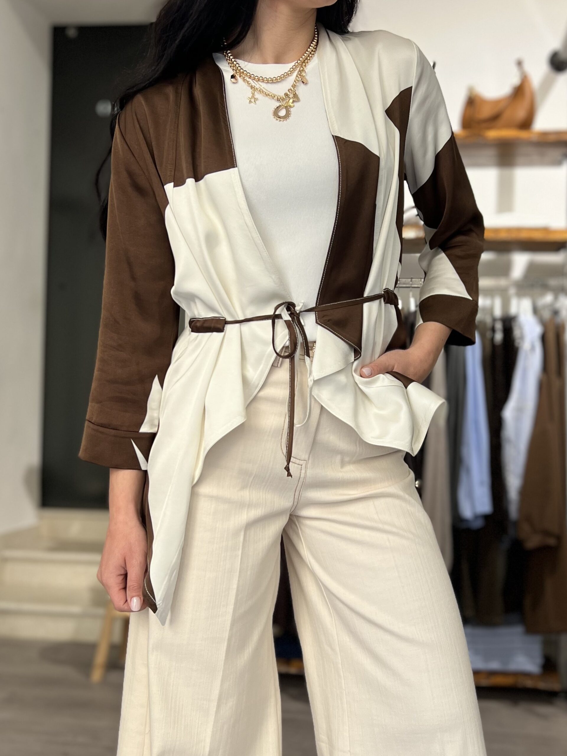 Kimono in raso di viscosa con manica ampia a 3/4 e coulisse per poterlo stringere. Taglia S per 38/42 e M per 44/46.