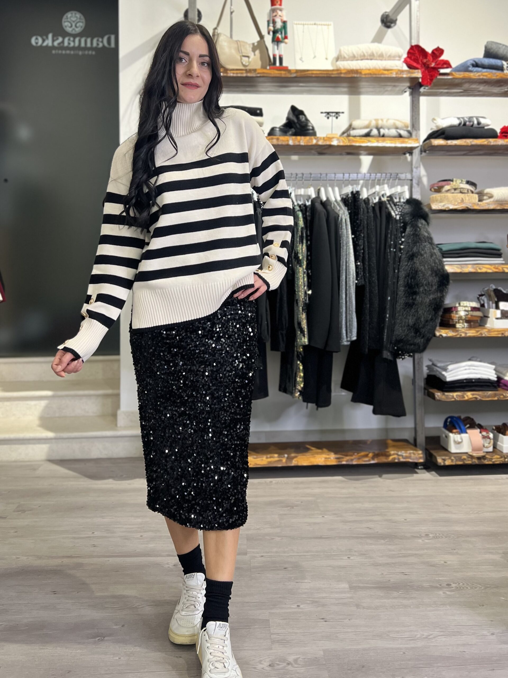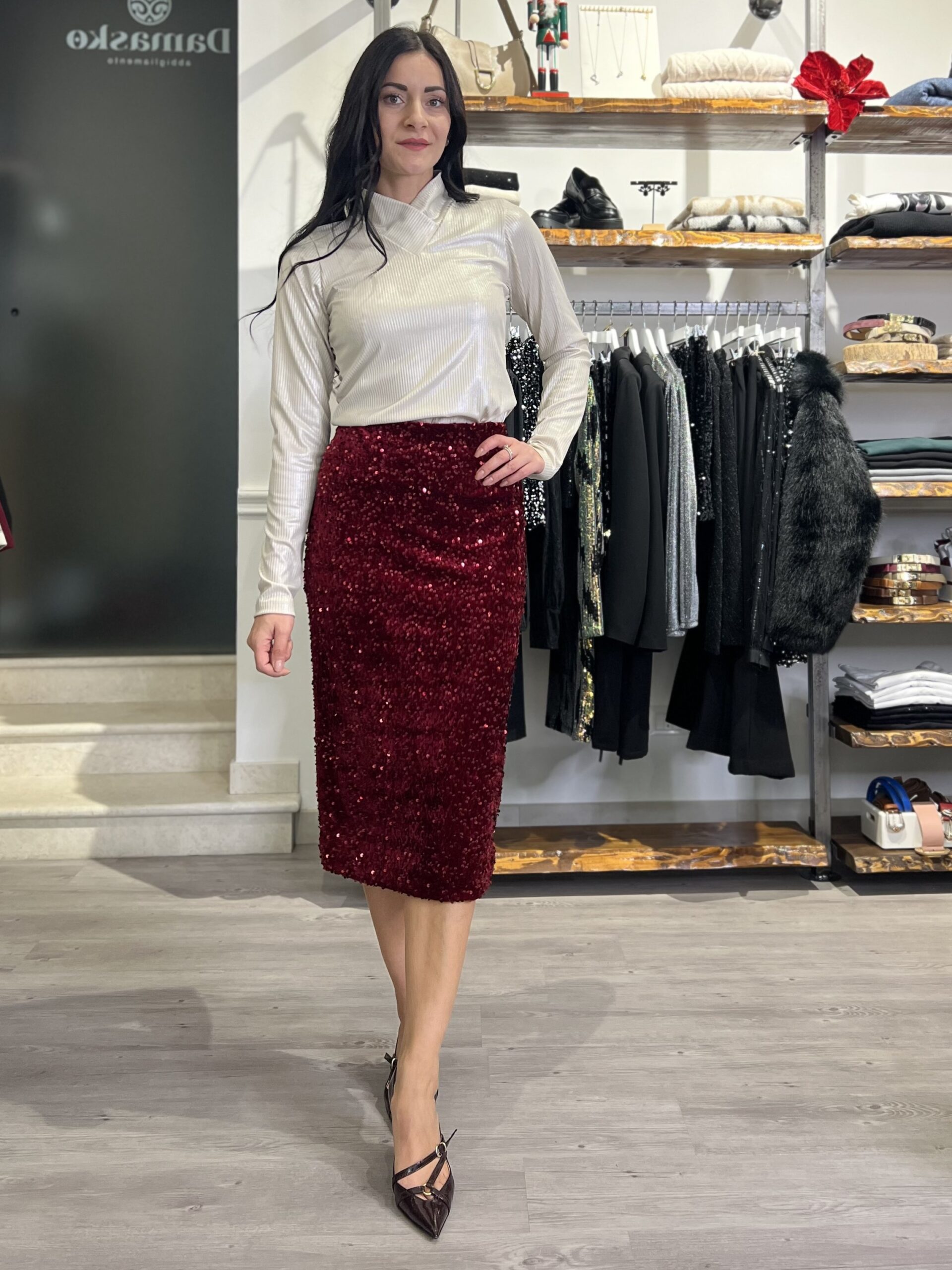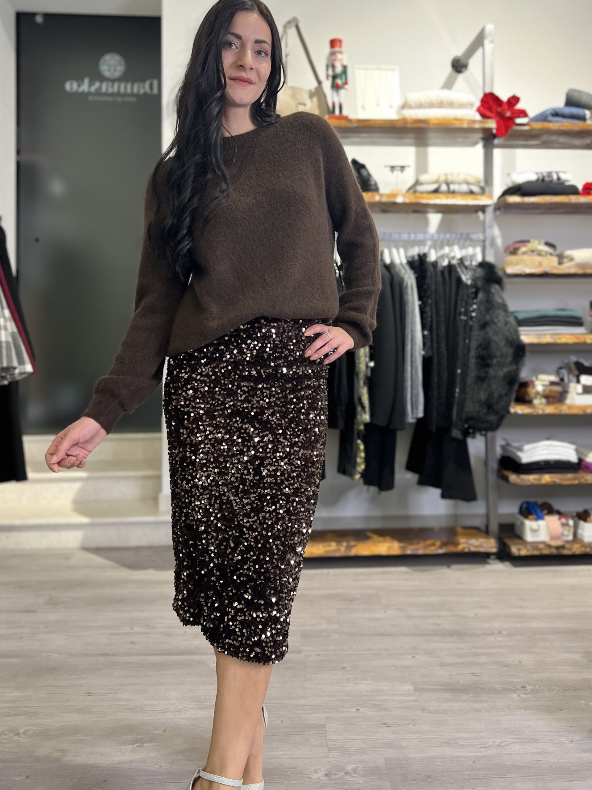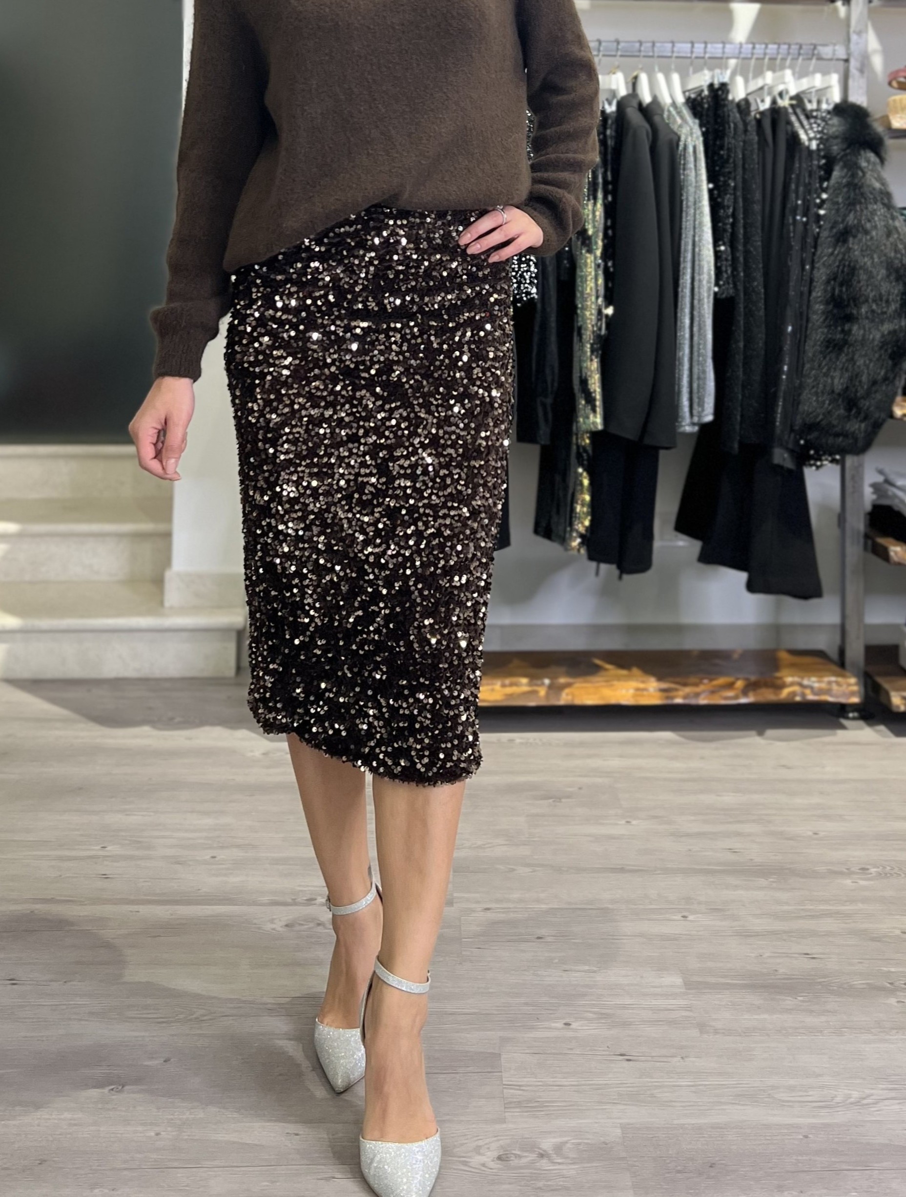 Longuette con elastico in vita, modello in velluto con paillettes applicate. Taglia S per 40/42 e M per 44/46.
