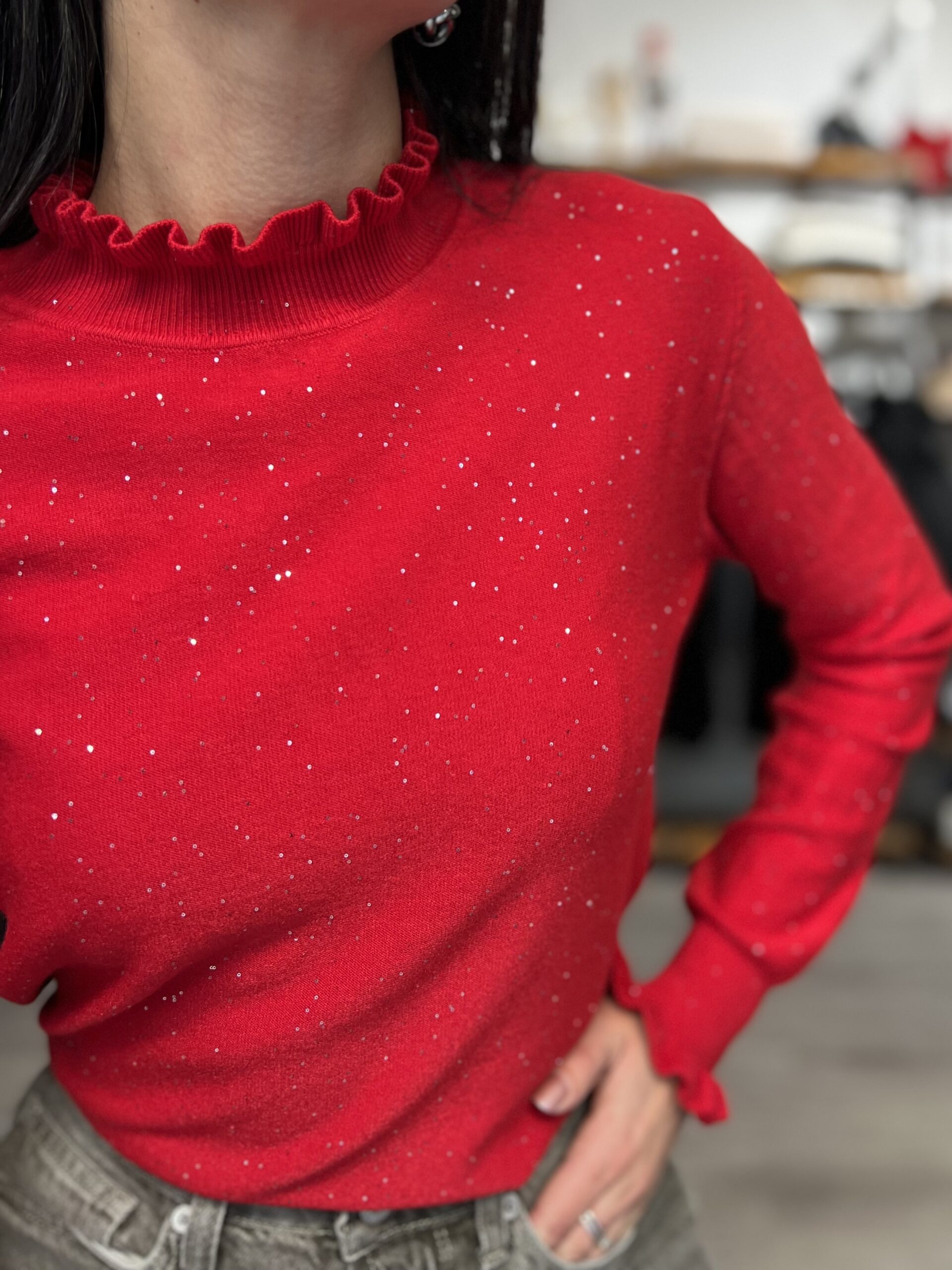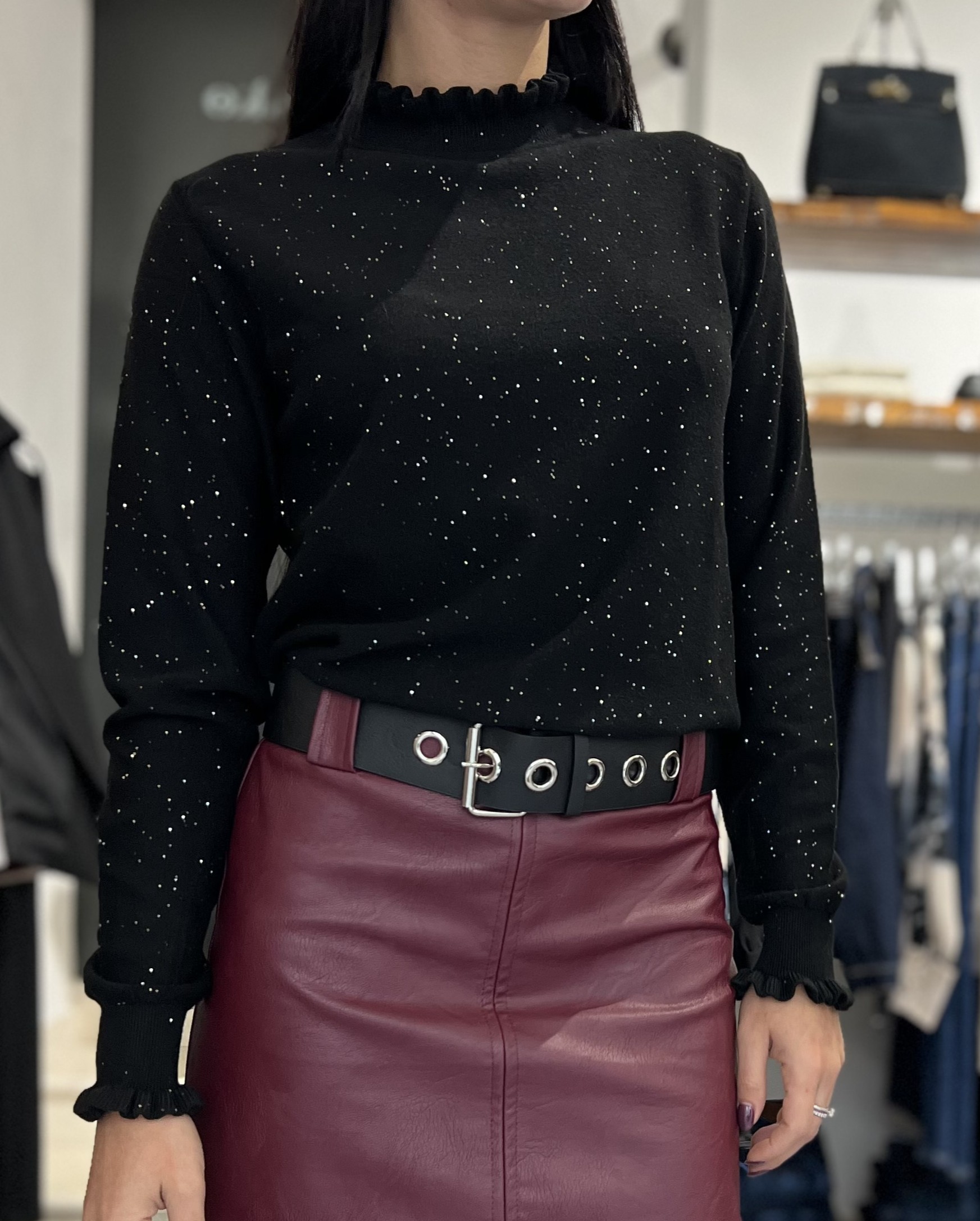 Maglioncino in viscosa, modello con micro-paillettes applicate e dettaglio rouches su collo e polsino. Pochissima differenza tra la taglia S e la taglia M, vestibilità fino alla 46.