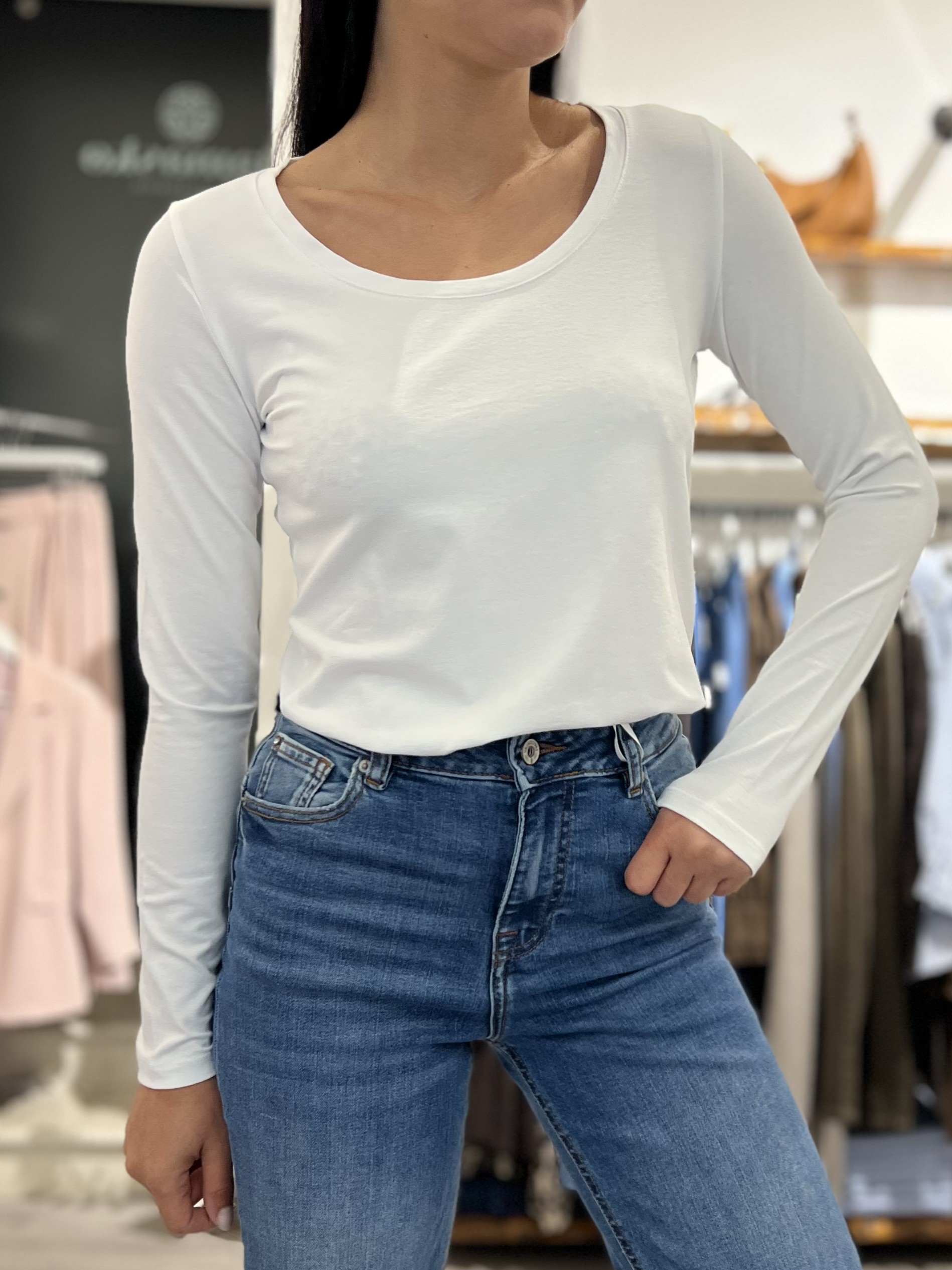 Maglia in viscosa elasticizzata, modello slim con collo a giro ampio, lunghezza fino al fianco. Taglia unica veste fino alla M.