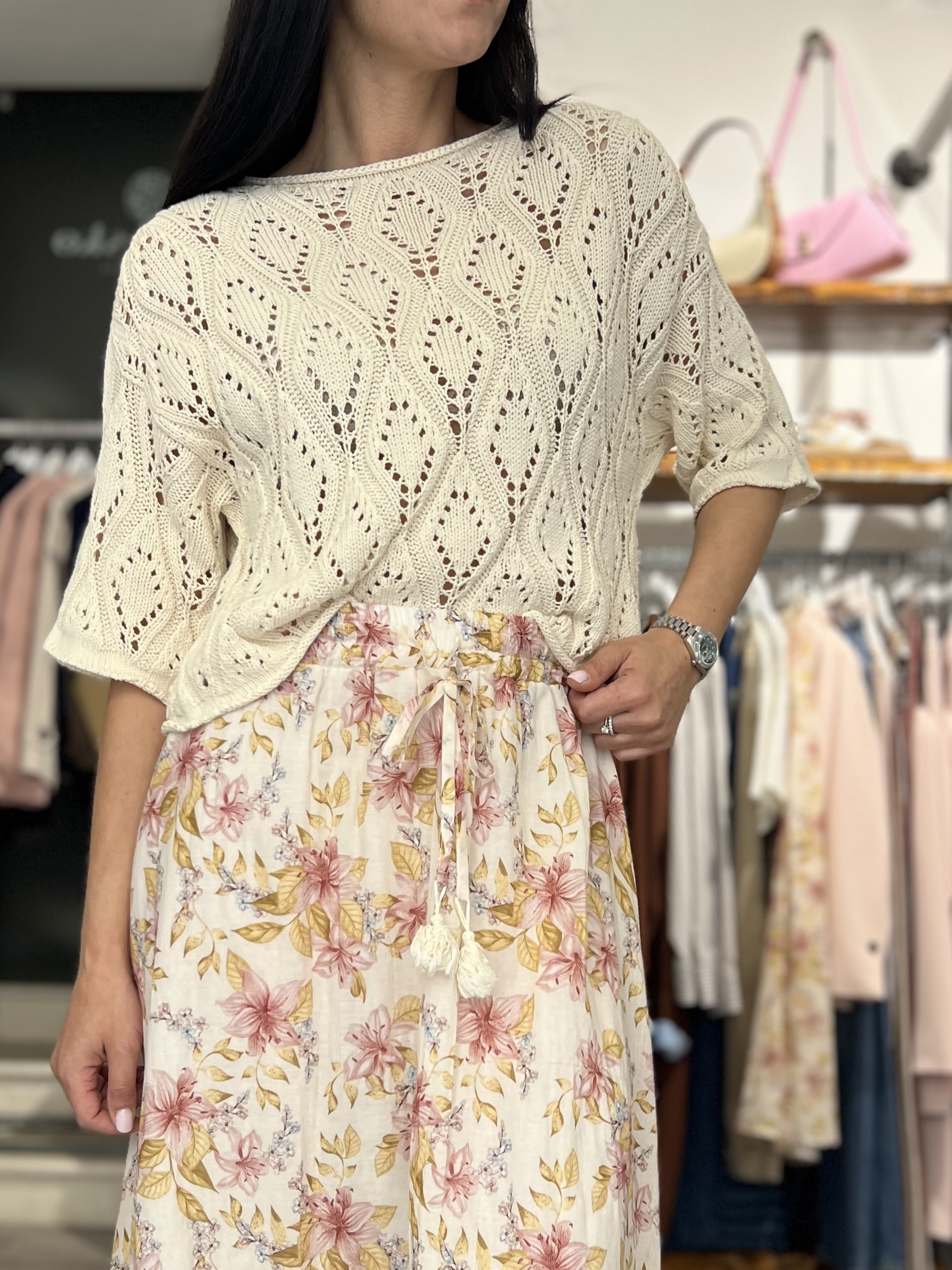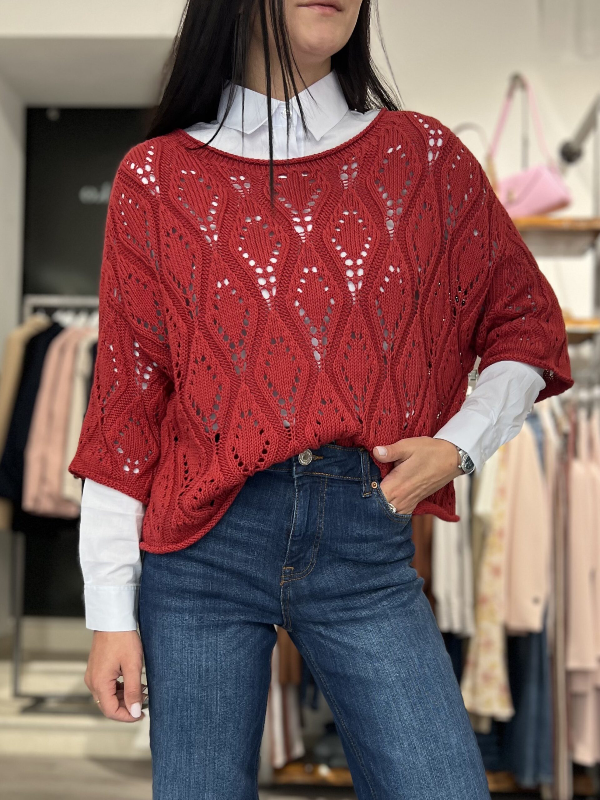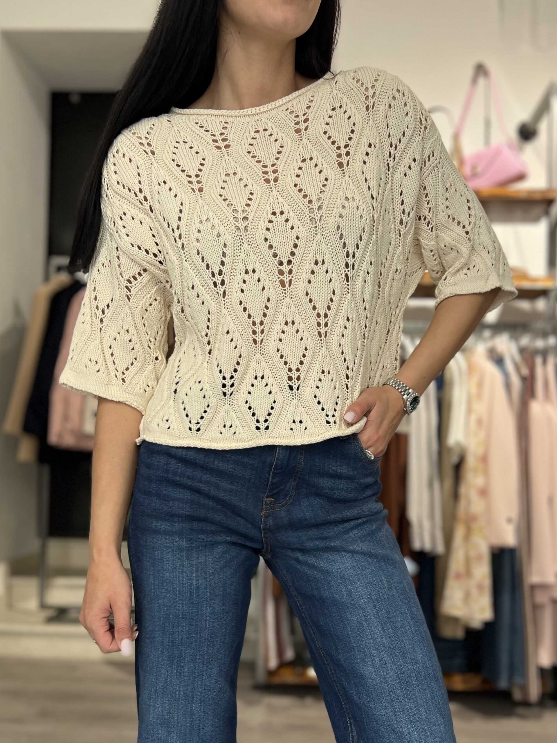 Maglia a scatola in 100% cotone. Modello traforato con manica ampia, la taglia M/L veste fino alla 46/48.
