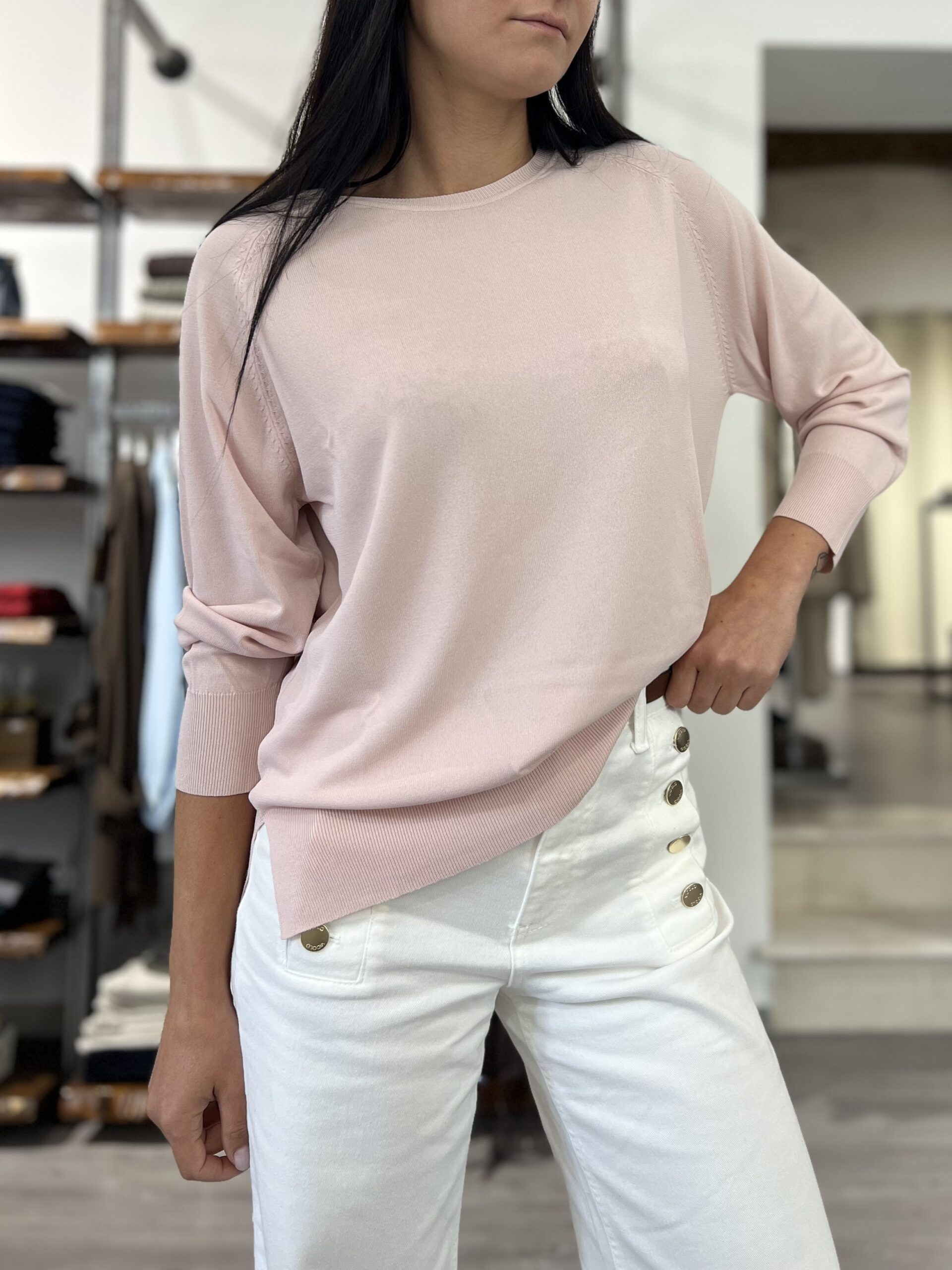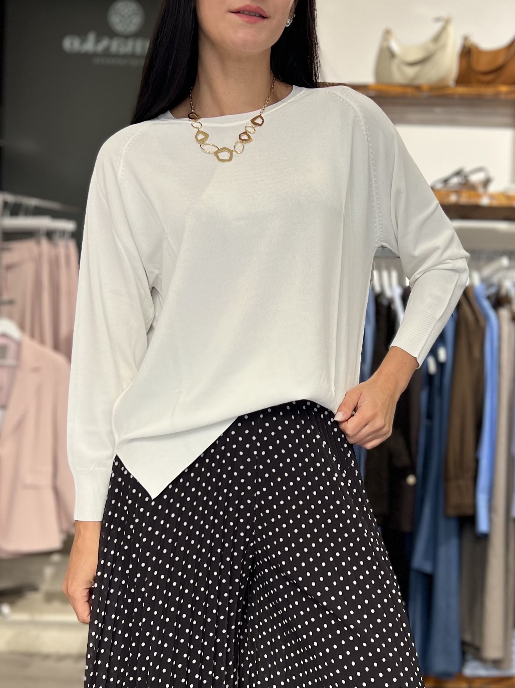 Maglia in viscosa leggerissima, modello ampio con collo a giro, lunghezza fino al fianco e spacco laterale. Taglia unica veste fino alla L.