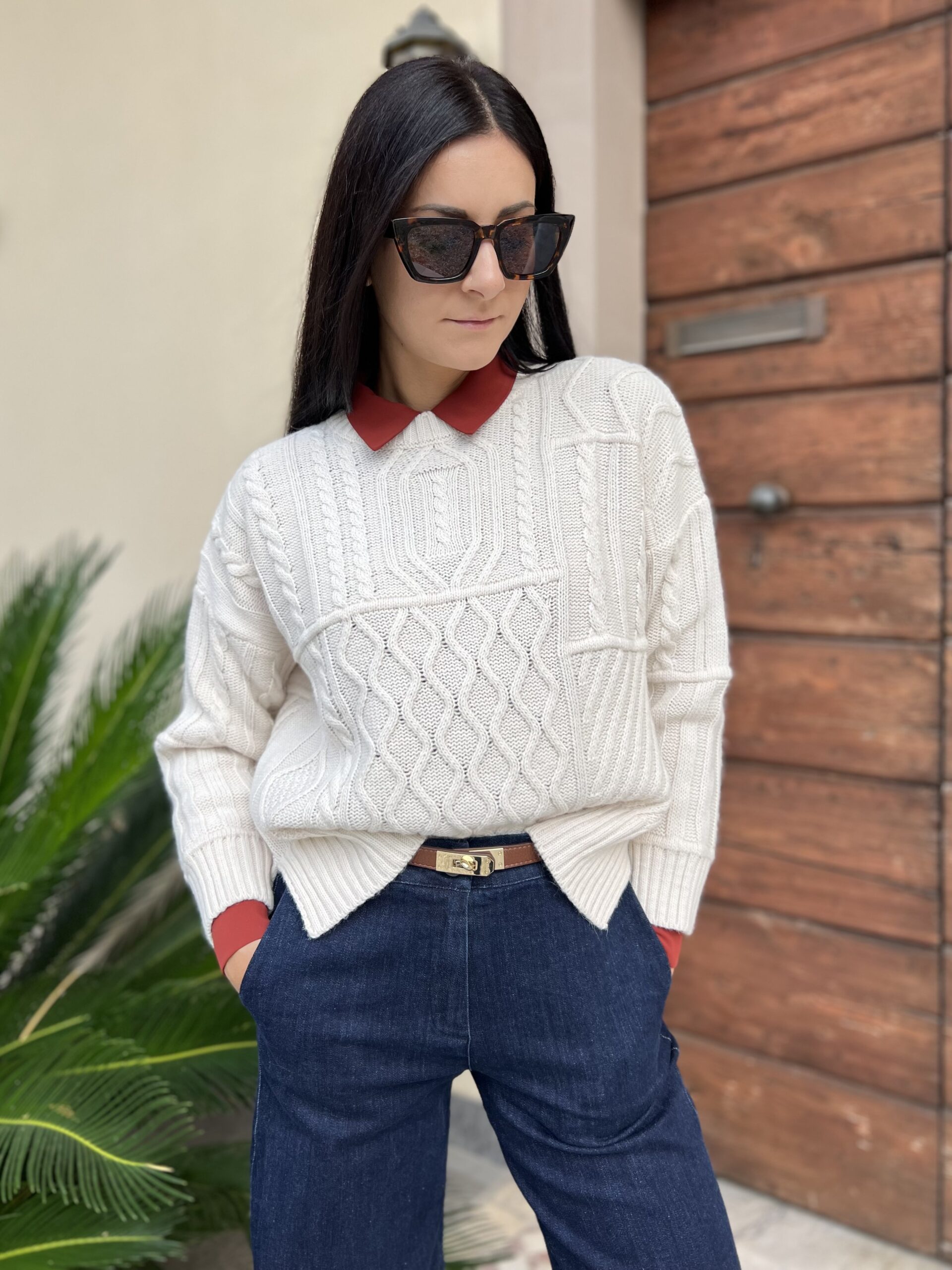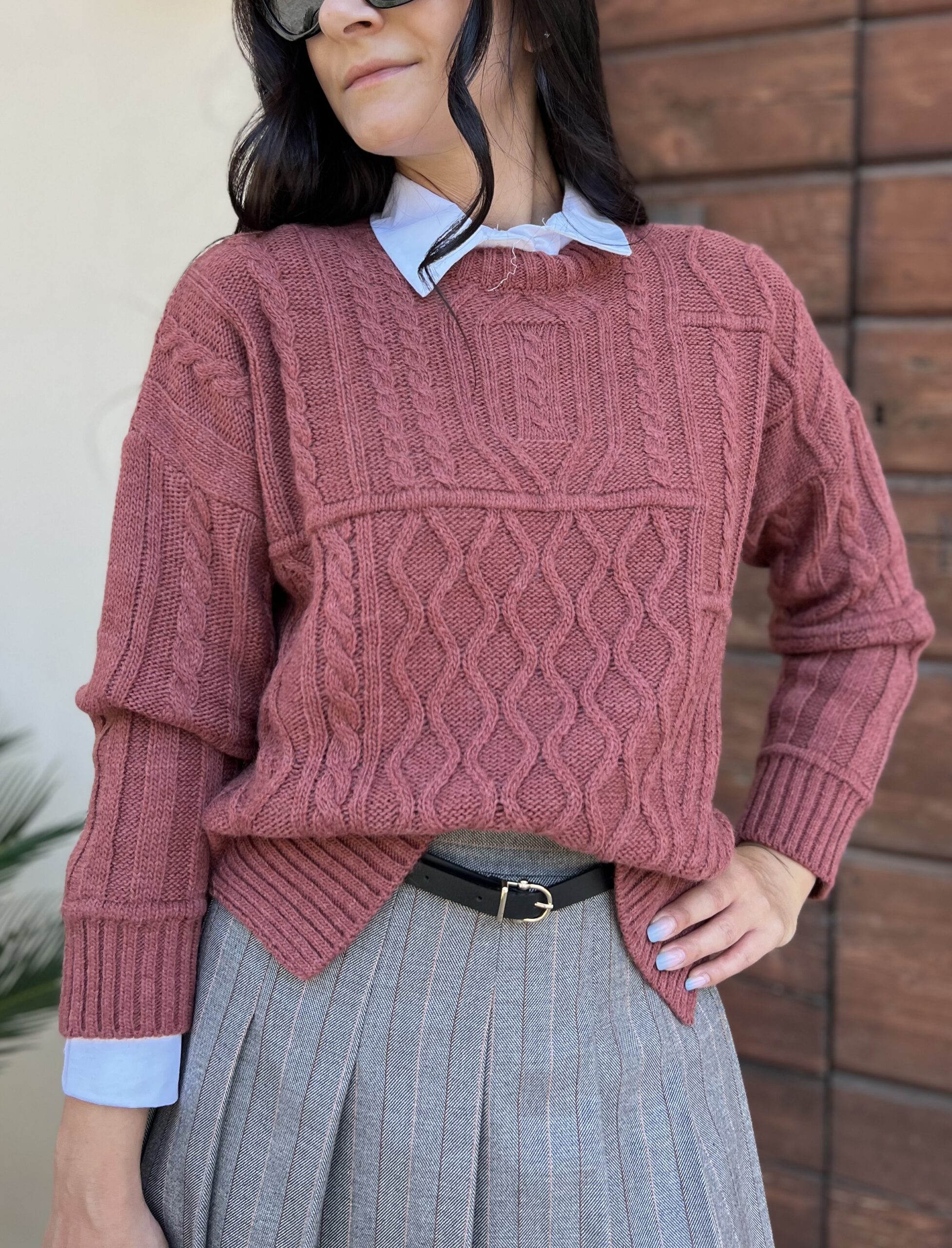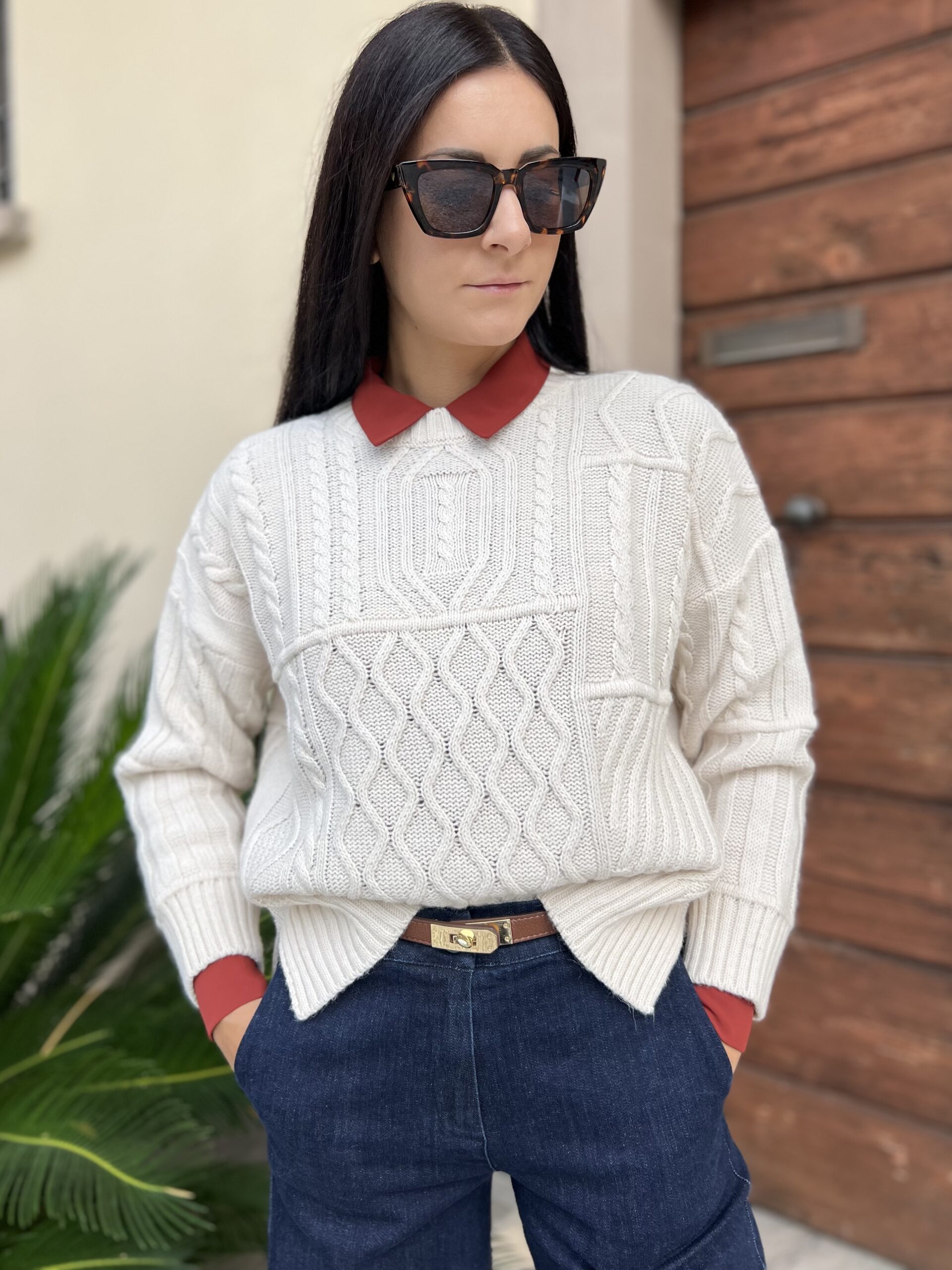 Maglione girocollo in misto lana e alpaca, modello con trecce e losanghe, linea morbida con spacchi laterali.