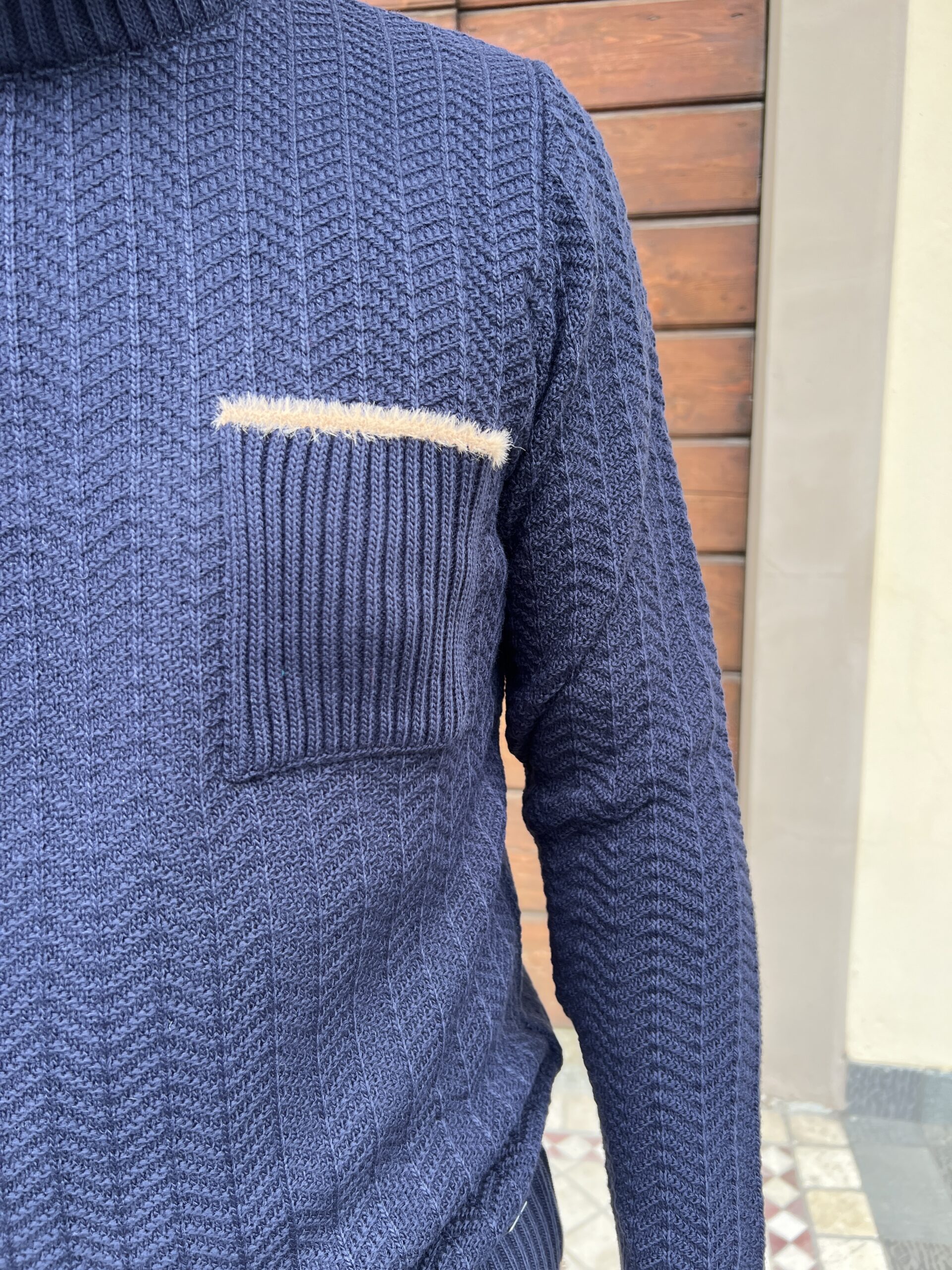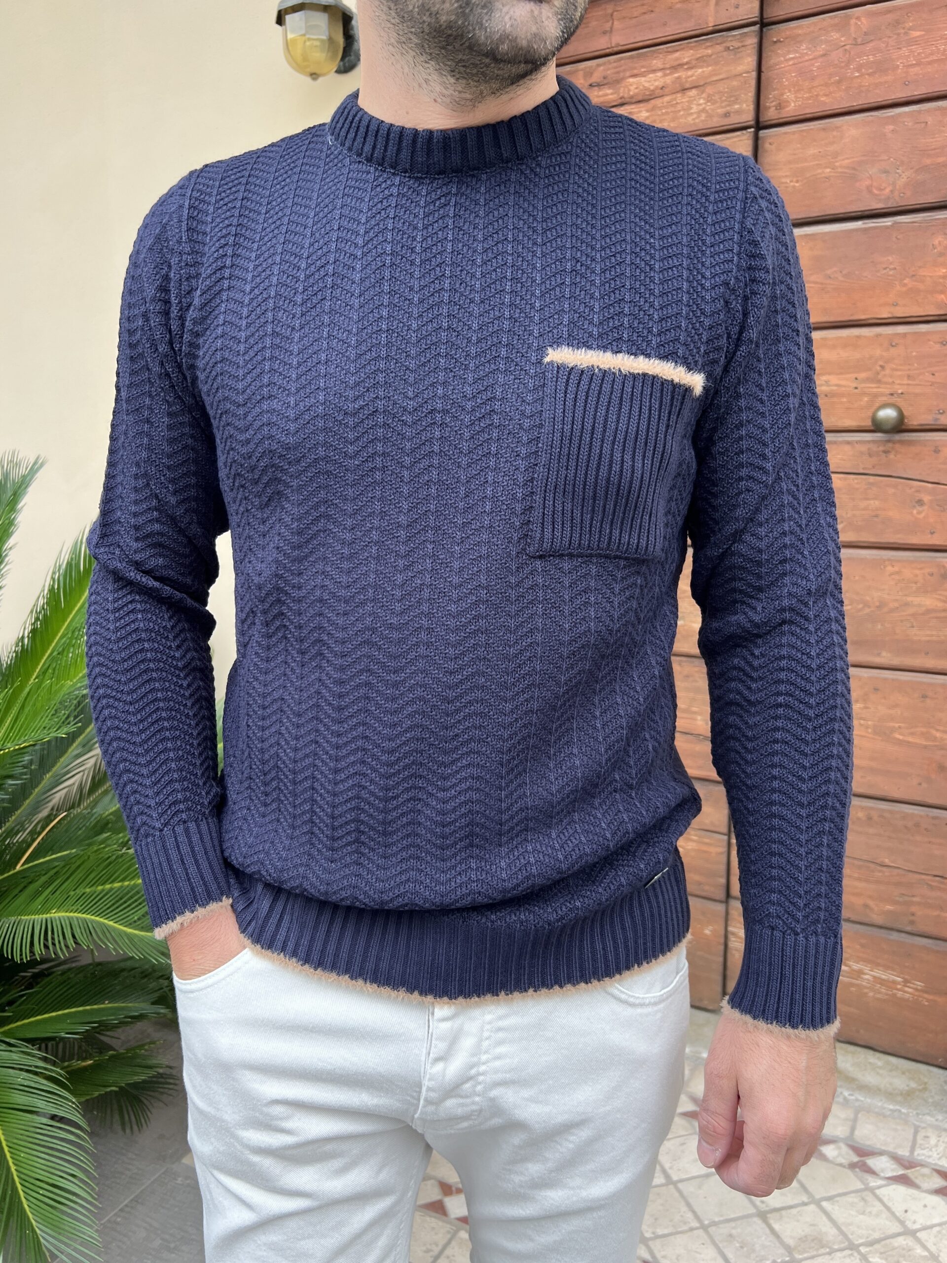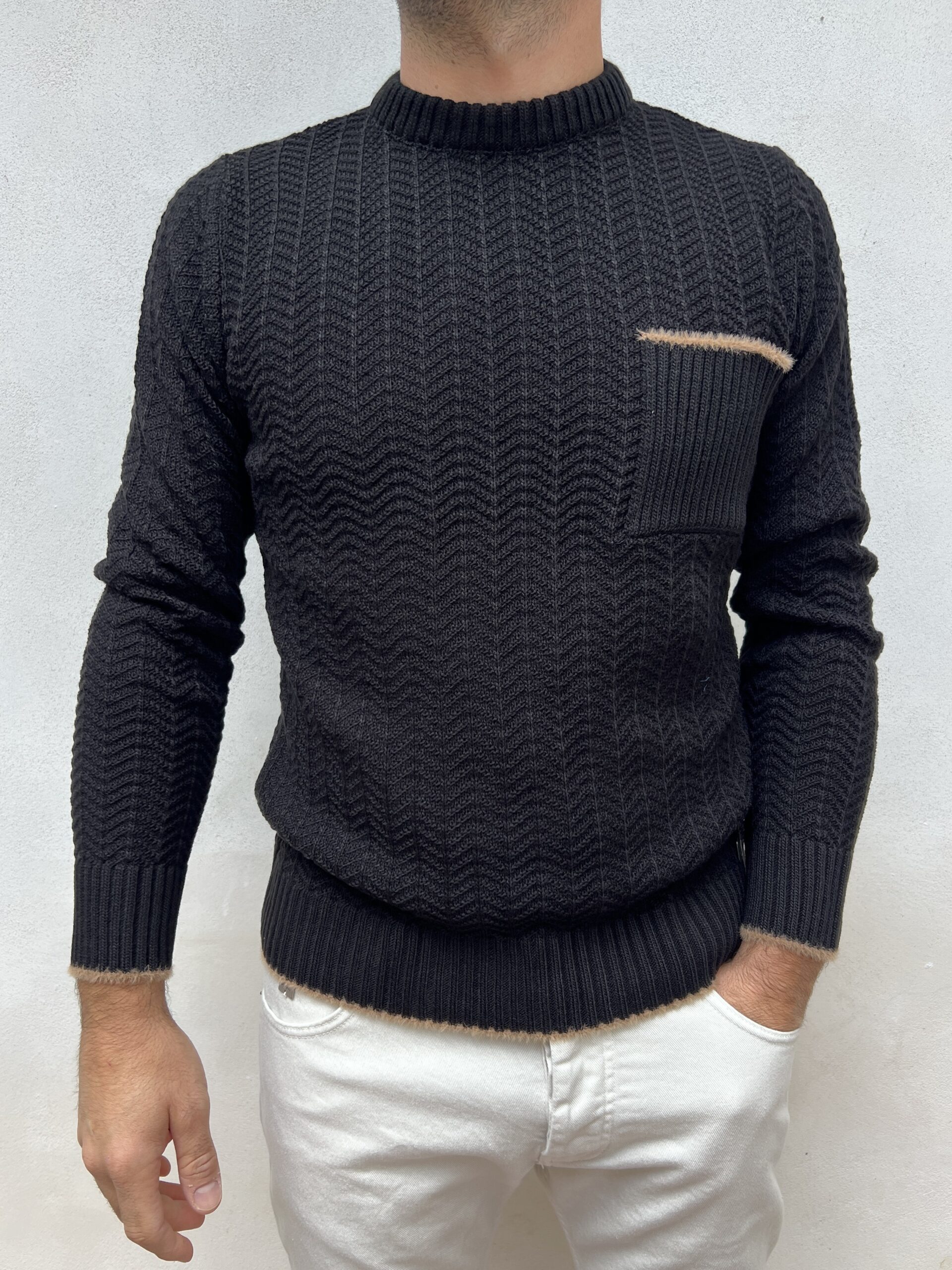 Maglione girocollo lavorato, modello con dettaglio profilo taschino e polsino a contrasto.