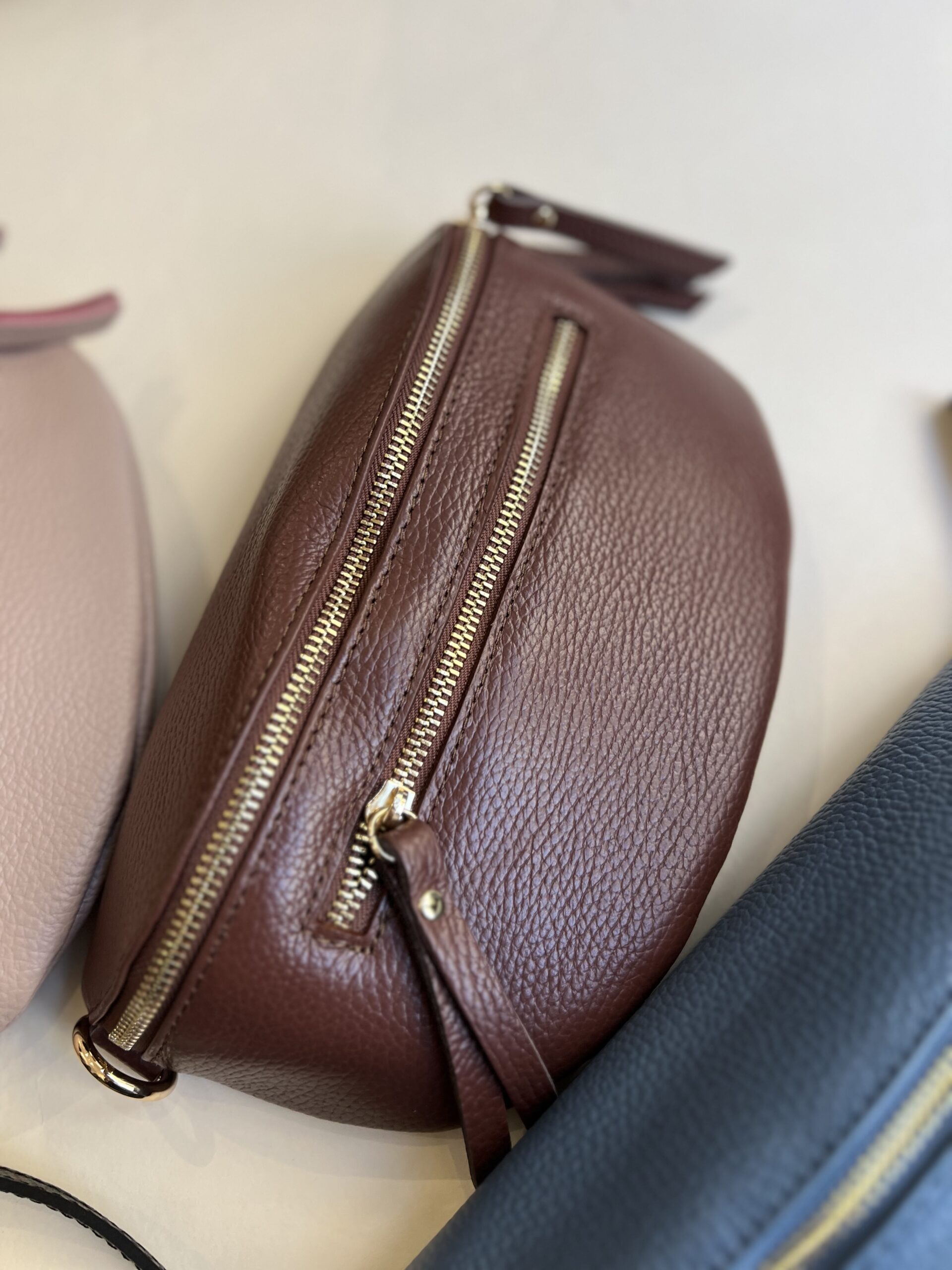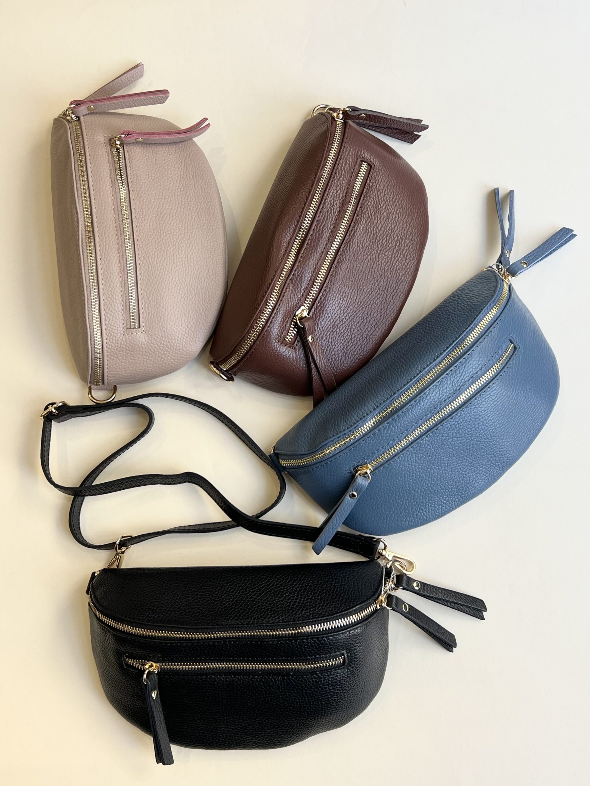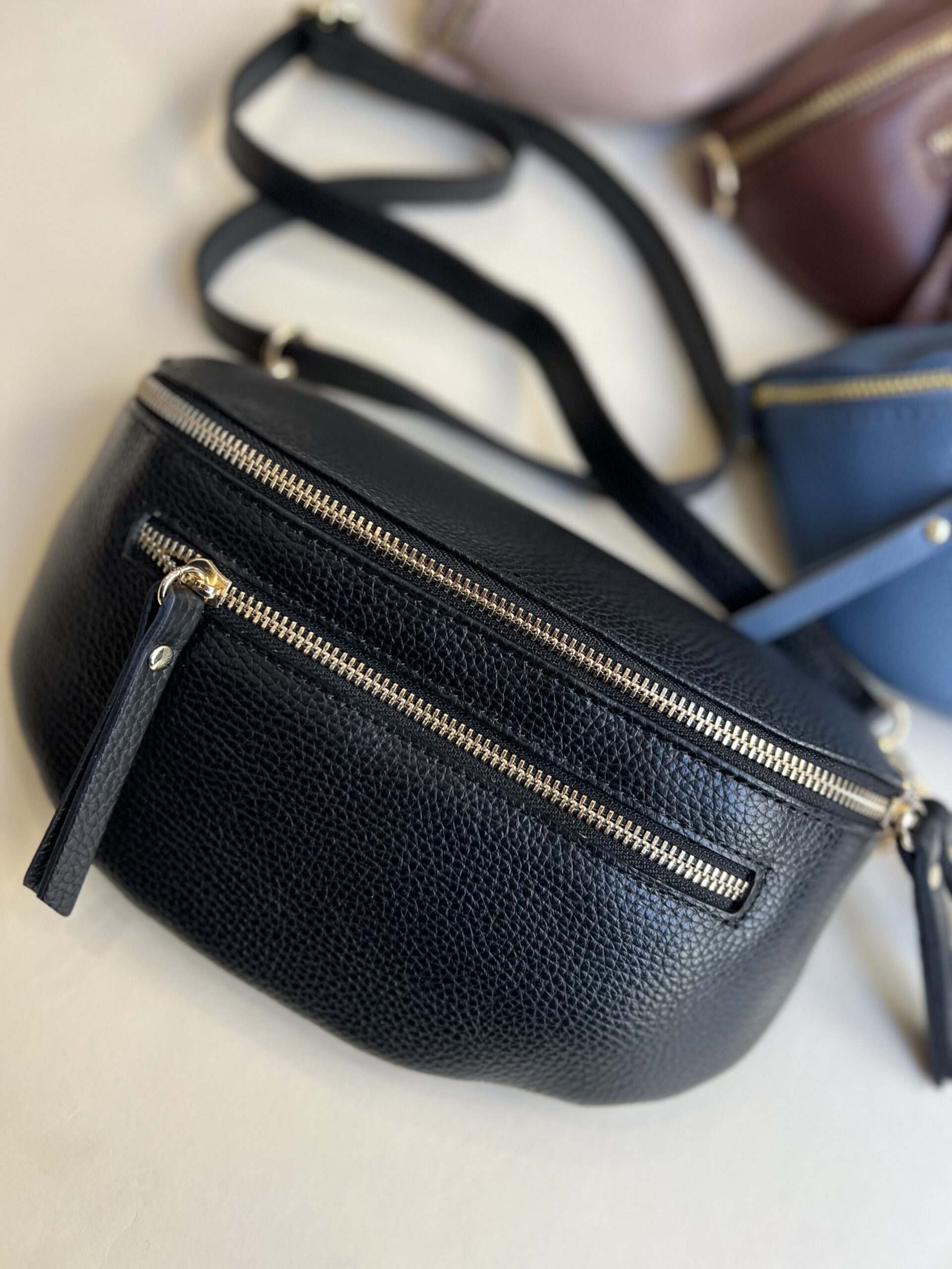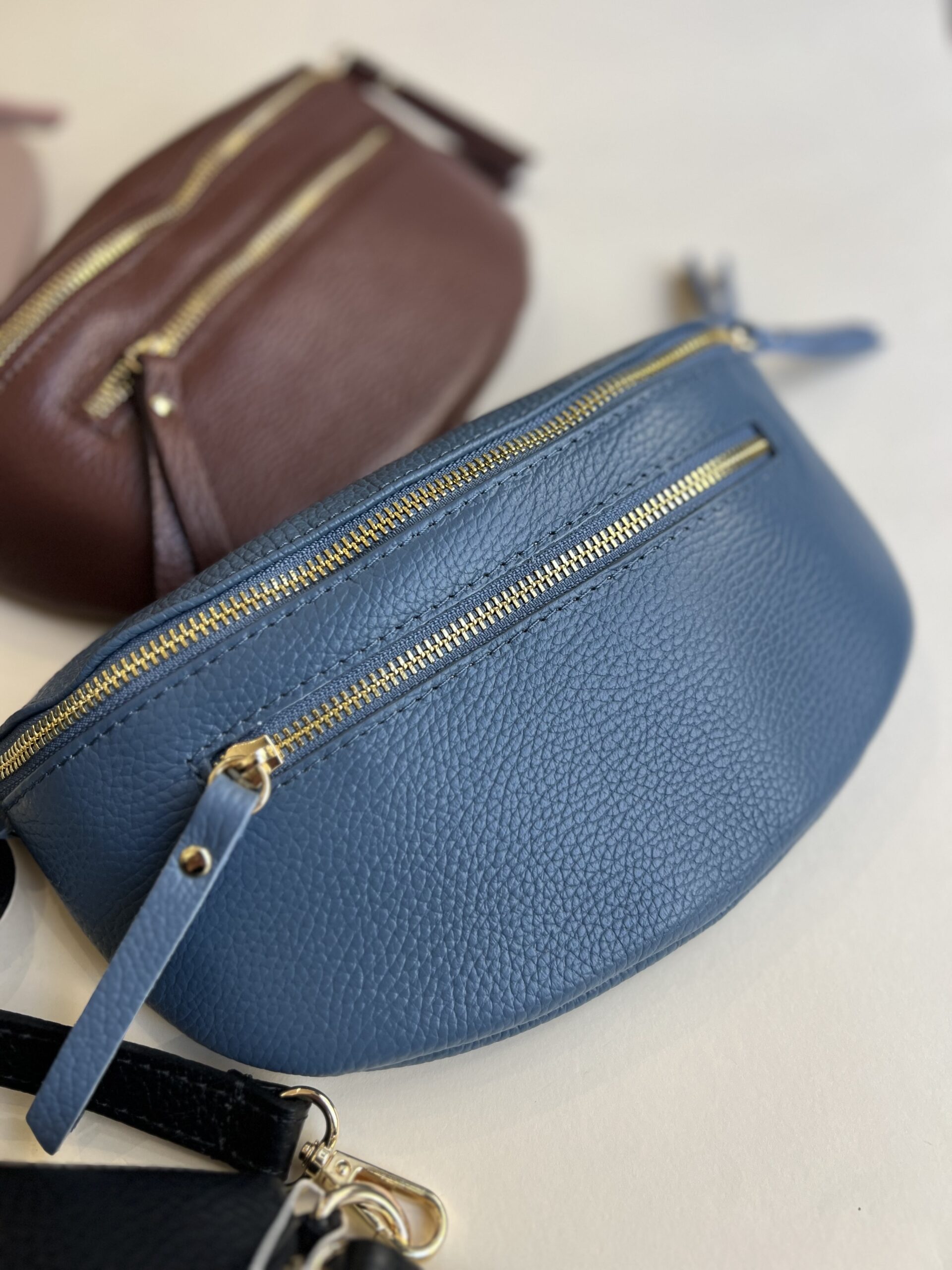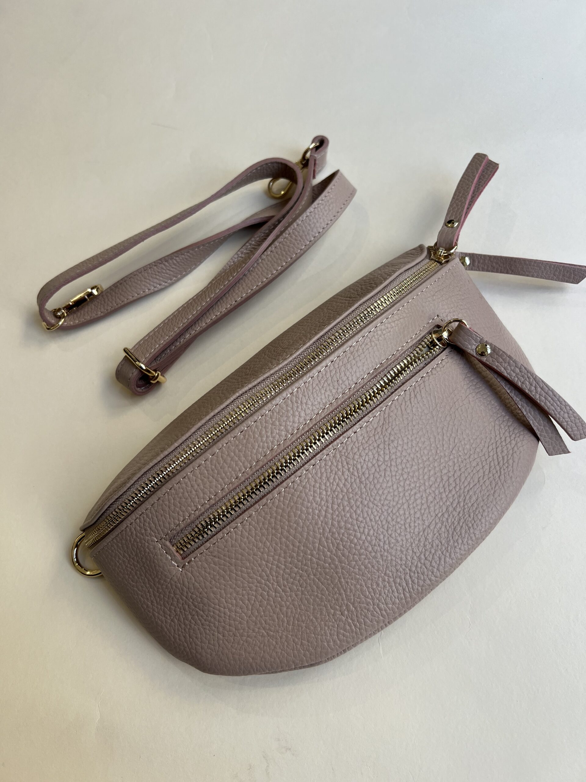 Marsupio in vera pelle con tracolla regolabile e doppia tasca con chiusura zip.