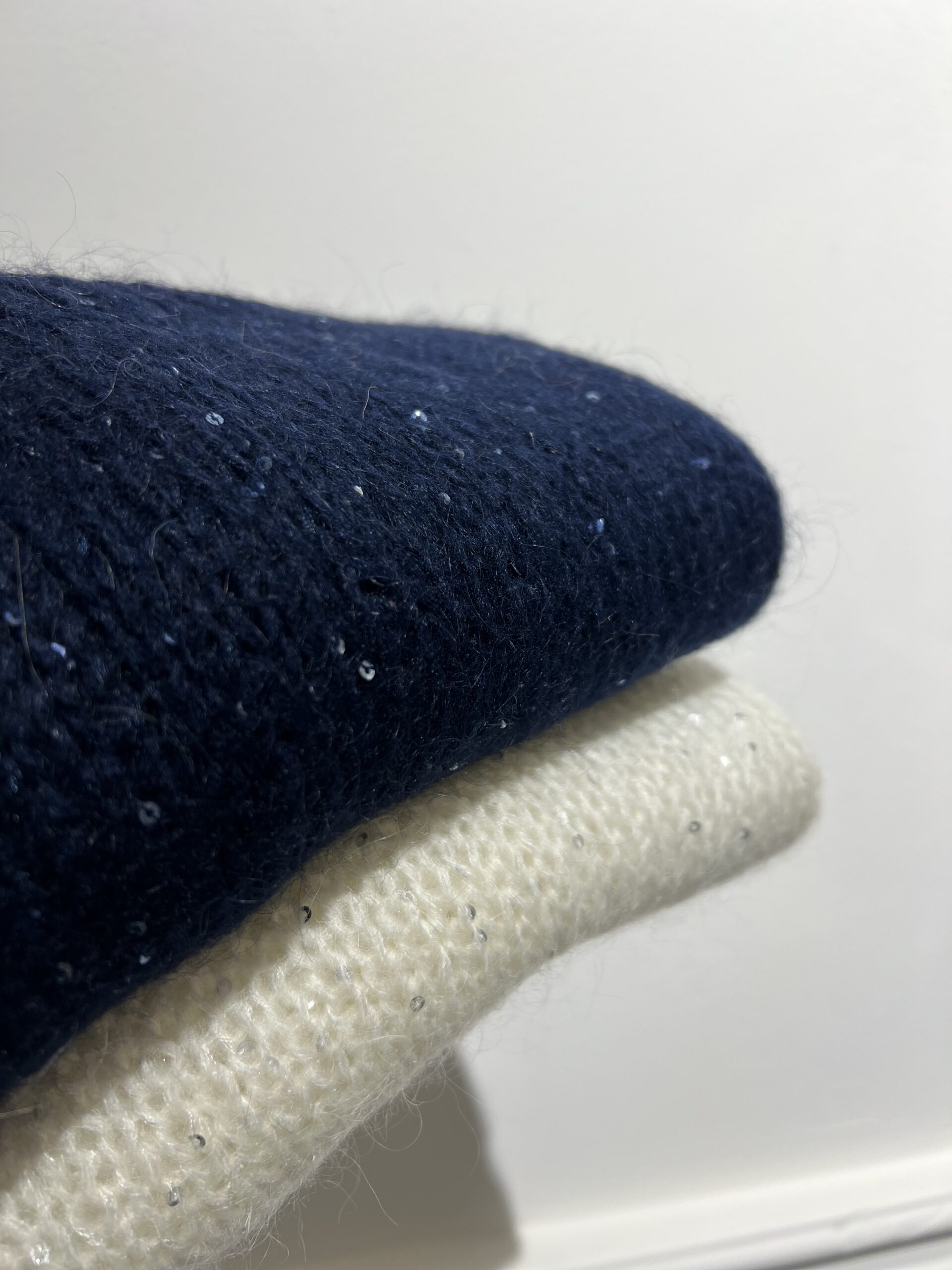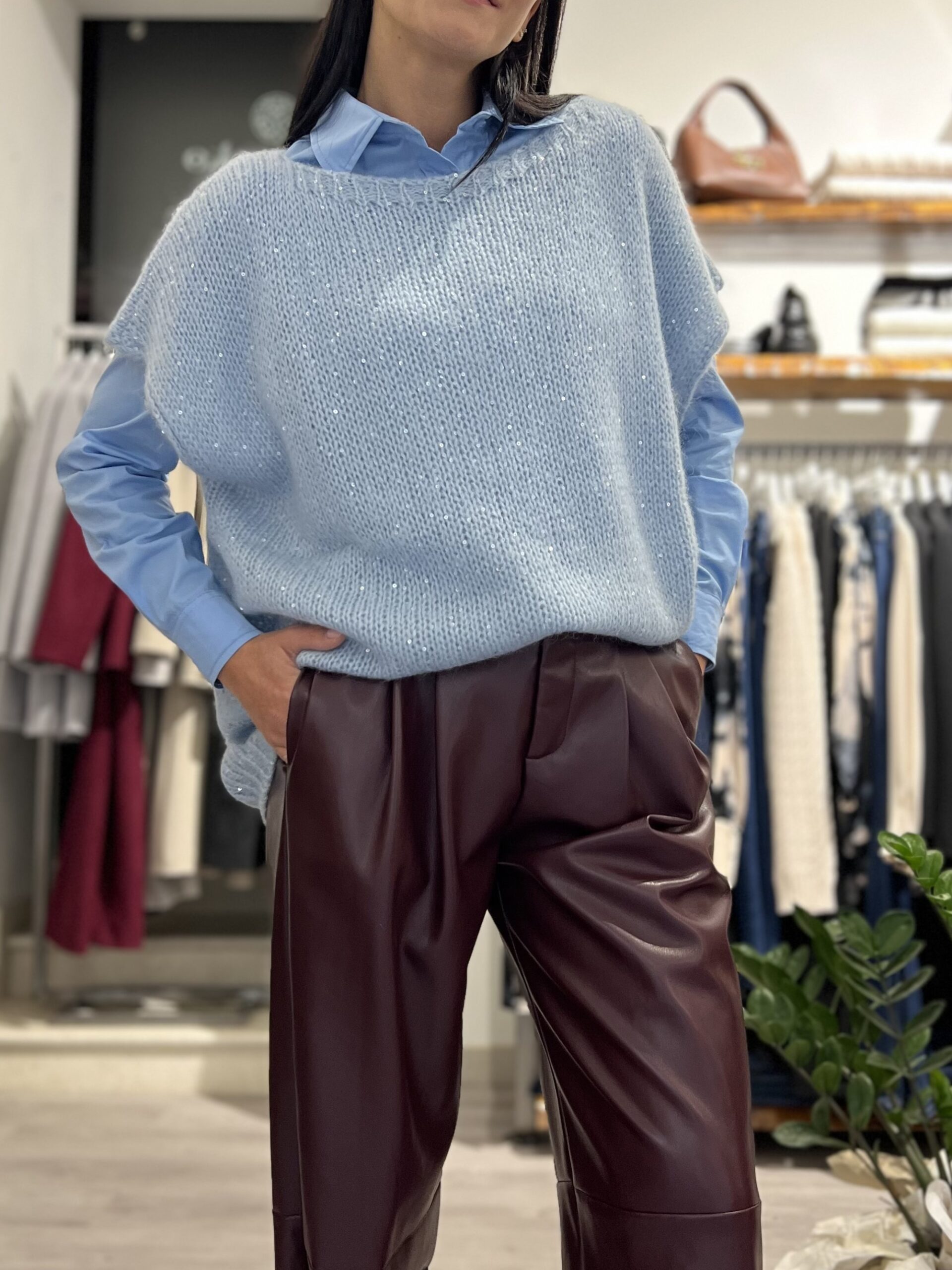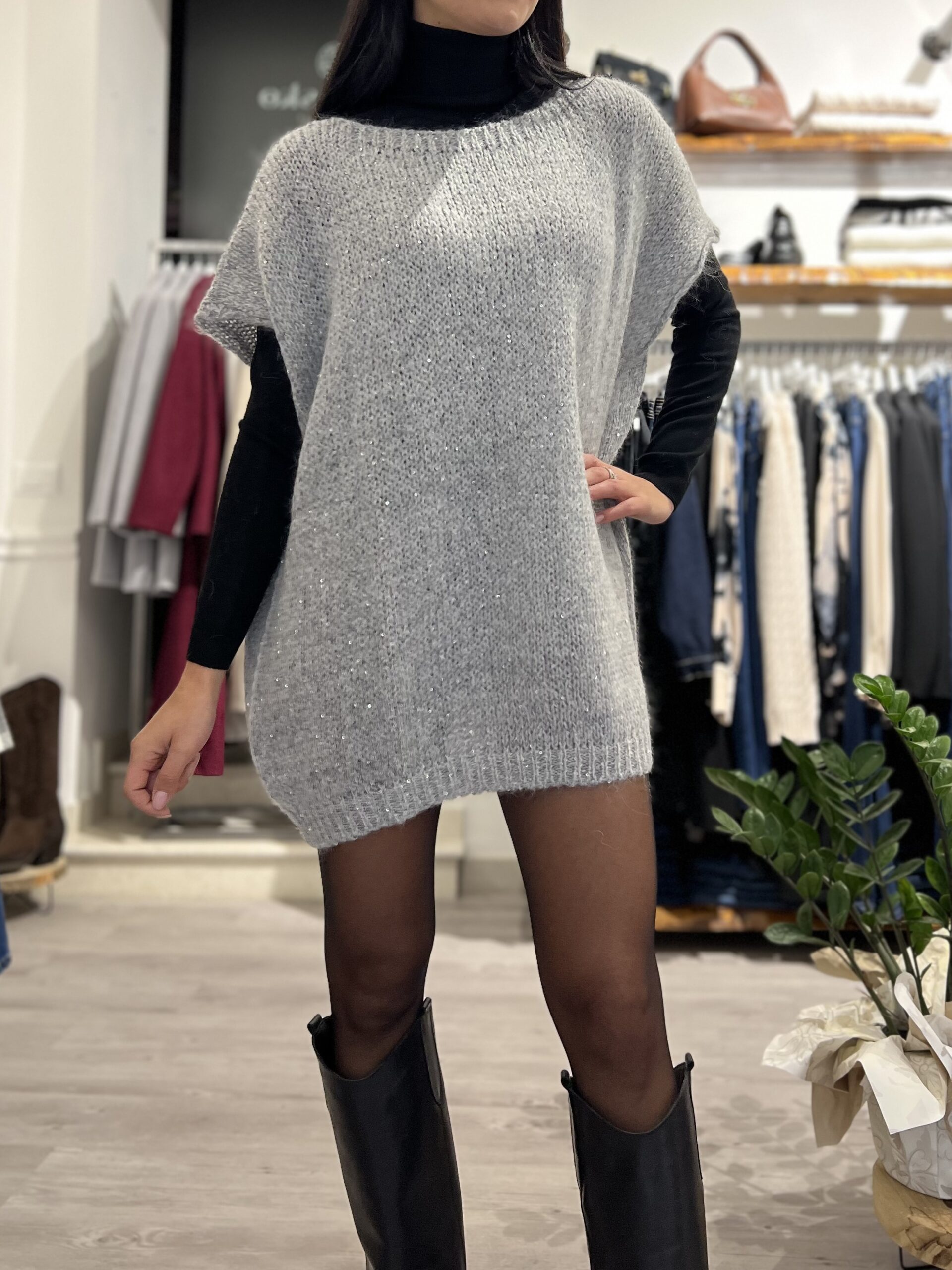 Maxi maglione smanicato con micro-paillettes. Filato caldo e morbido con 20% di mohair all’interno della composizione. Taglia unica veste fino alla 50.