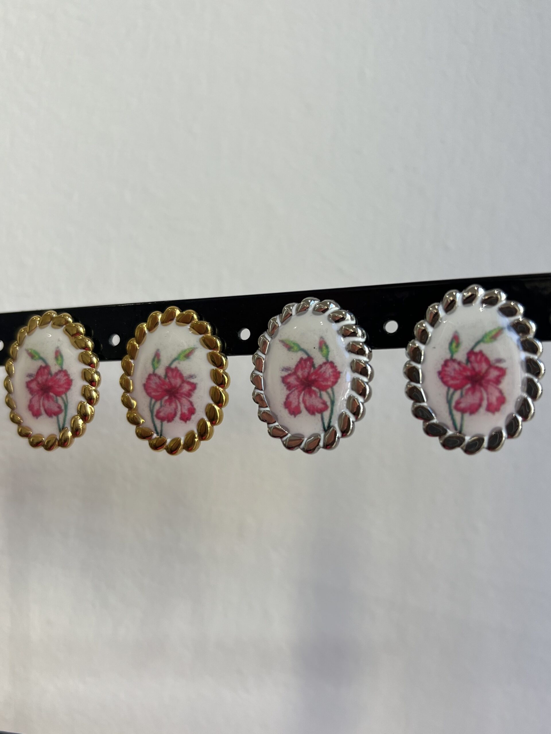 Orecchini con classica chiusura farfalla, modello tondo con fiore.