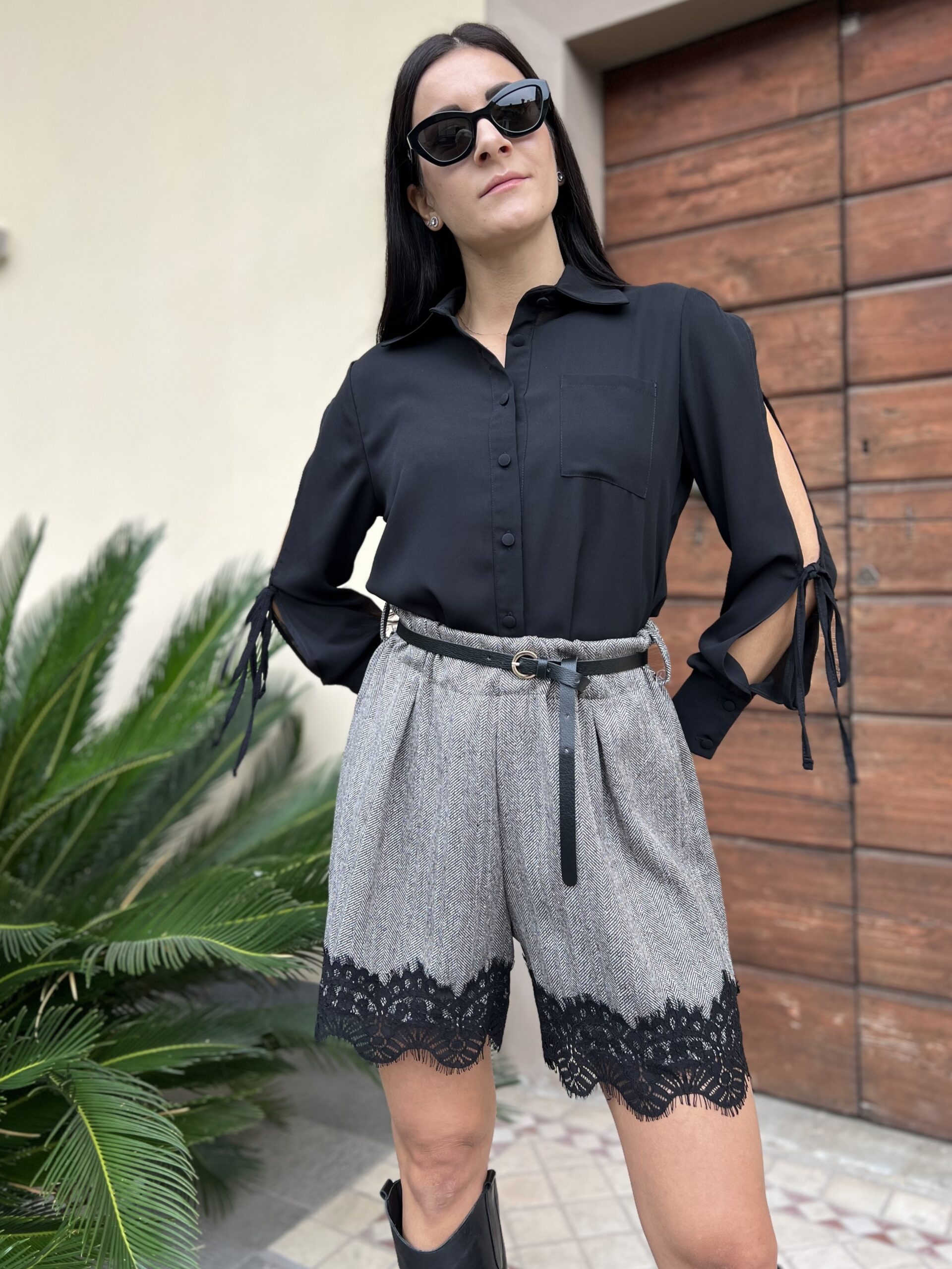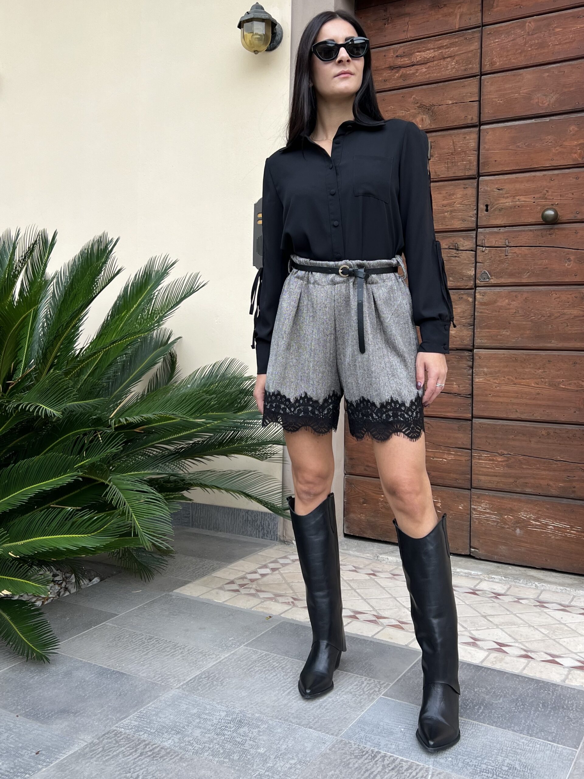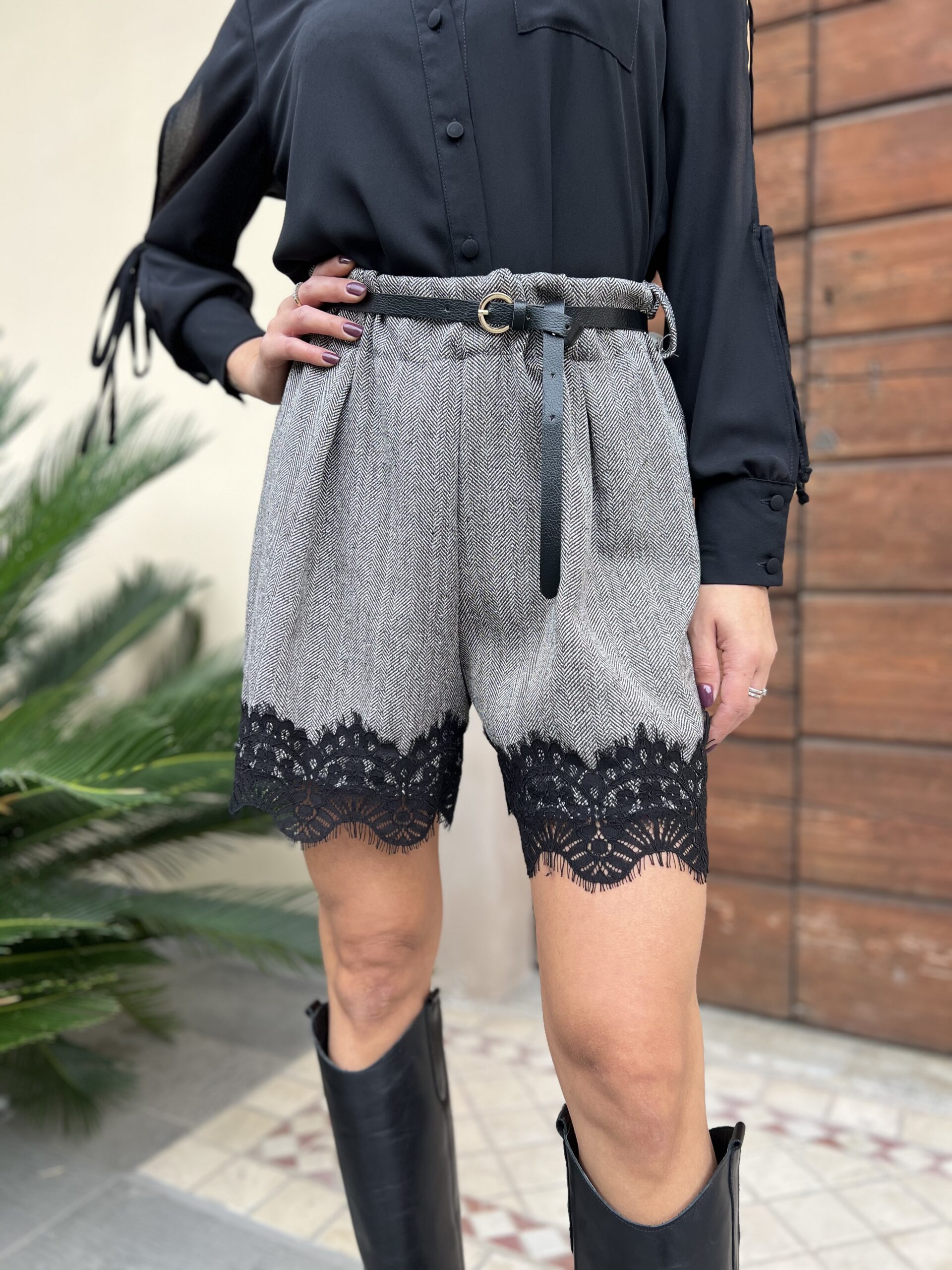 Pantaloncino con elastico in vita e tasca laterale. Dettaglio inserto in pizzo e cintura inclusa. Tessuto spigato, una mista viscosa, calda e strutturata. Taglia unica veste fino alla 44.