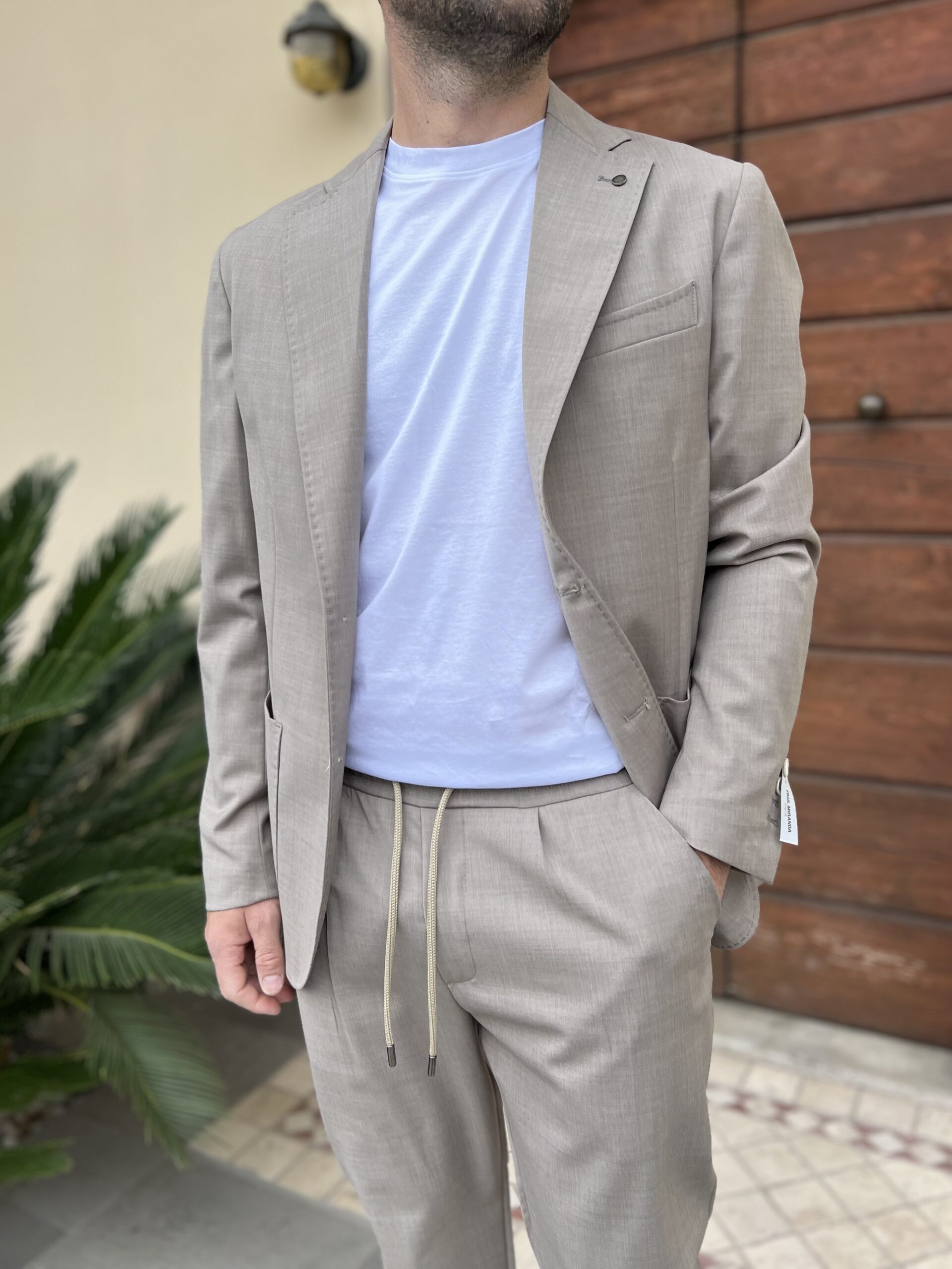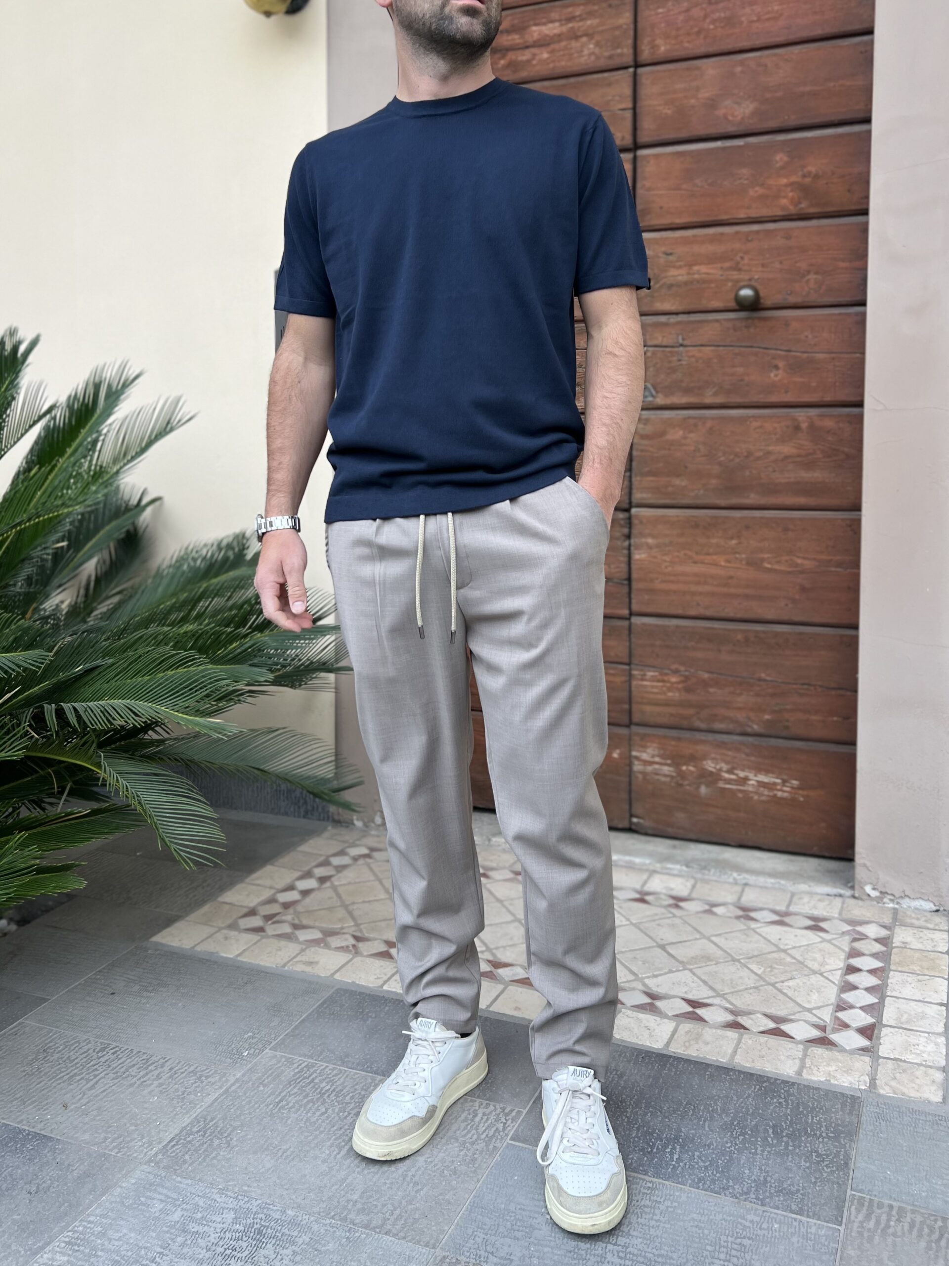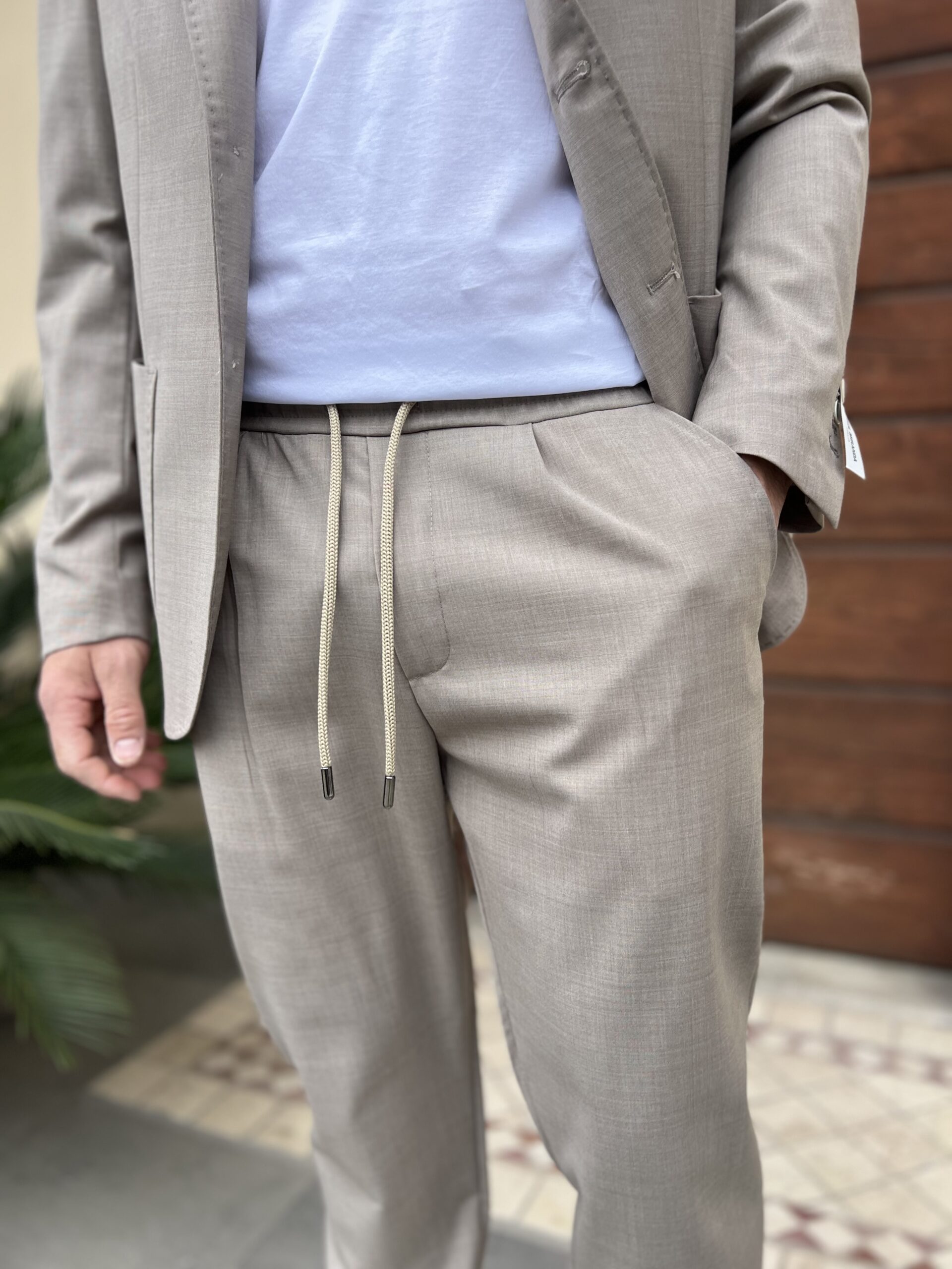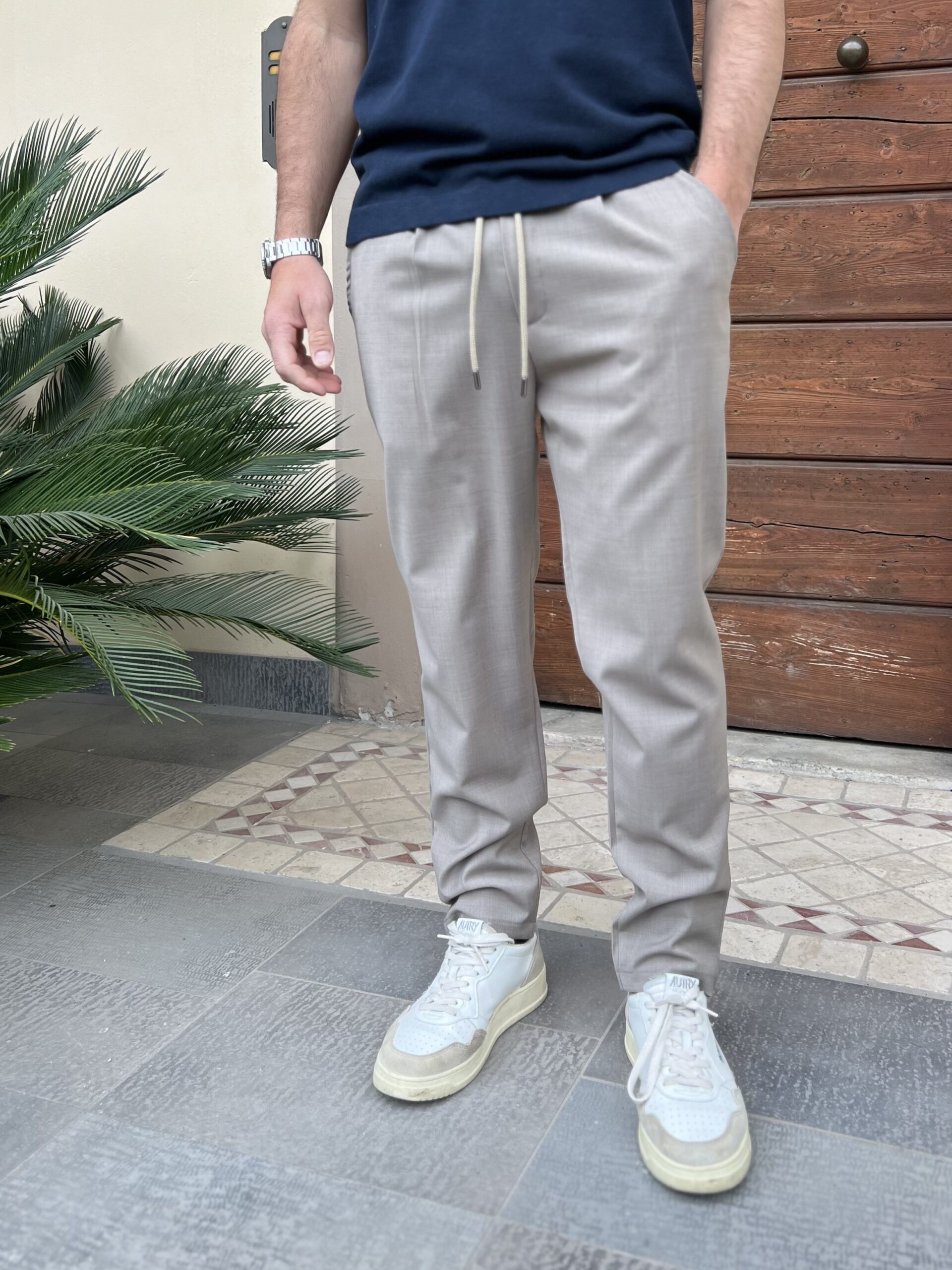 Pantalone classico con chiusura bottone e zip, modello in 44% fresco lana e 56% pl.
