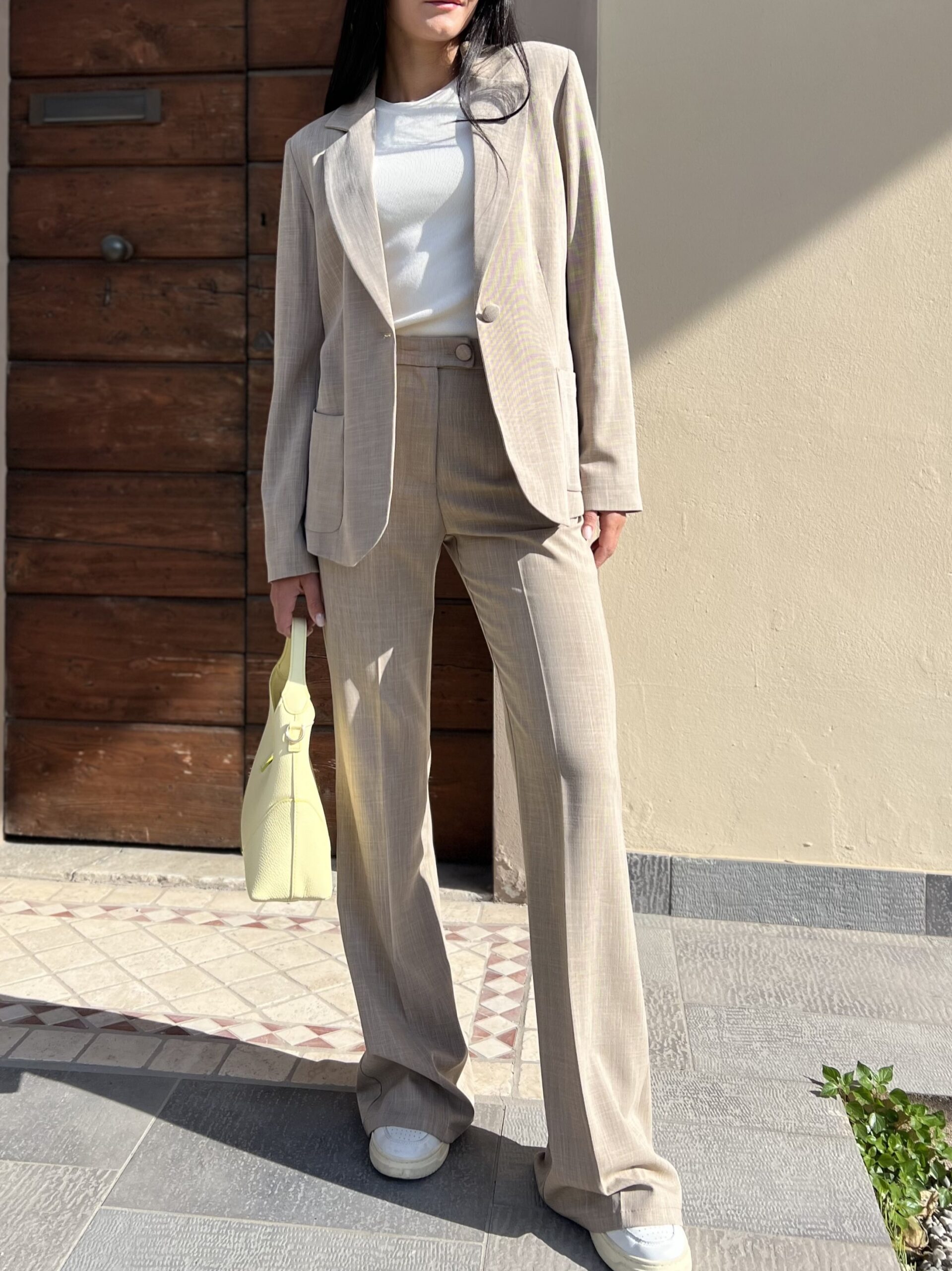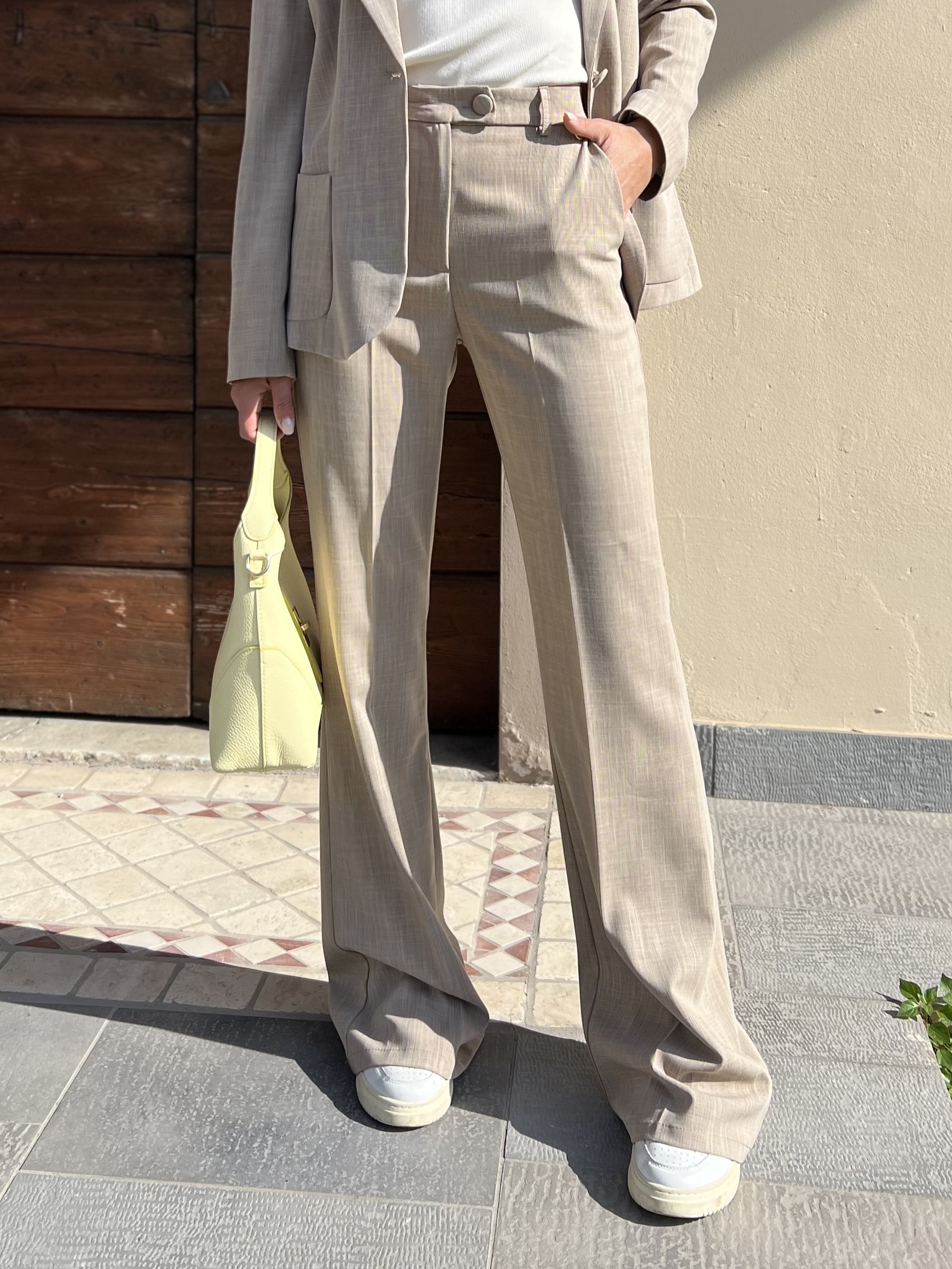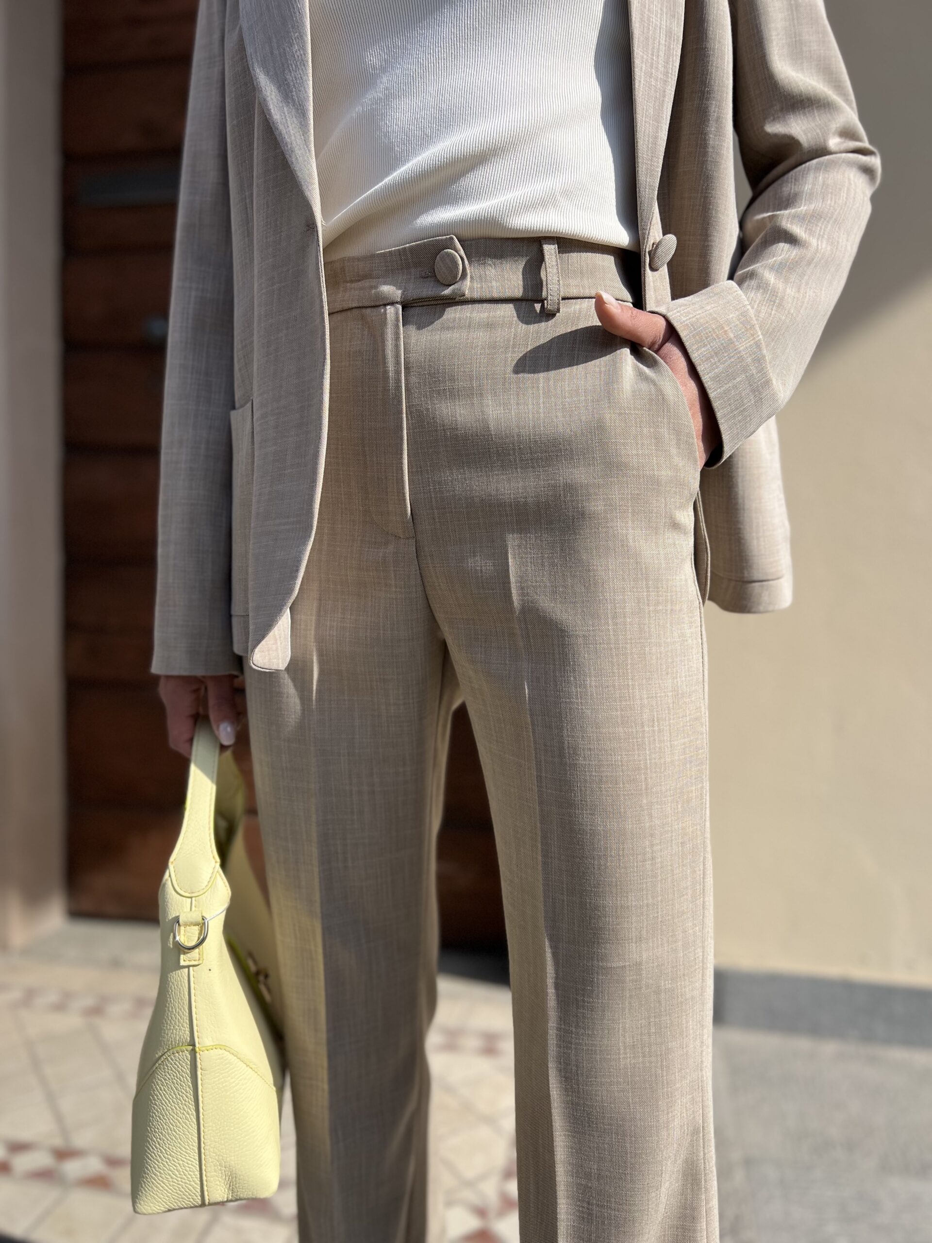 Pantalone dal taglio dritto non eccessivamente ampio. Modello con chiusura zip e bottone e passanti, in poli-viscosa, tessuto leggero effetto lino. Taglia Xs per 38, S 40, M42 e L 44.