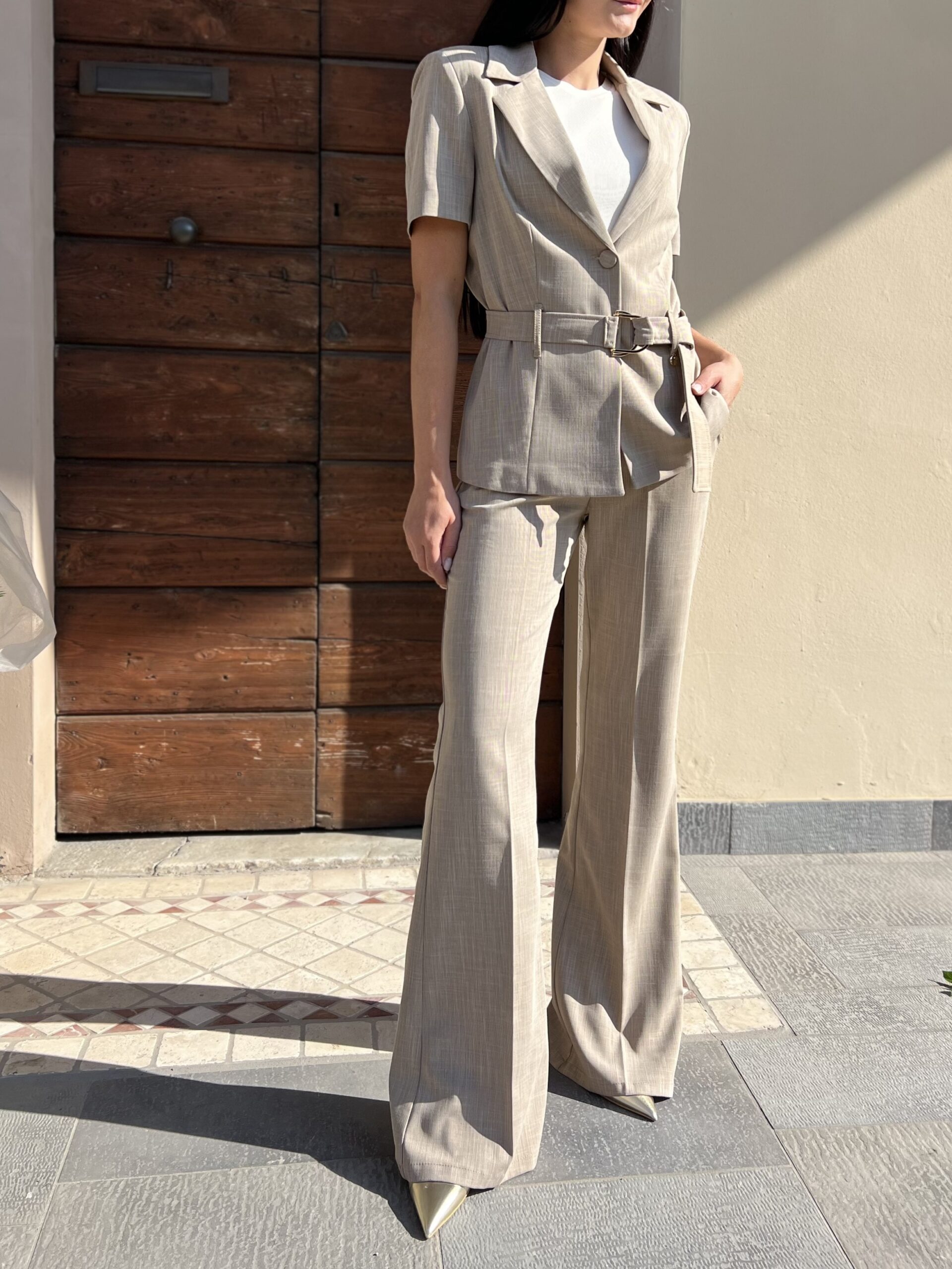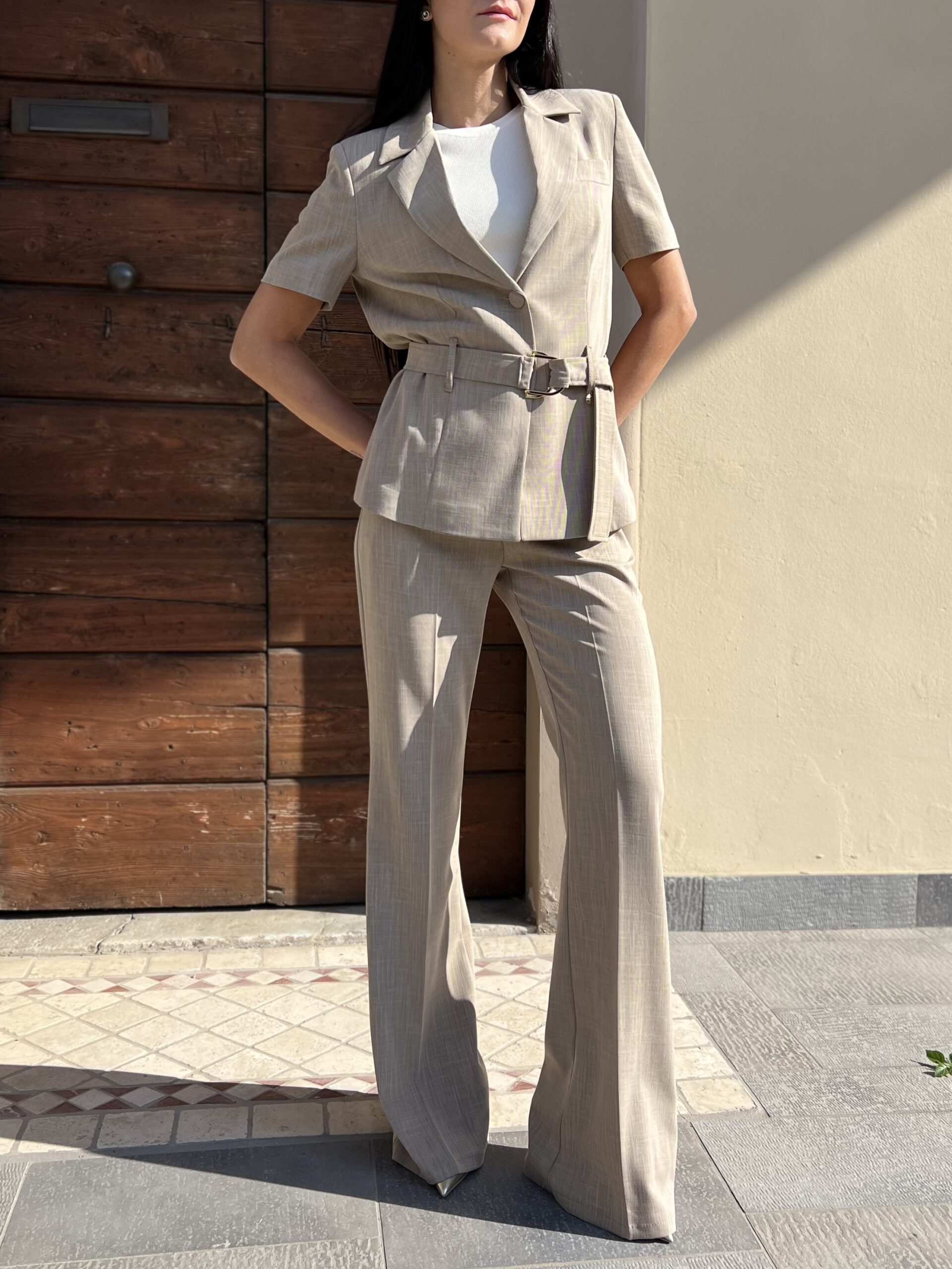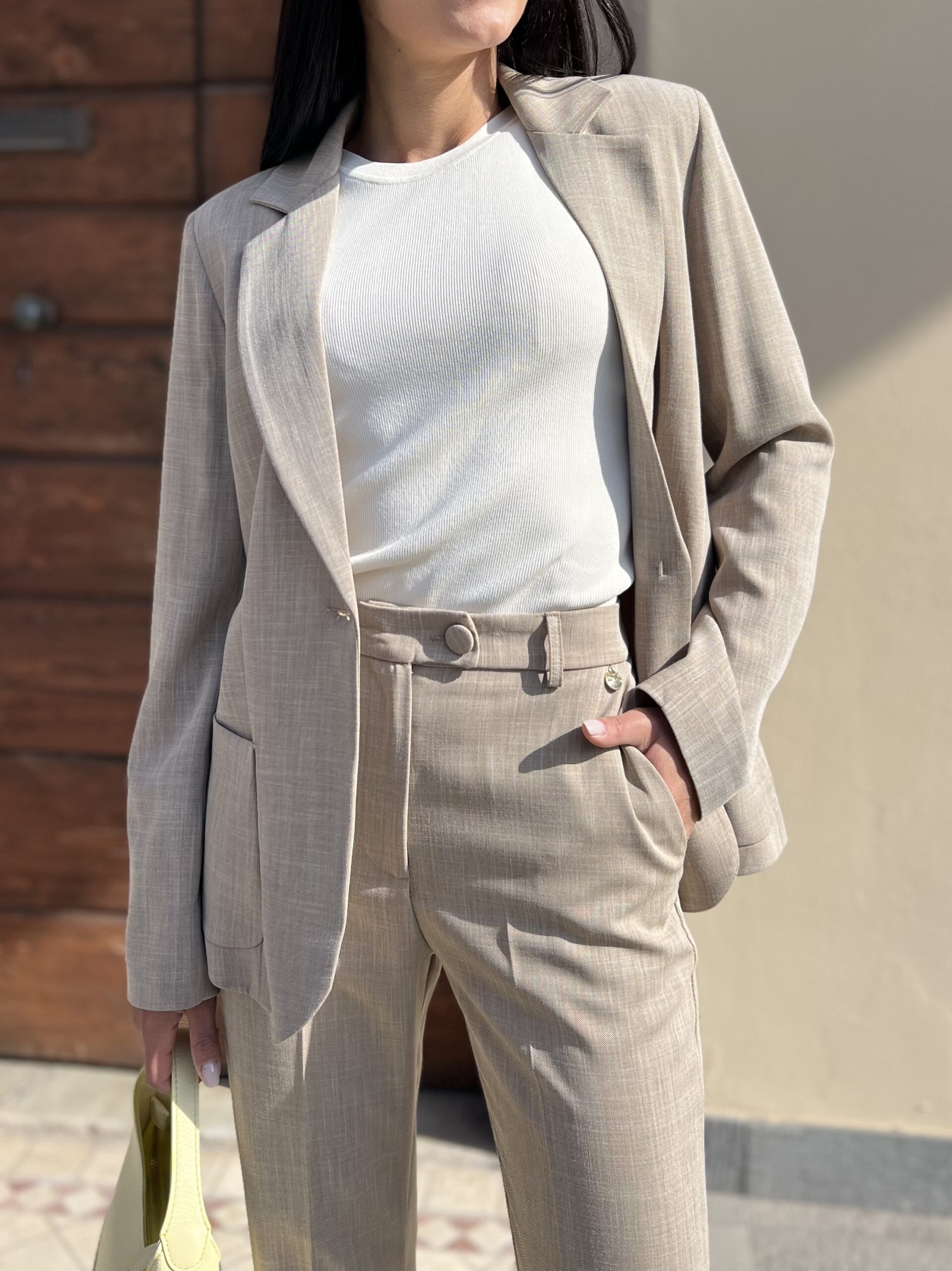Pantalone dal taglio dritto non eccessivamente ampio. Modello con chiusura zip e bottone e passanti, in poli-viscosa, tessuto leggero effetto lino. Taglia Xs per 38, S 40, M42 e L 44.