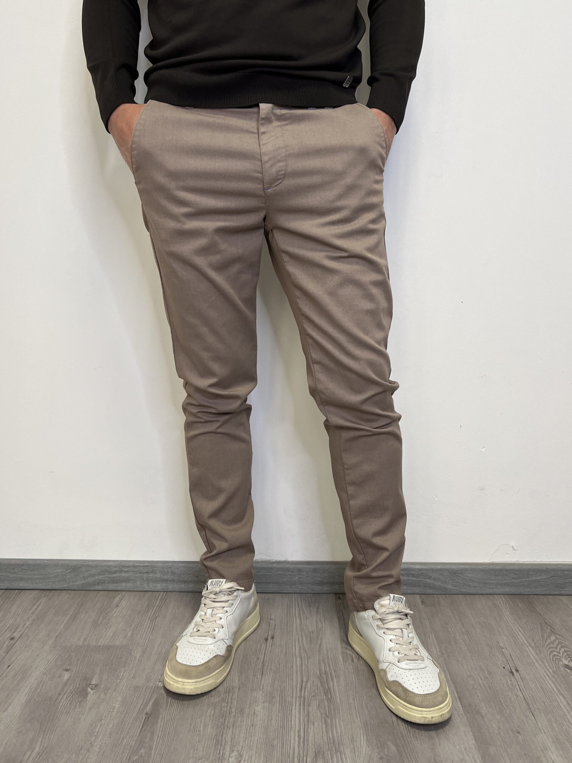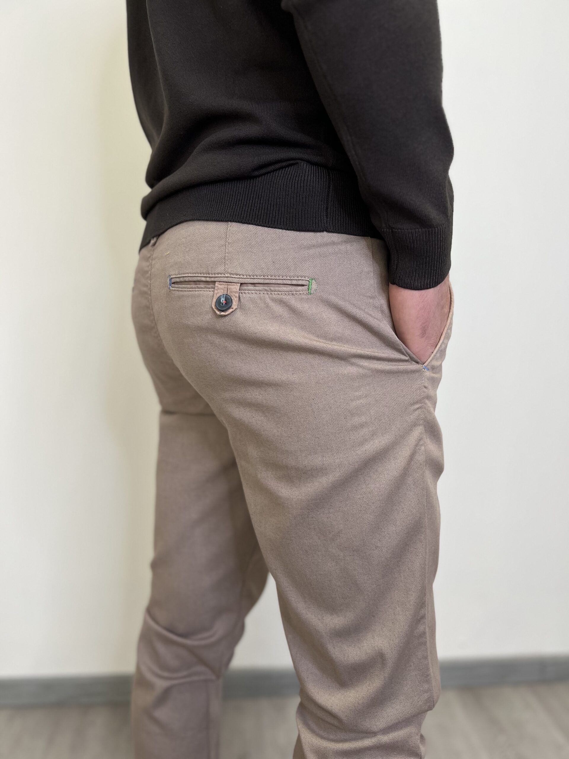 Pantalone modello chino classico micro-fantasia. Modello con tasche a filo in cotone leggero.