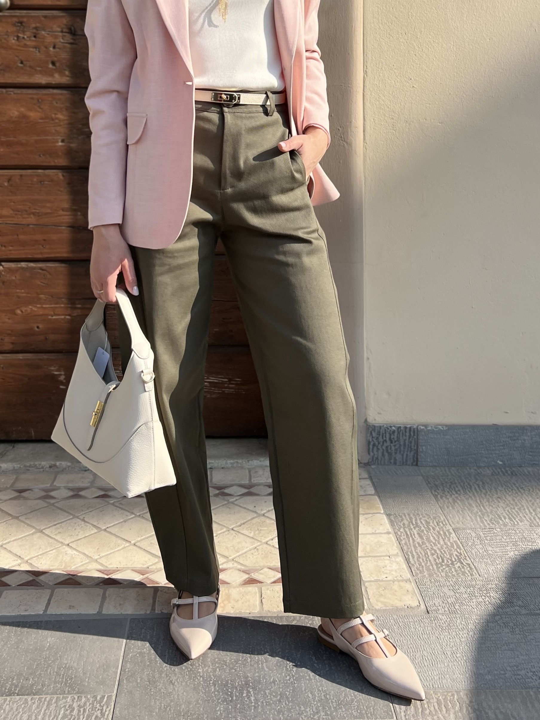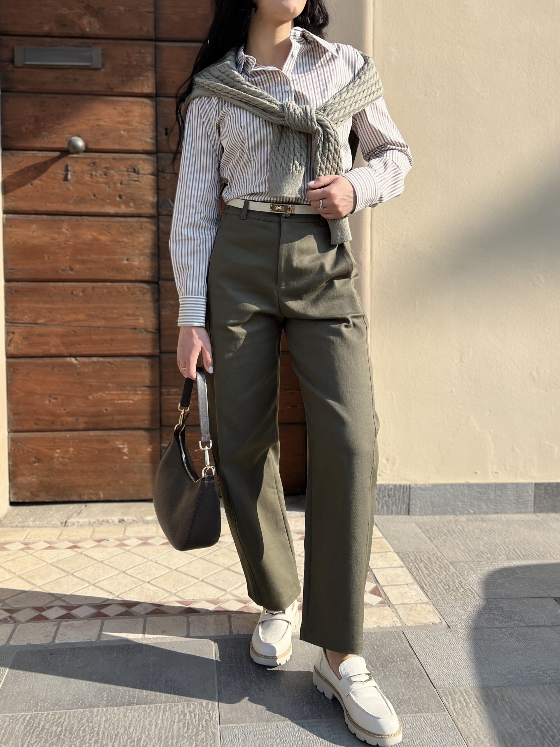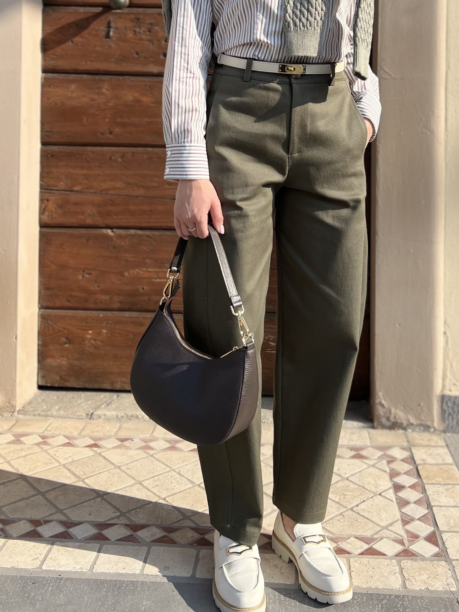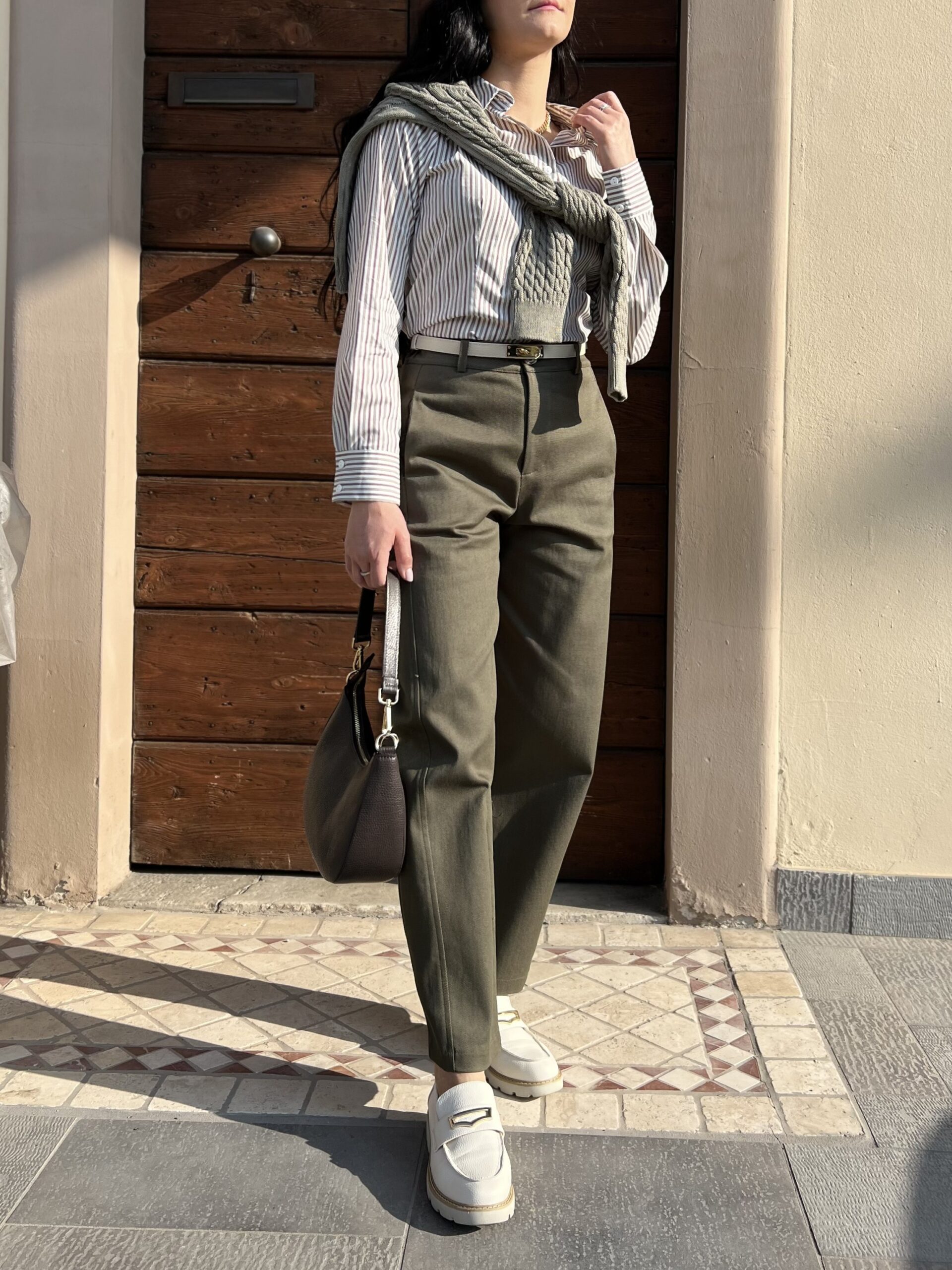 Pantalone in drill di cotone, modello leggermente ballon a vita alta con elastico sul retro. Taglia Xs per 38/40 S per 40/42 e M per 42/44.