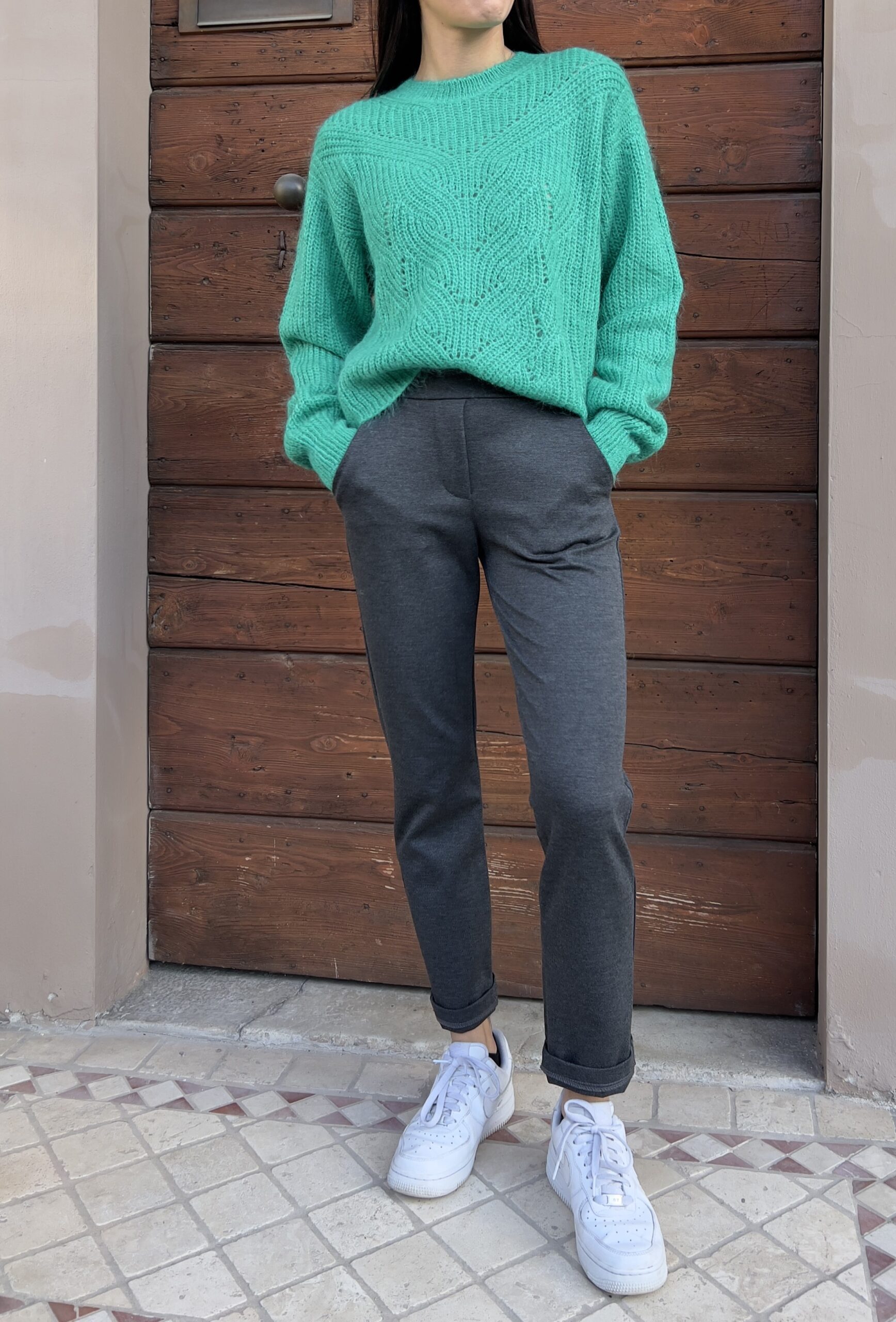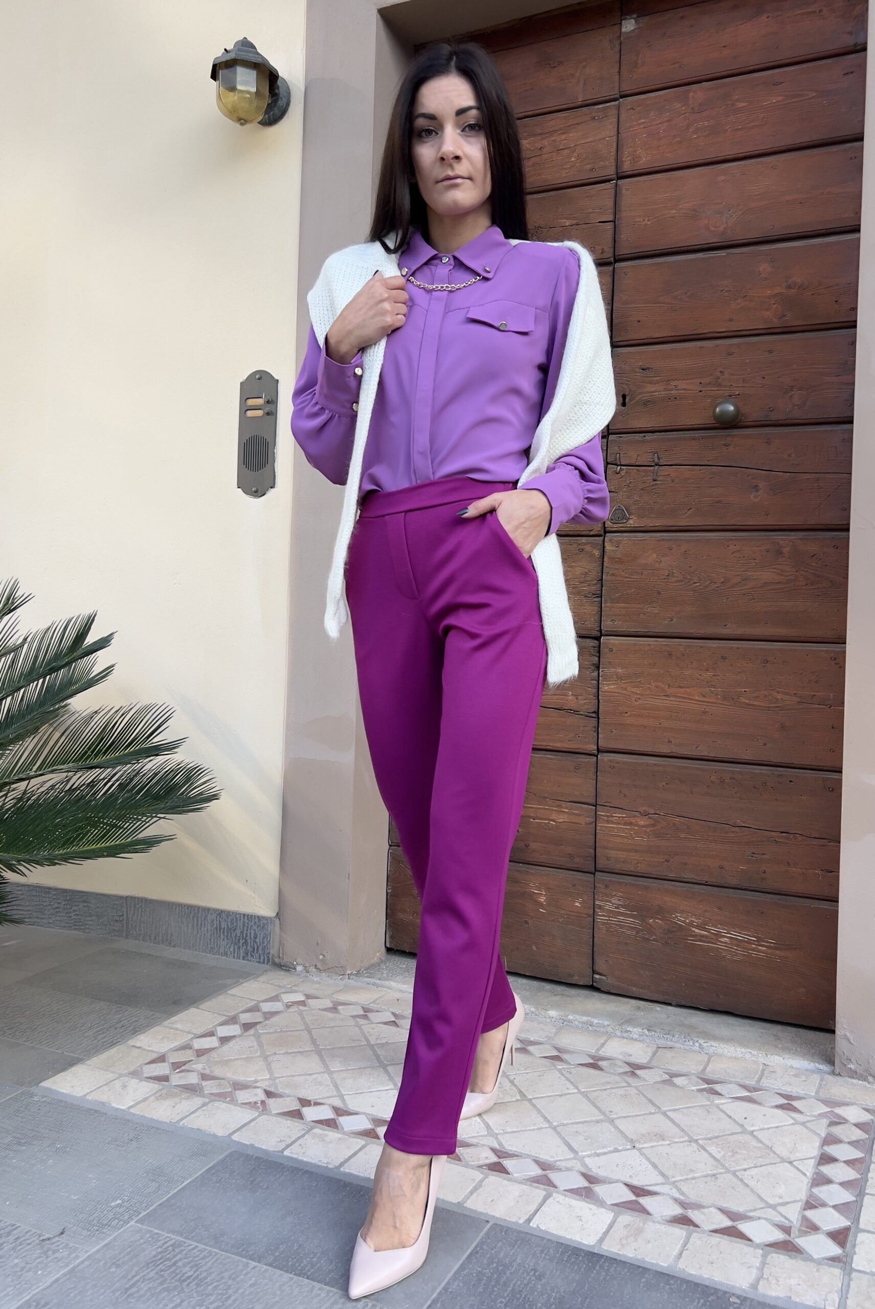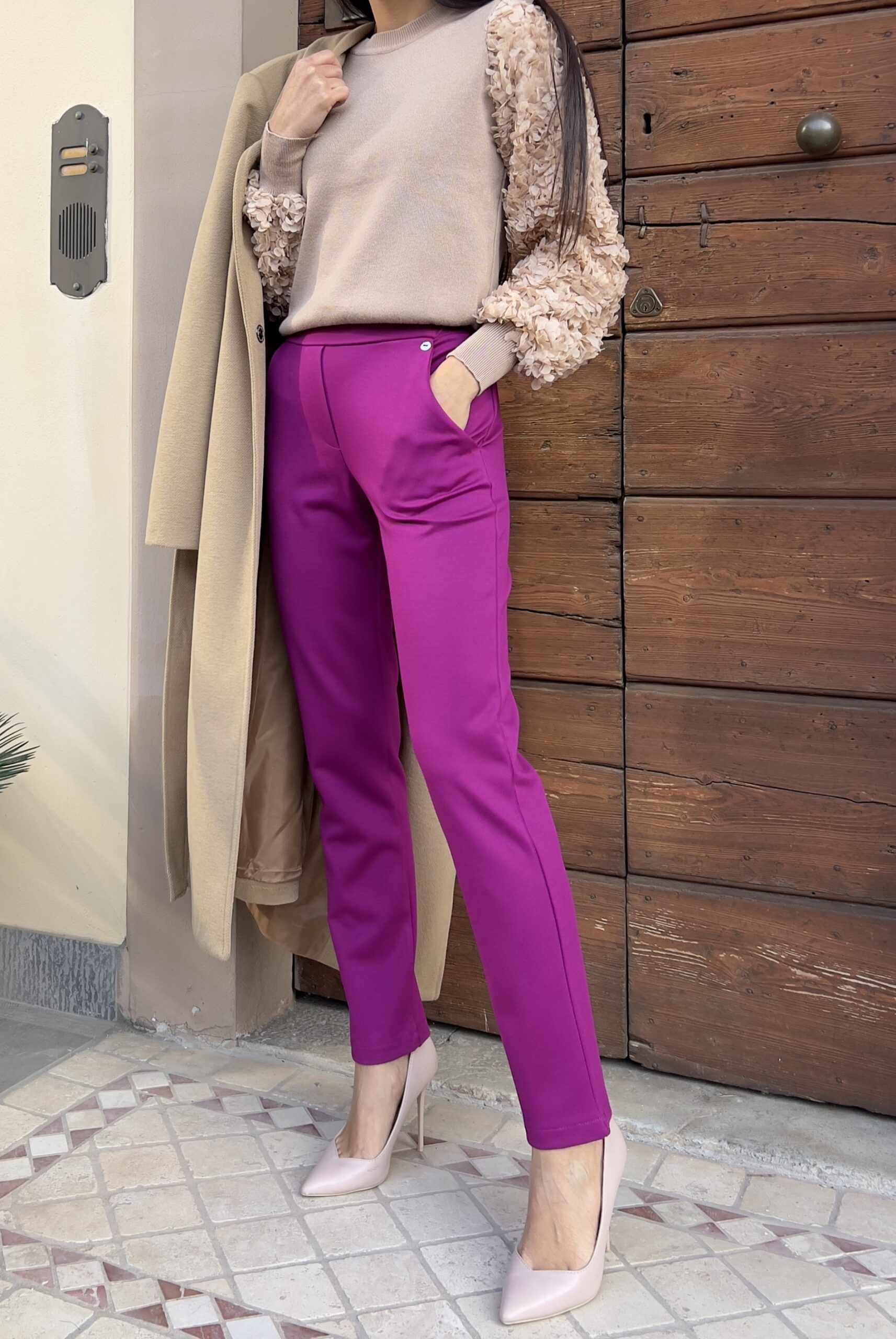 Pantalone modello chino con elastico sul retro e tasca a filo di lato. Tessuto caldo ed elasticizzato, lavorazione diagonale.