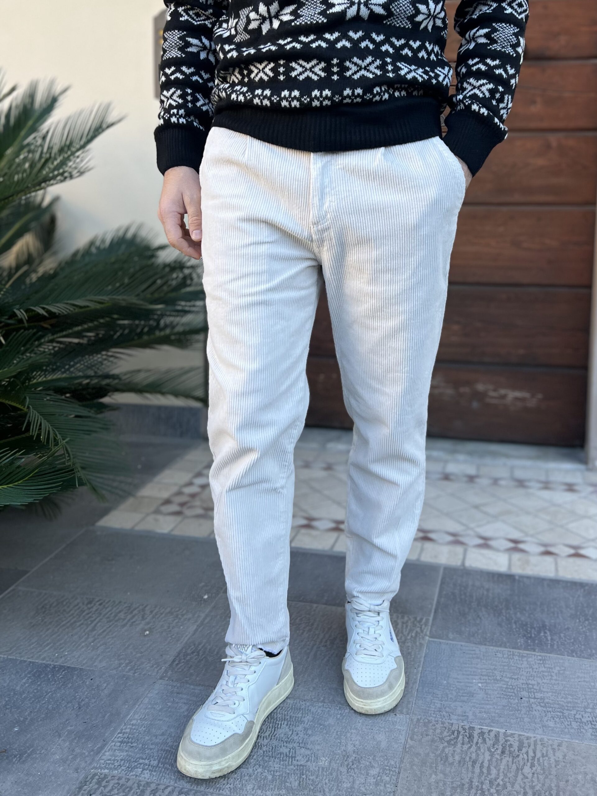 Pantalone in velluto a coste, modello carrot con chiusura zip e bottone. Vestibilità morbida.