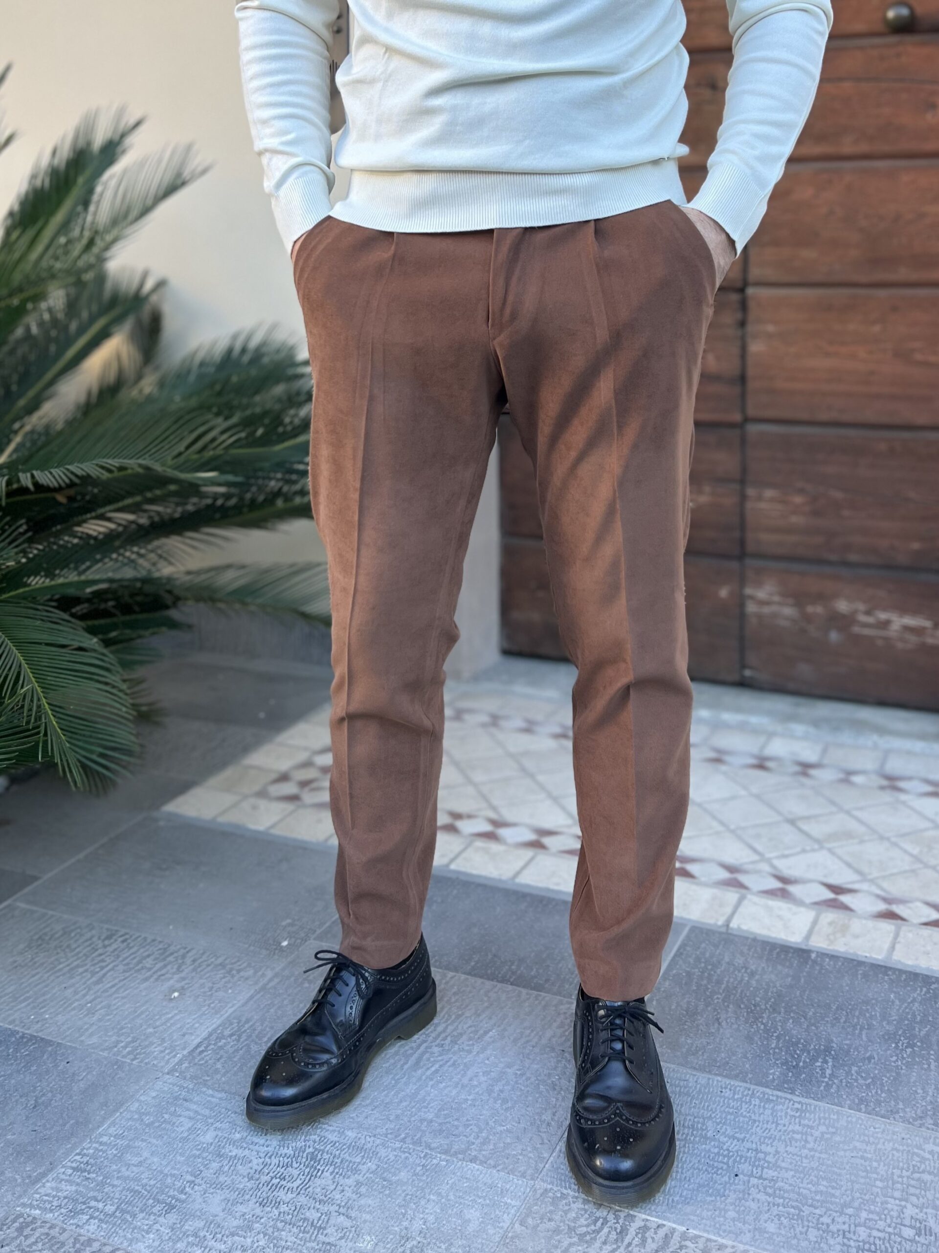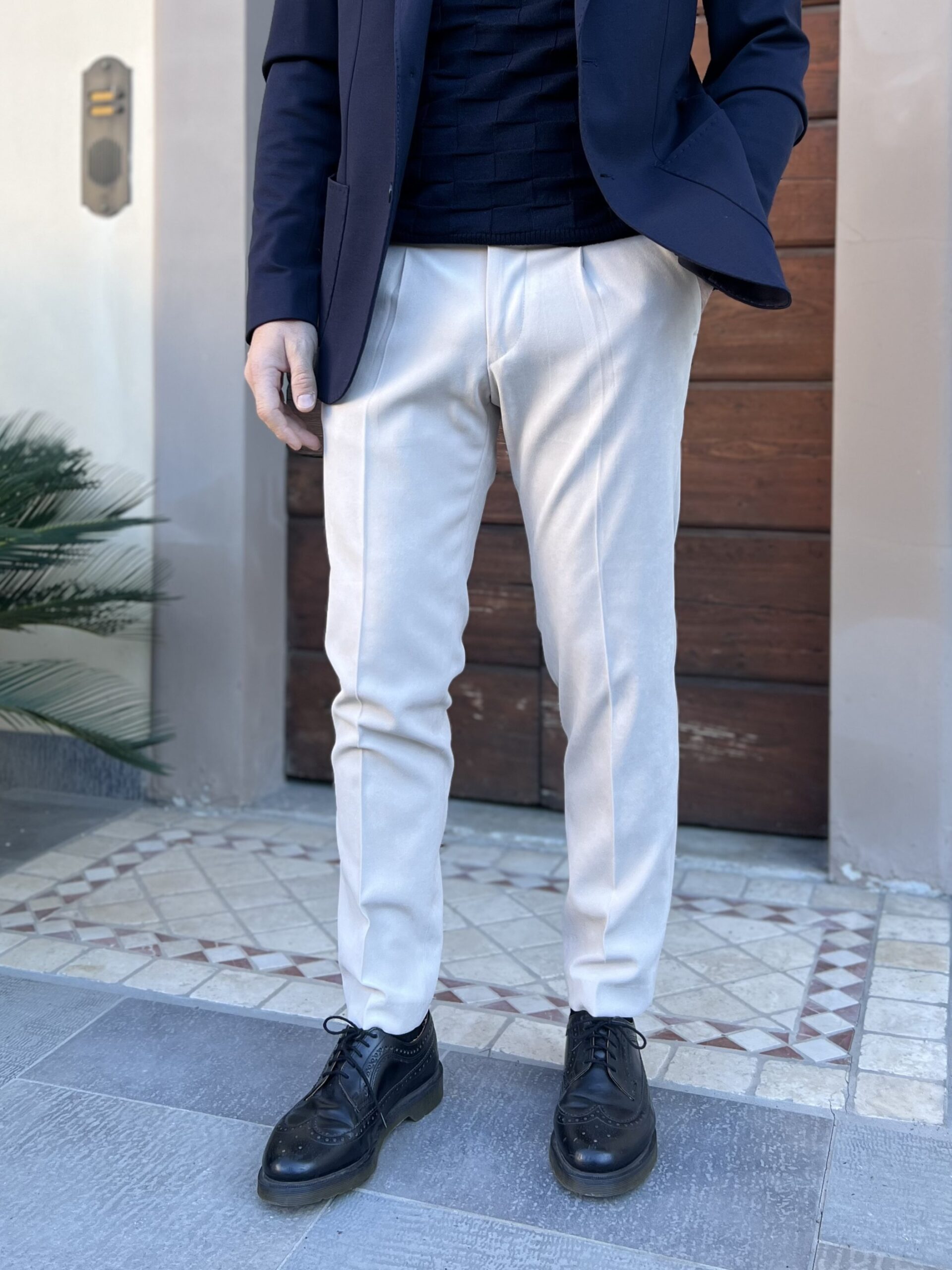 Pantalone classico chino in velluto liscio con pinces, chiusura con zip e bottone.