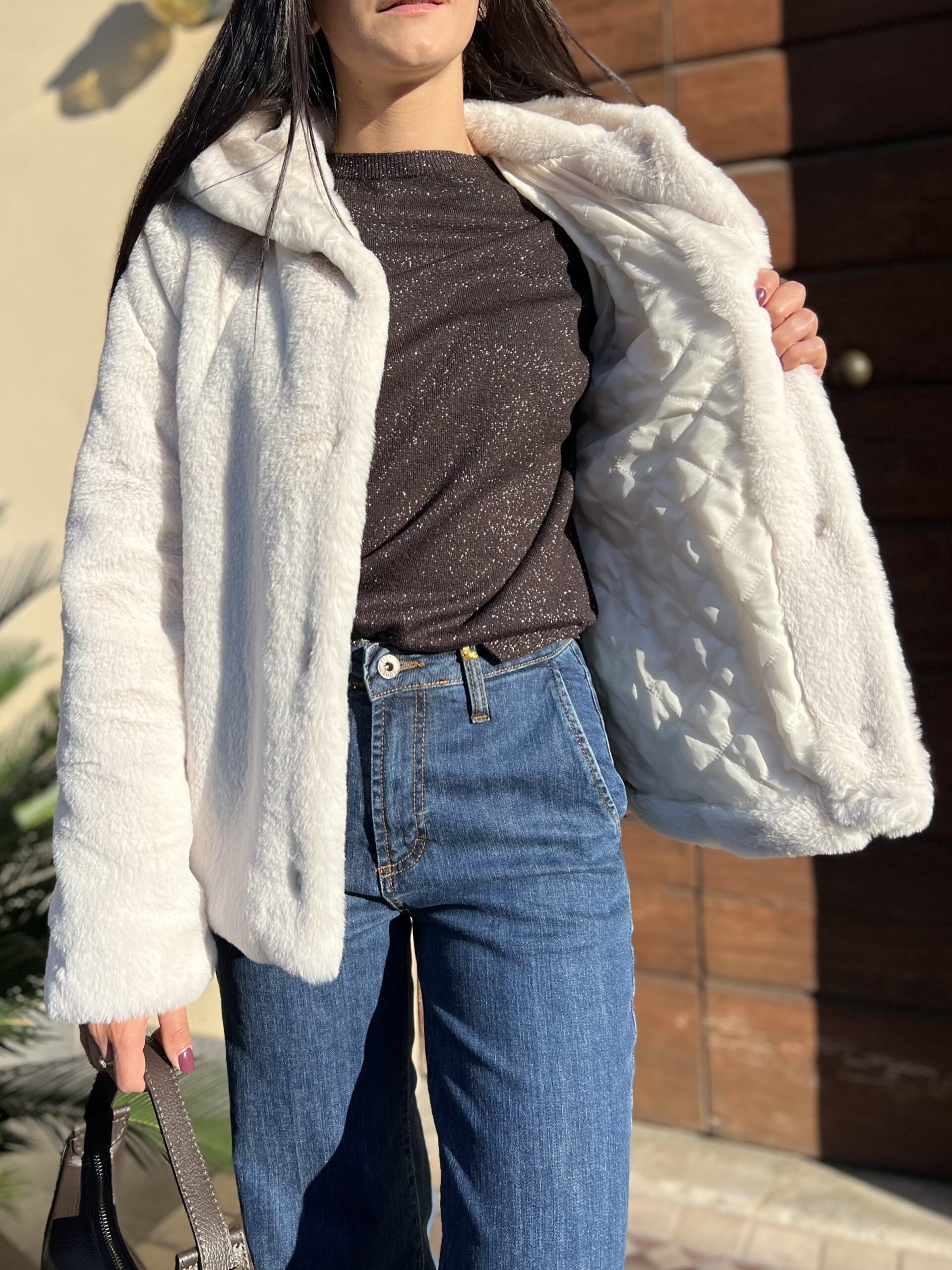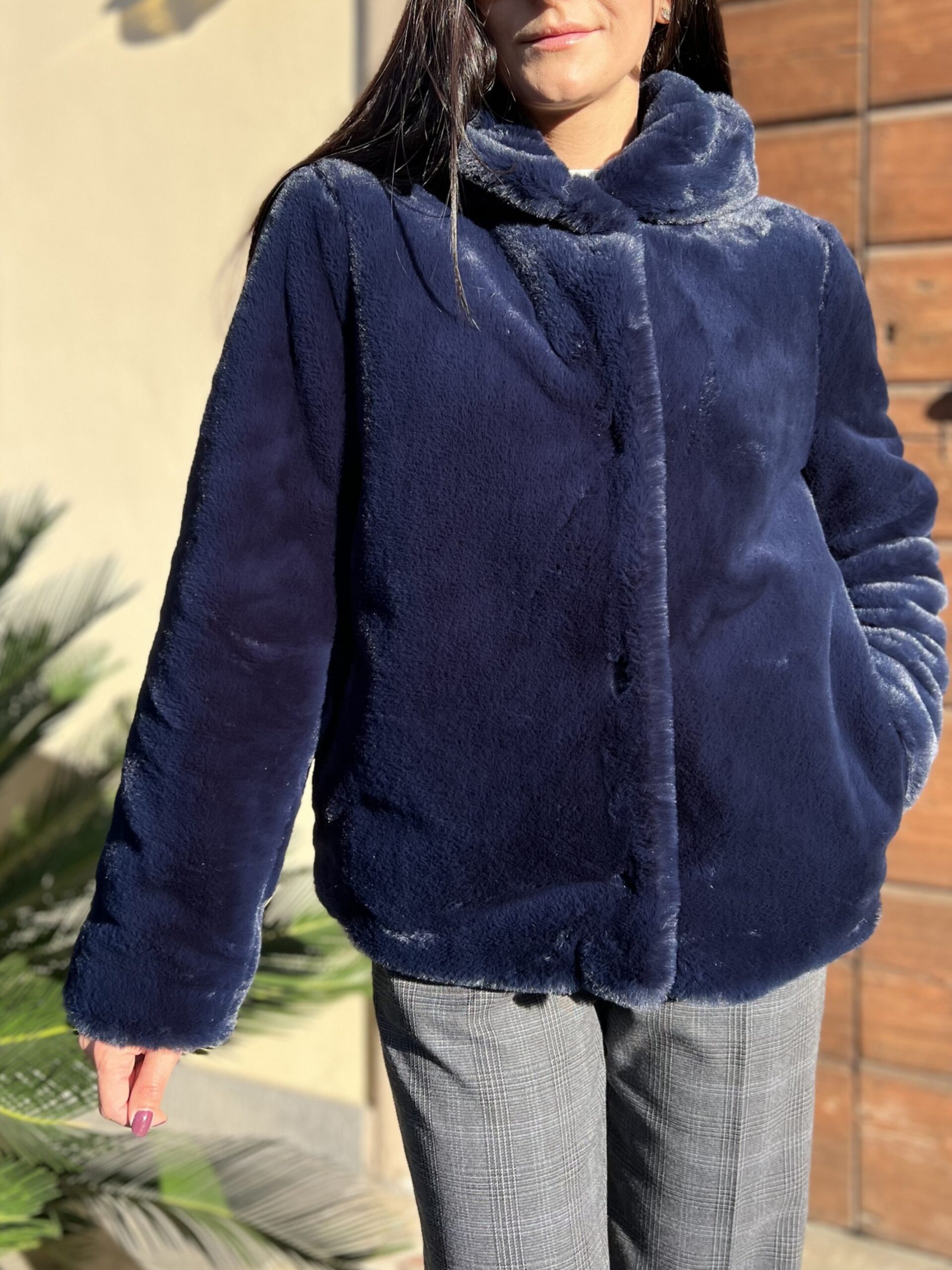 Pelliccia eco morbidissima, modello dal taglio leggermente sfiancato con manica regolare e cappuccio. Chiusura con bottoni a pressione e tasca laterale, foderato e trapuntato internamente.
