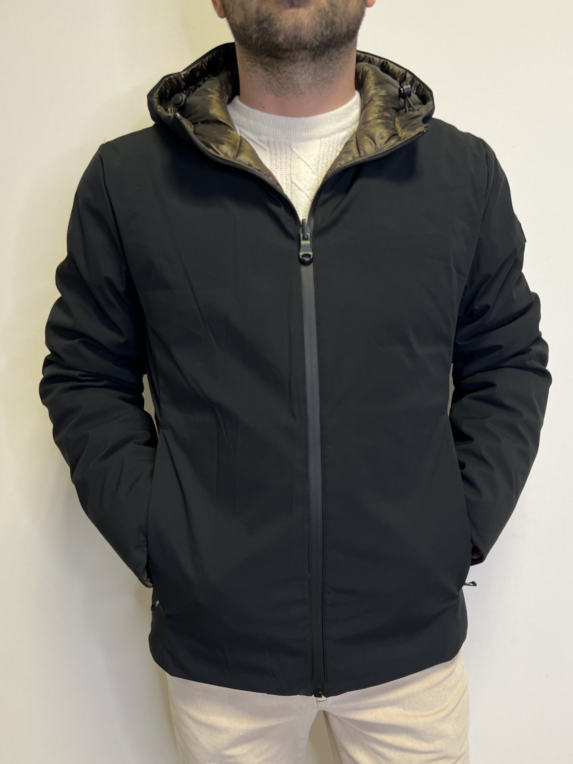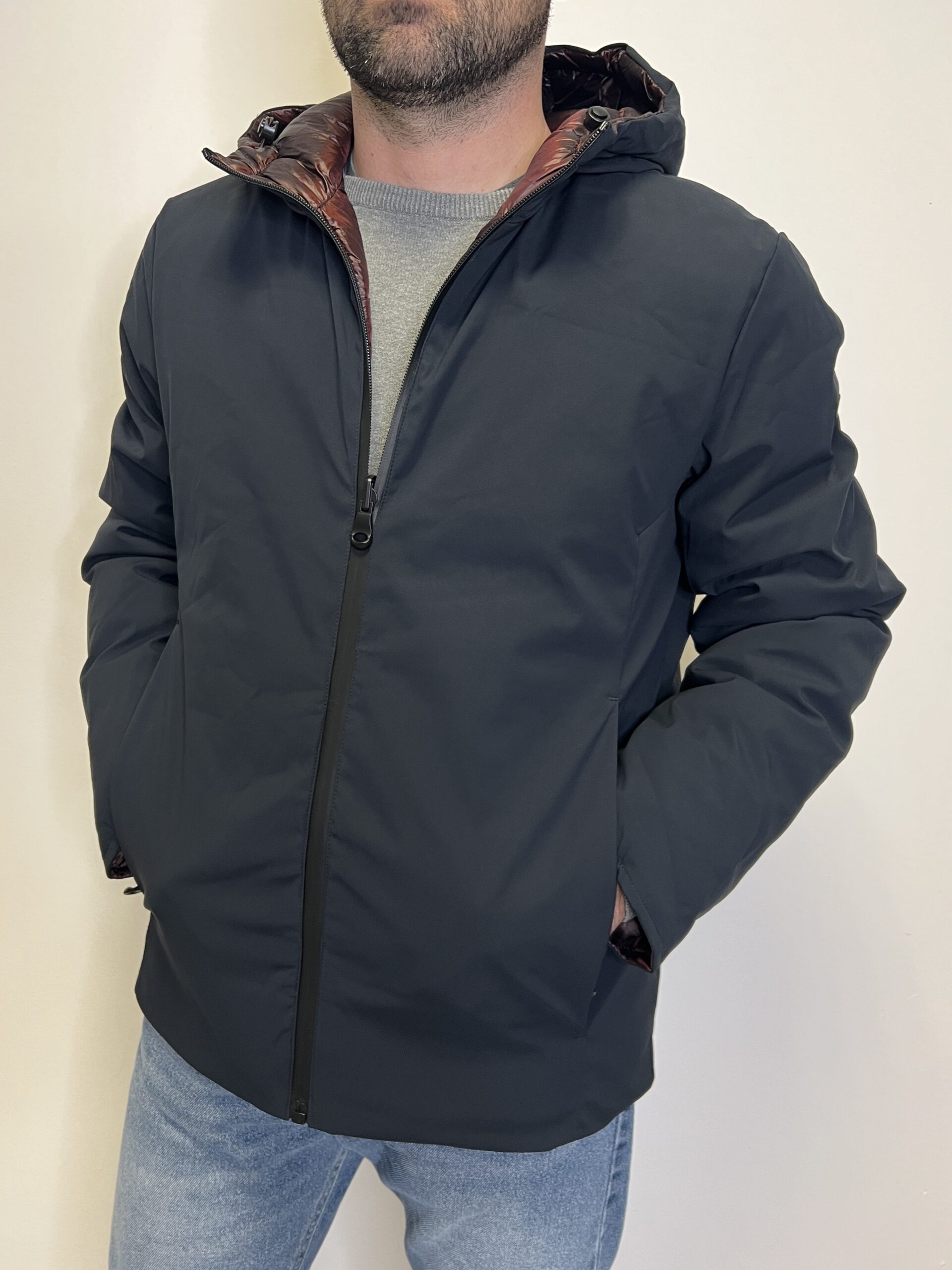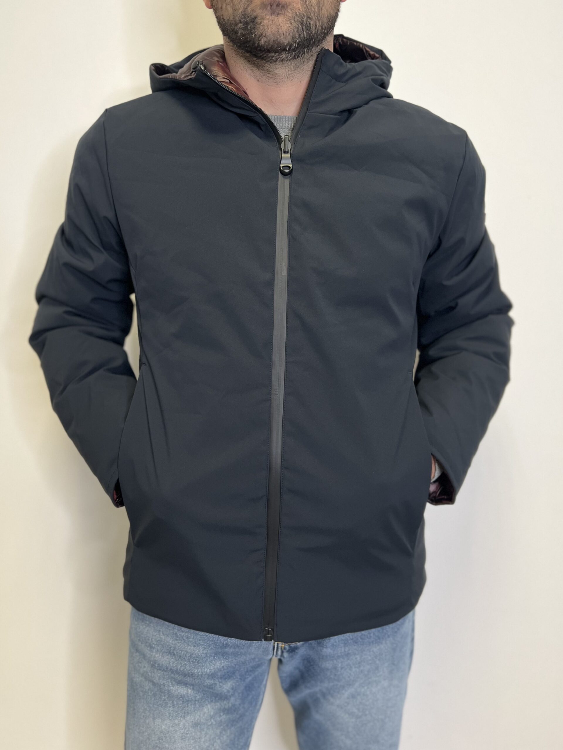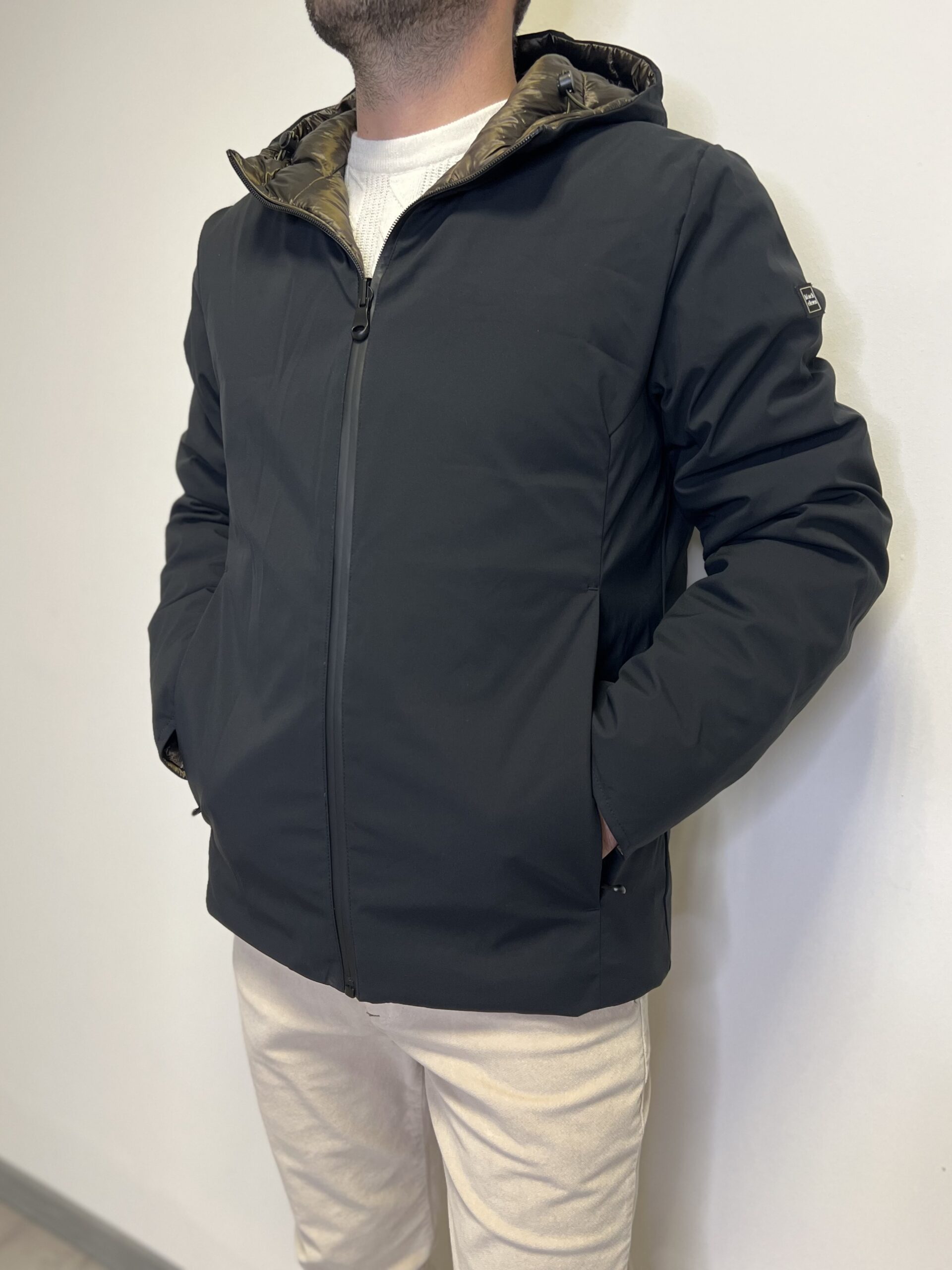 Piumino tecnico con imbottitura ecologica. Modello double face, idro-repellente a anti-vento con zip termosaldate e tasca laterale con zip nascosta. Dettaglio cappuccio con coulisse regolabile.