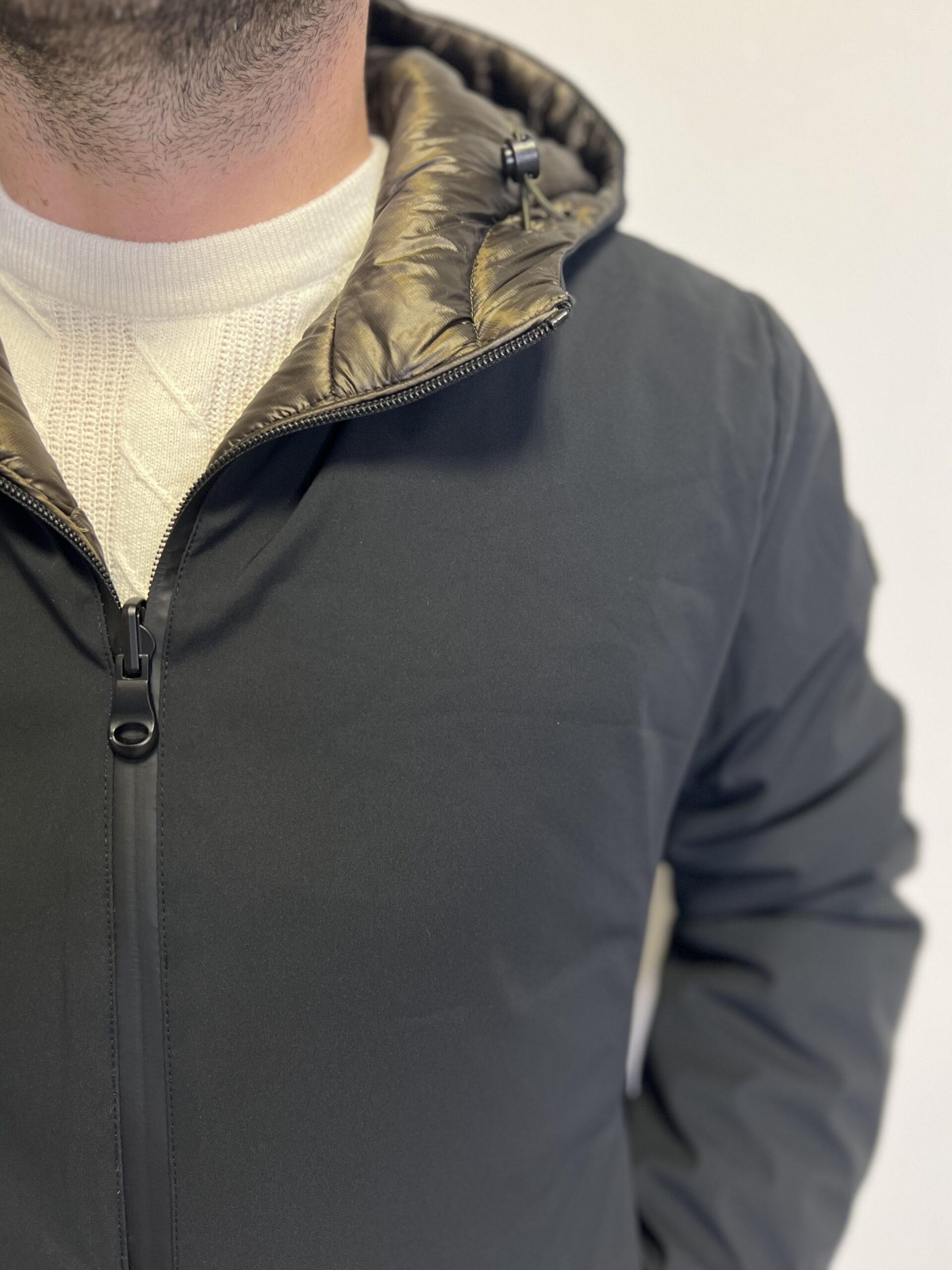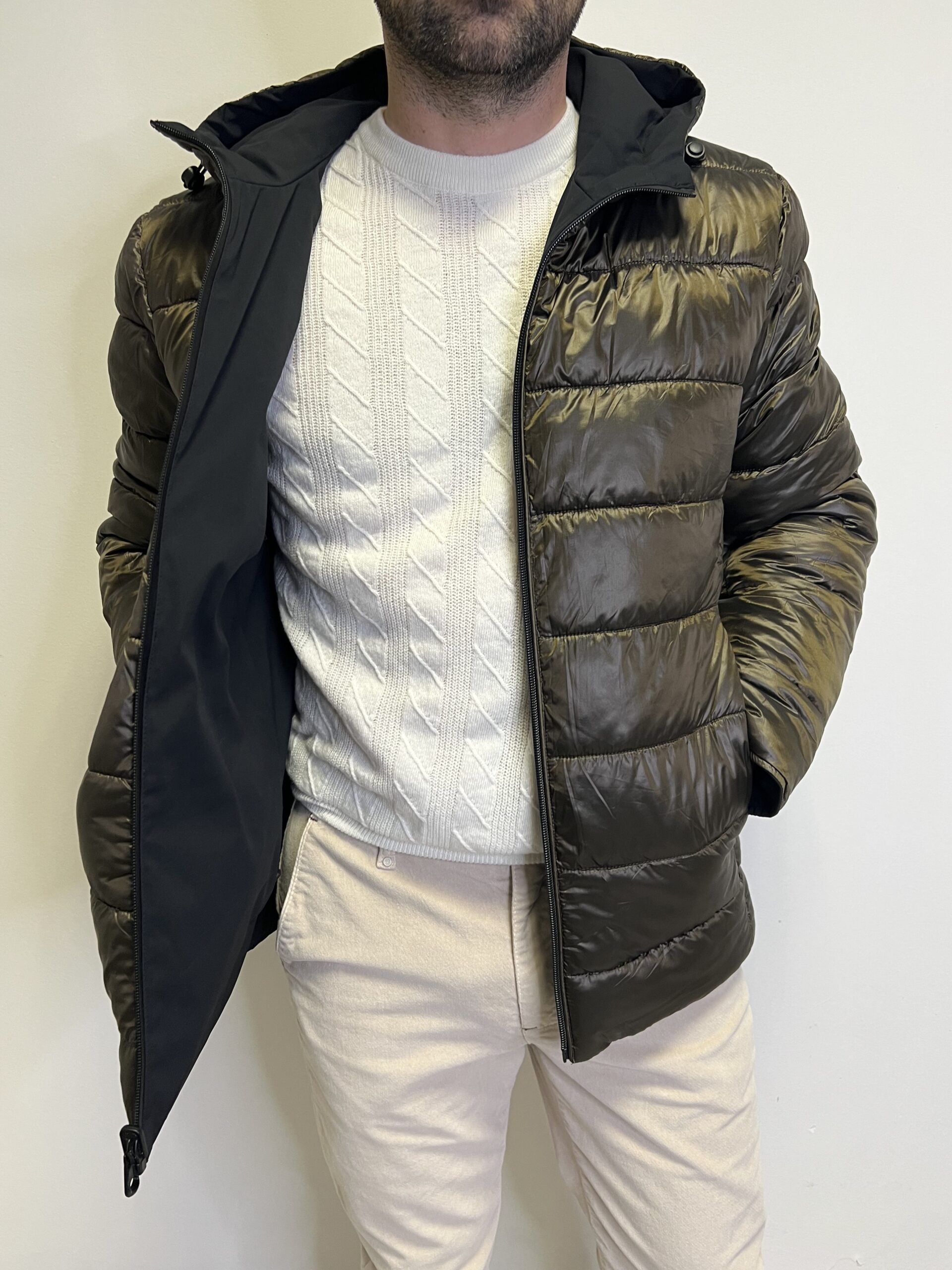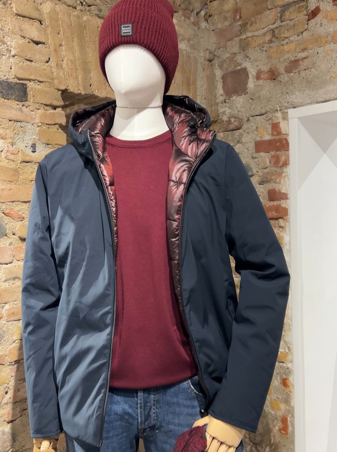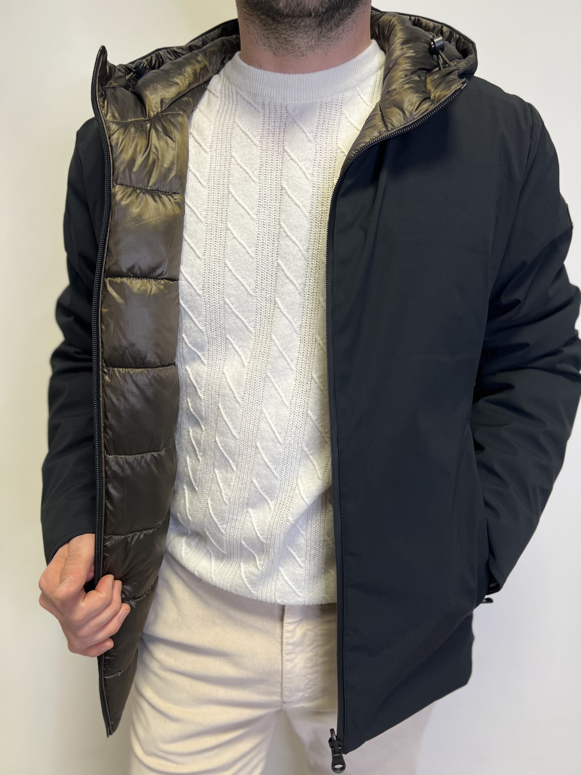 Piumino tecnico con imbottitura ecologica. Modello double face, idro-repellente a anti-vento con zip termosaldate e tasca laterale con zip nascosta. Dettaglio cappuccio con coulisse regolabile.
