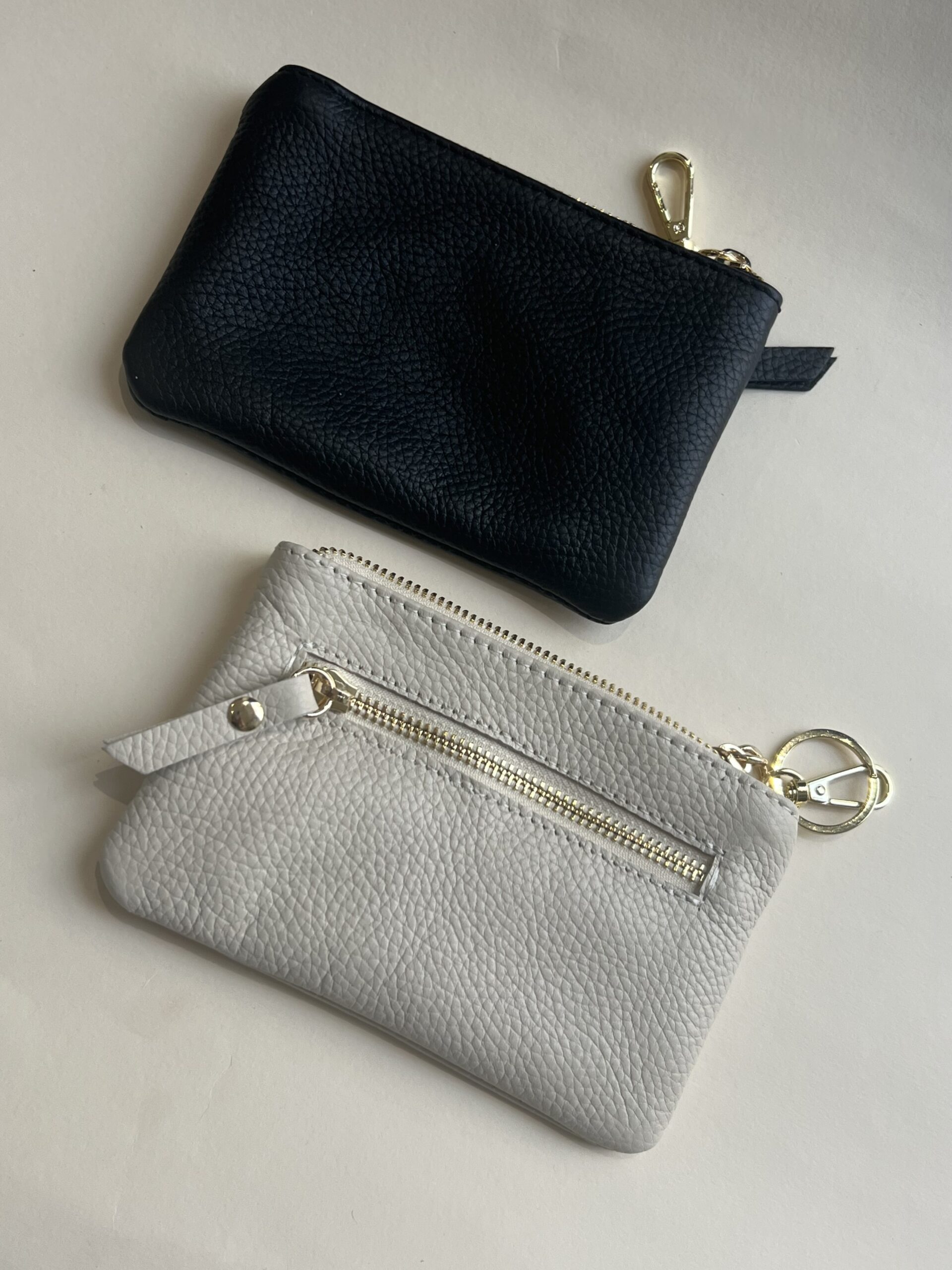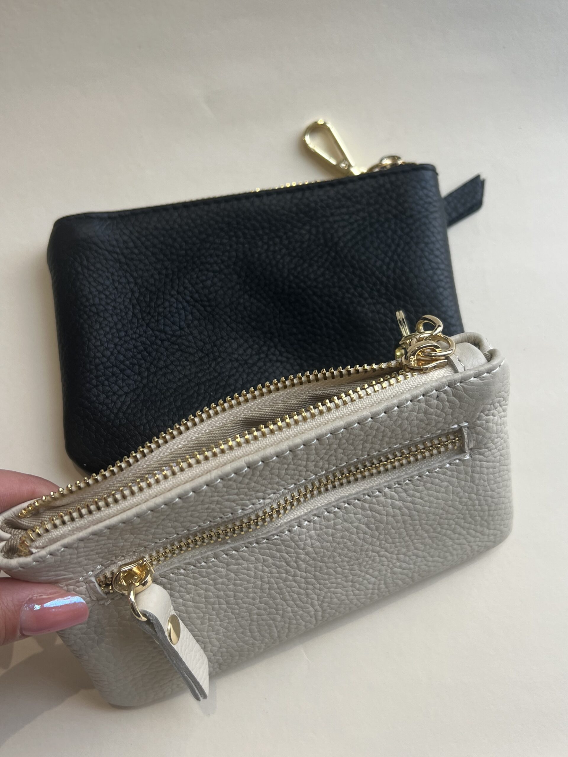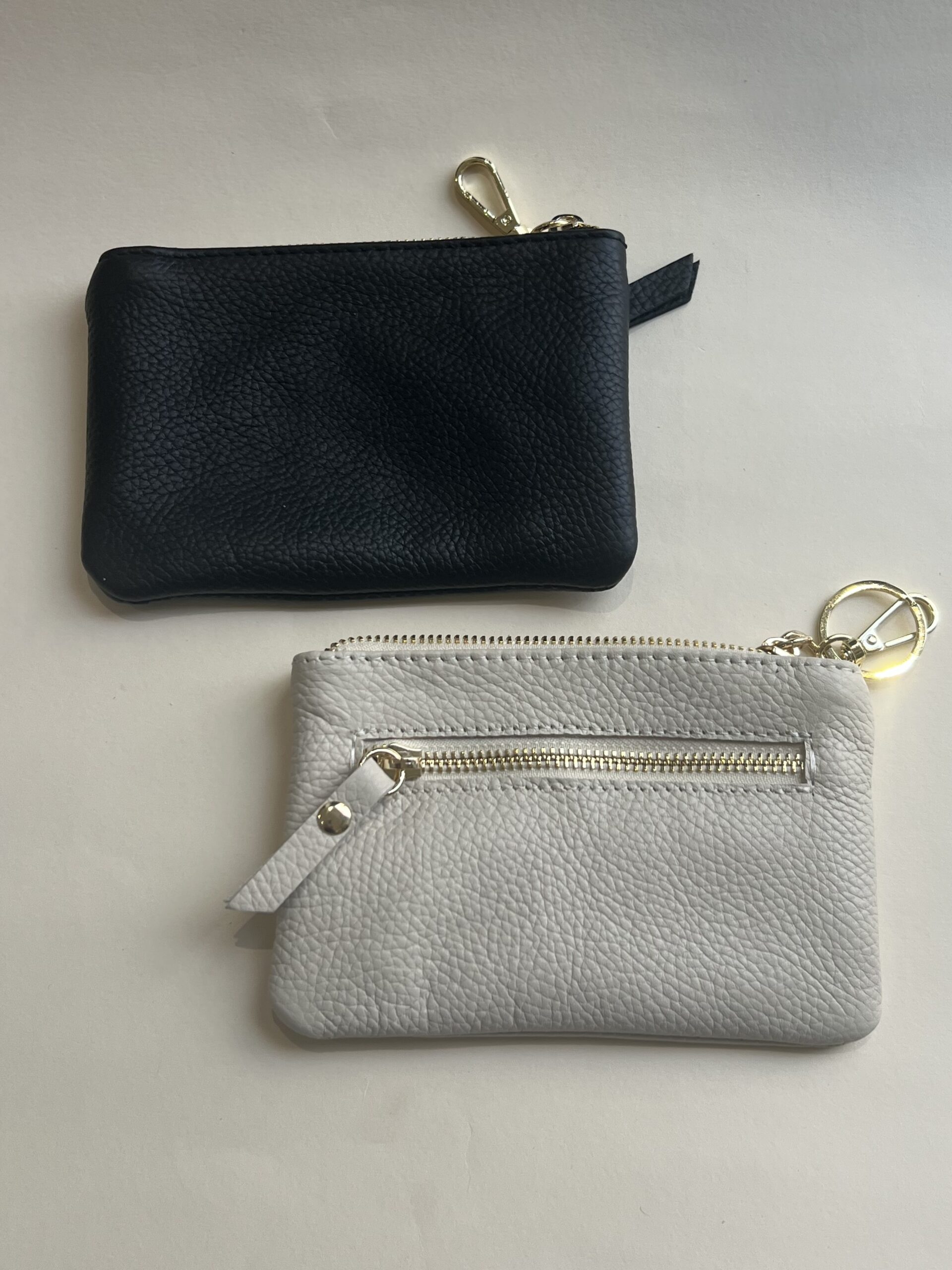 Portafogli in vera pelle con chiusura zip e tasca frontale sempre con zip. Misure 16 cm, 11 cm.