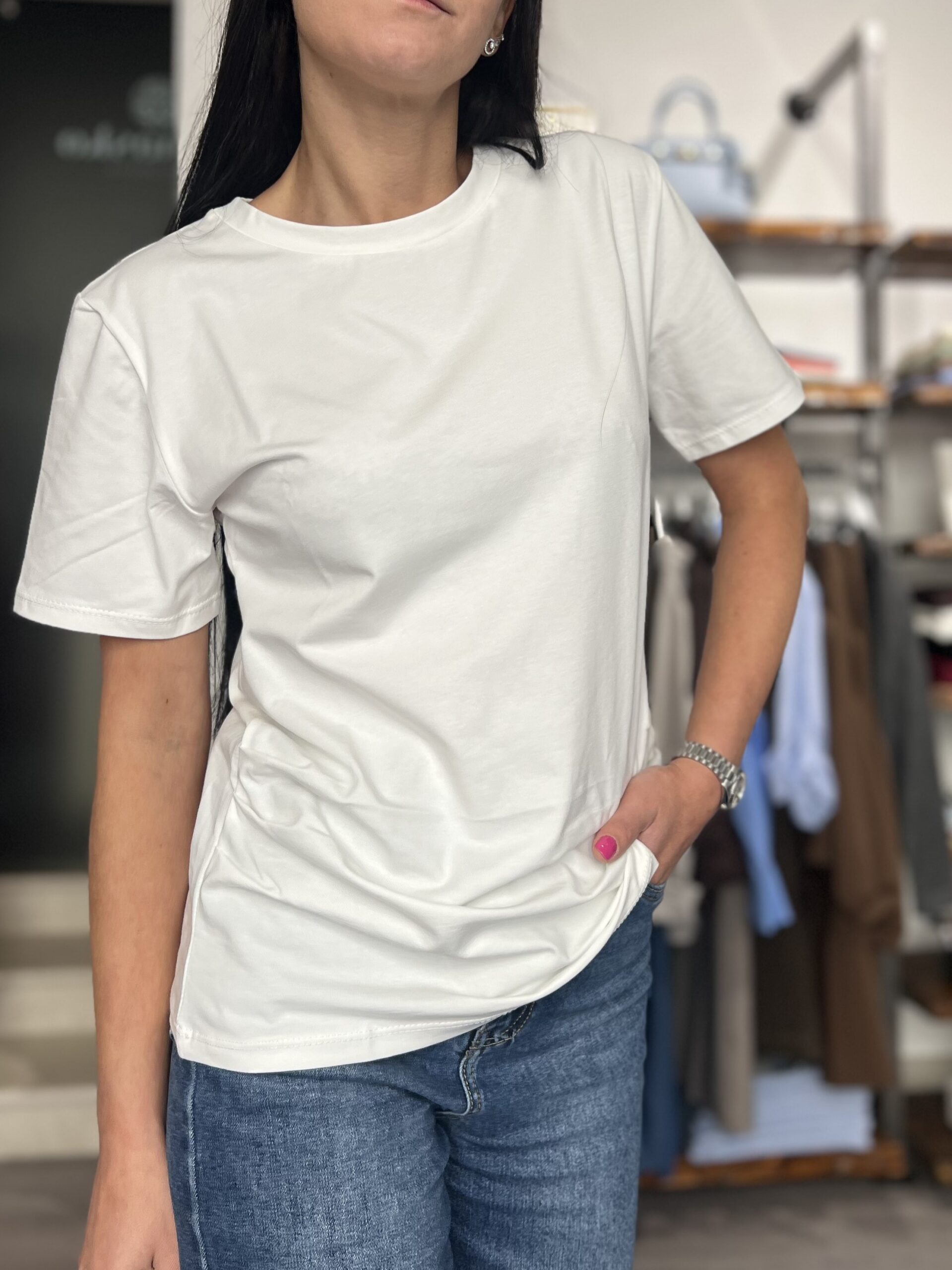 T-shirt in cotone a mezza manica, modello girocollo basico sfiancato con arricciatura laterale, lunga fino al fianco.
