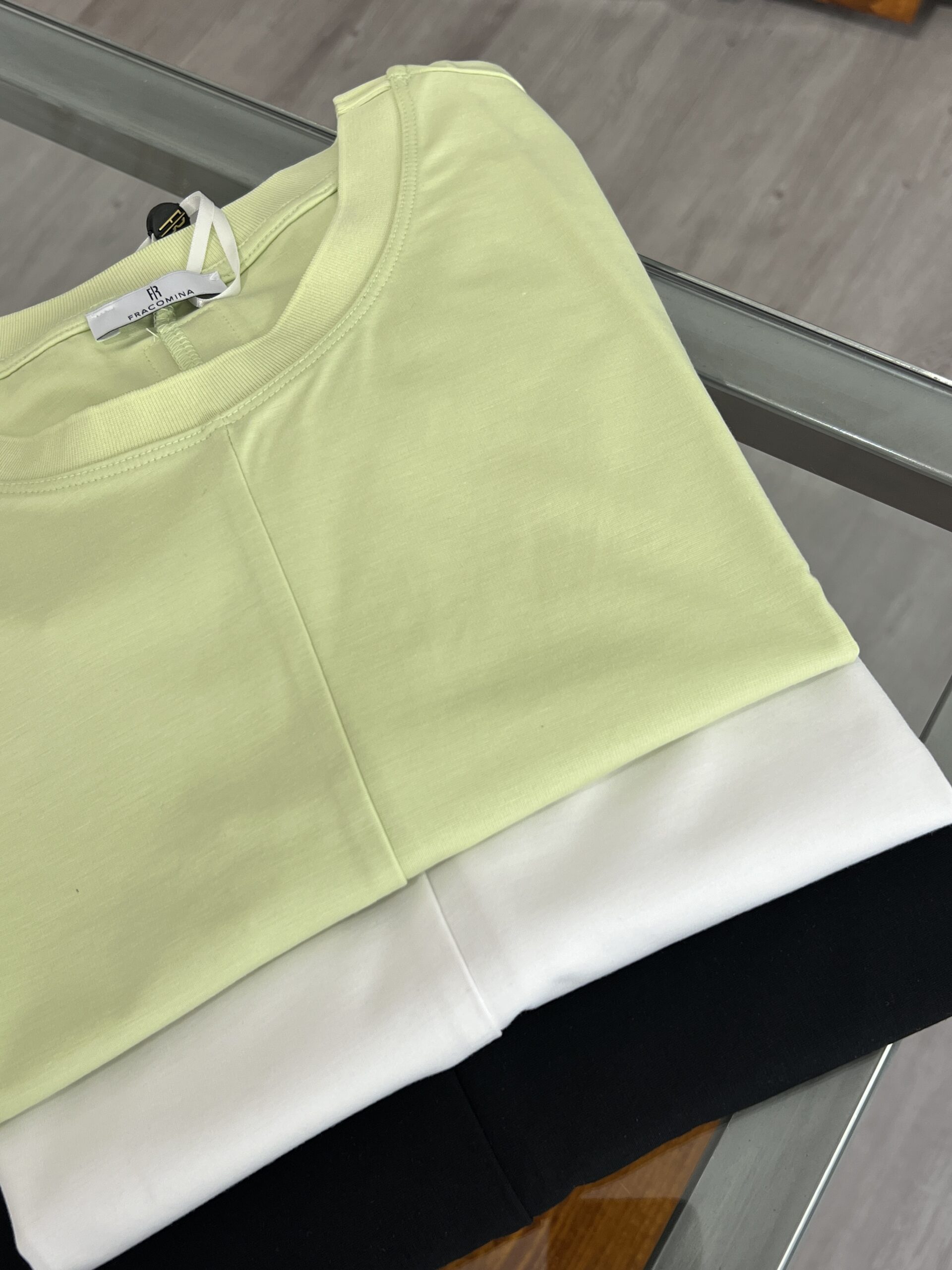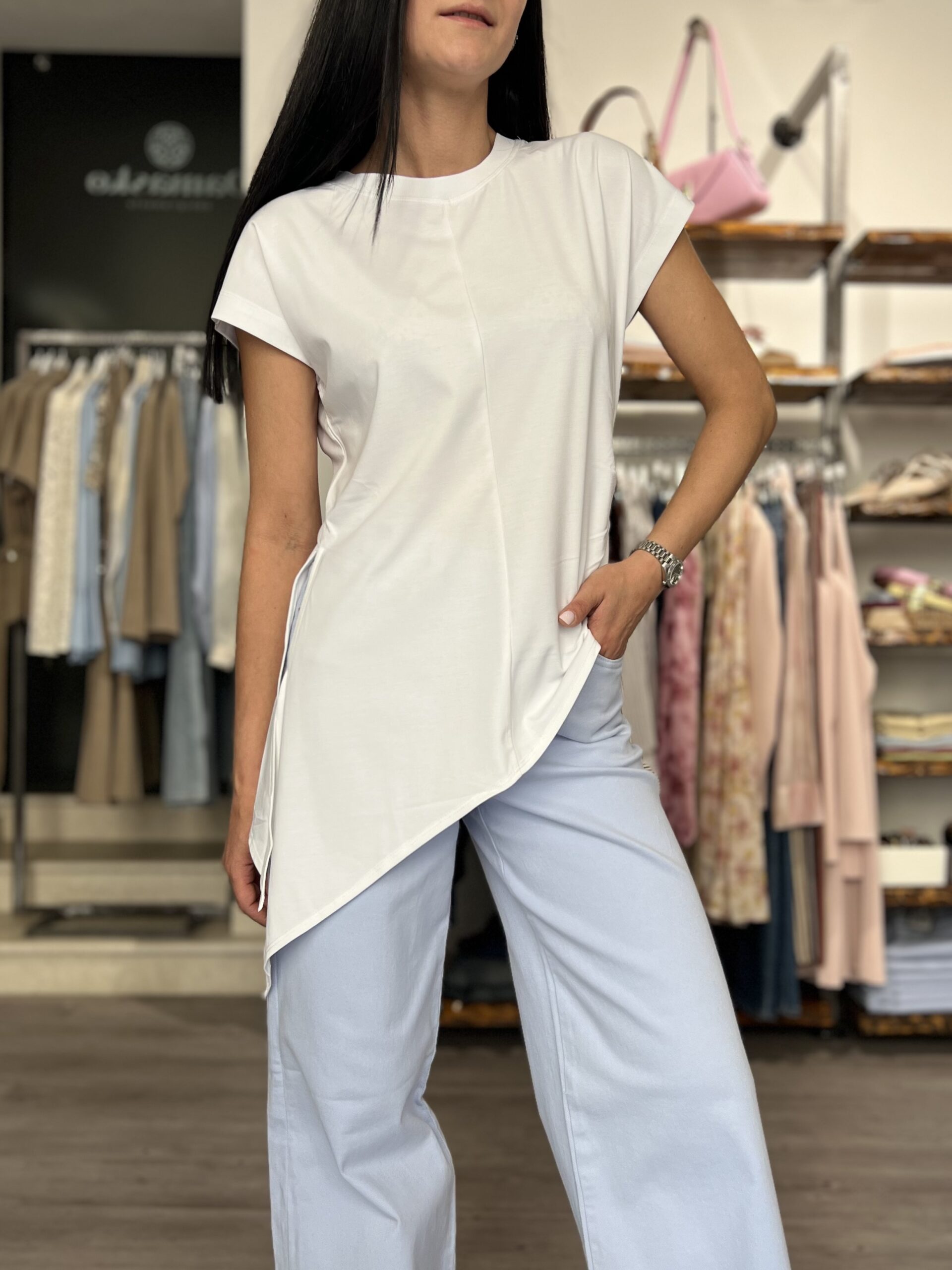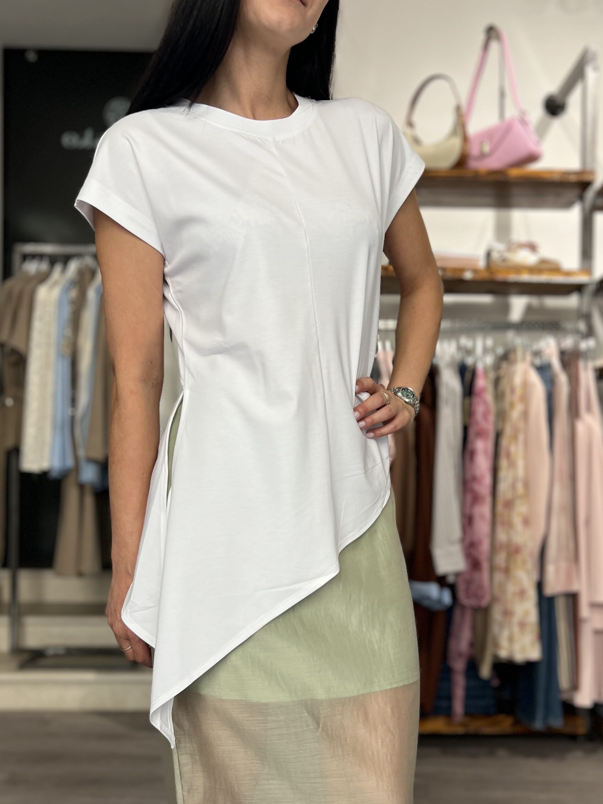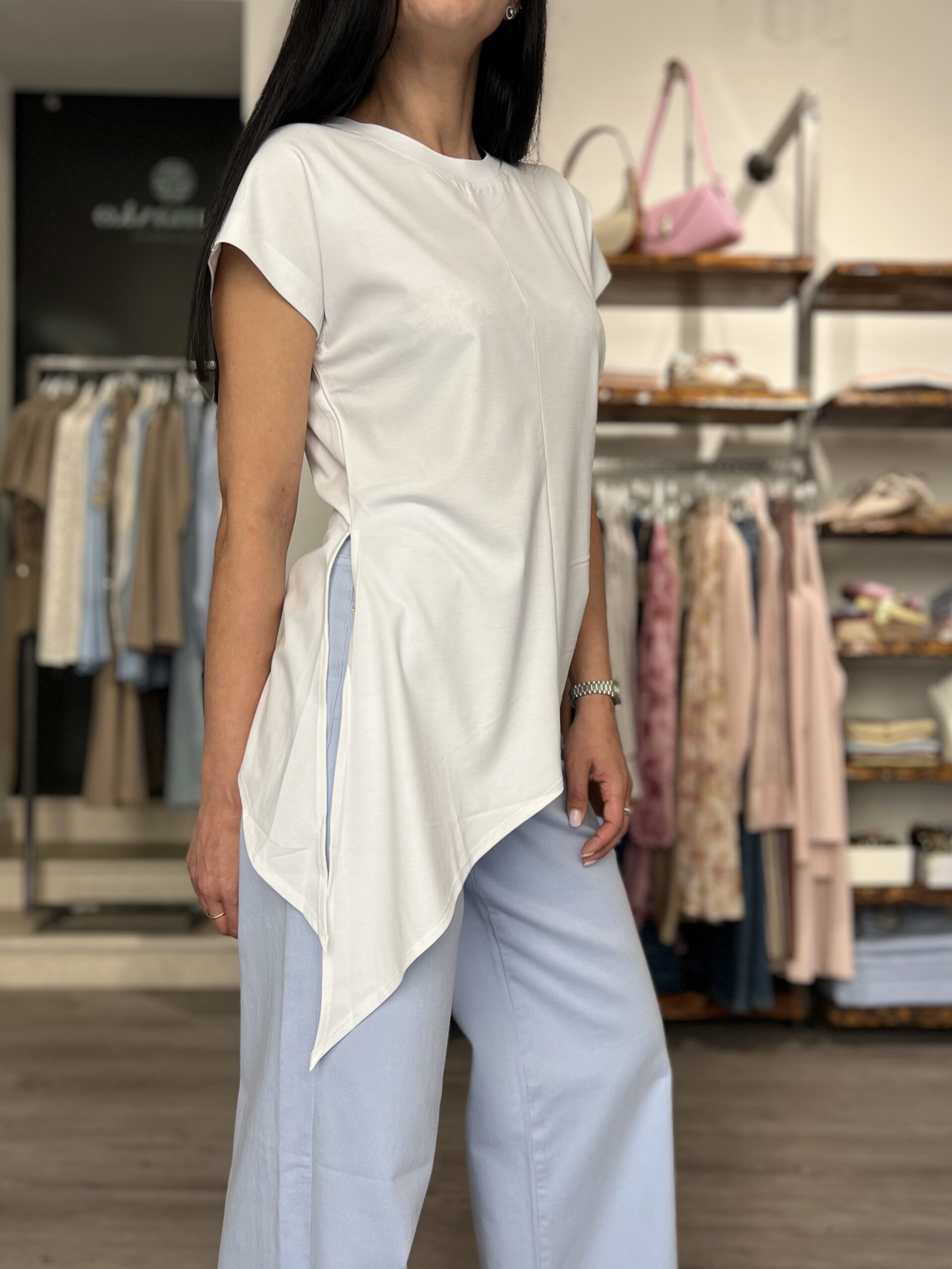 T-shirt in cotone, modello sfiancato girocollo con manica appena accennata. Asimmetrica, doppia punta dal lato più lungo.