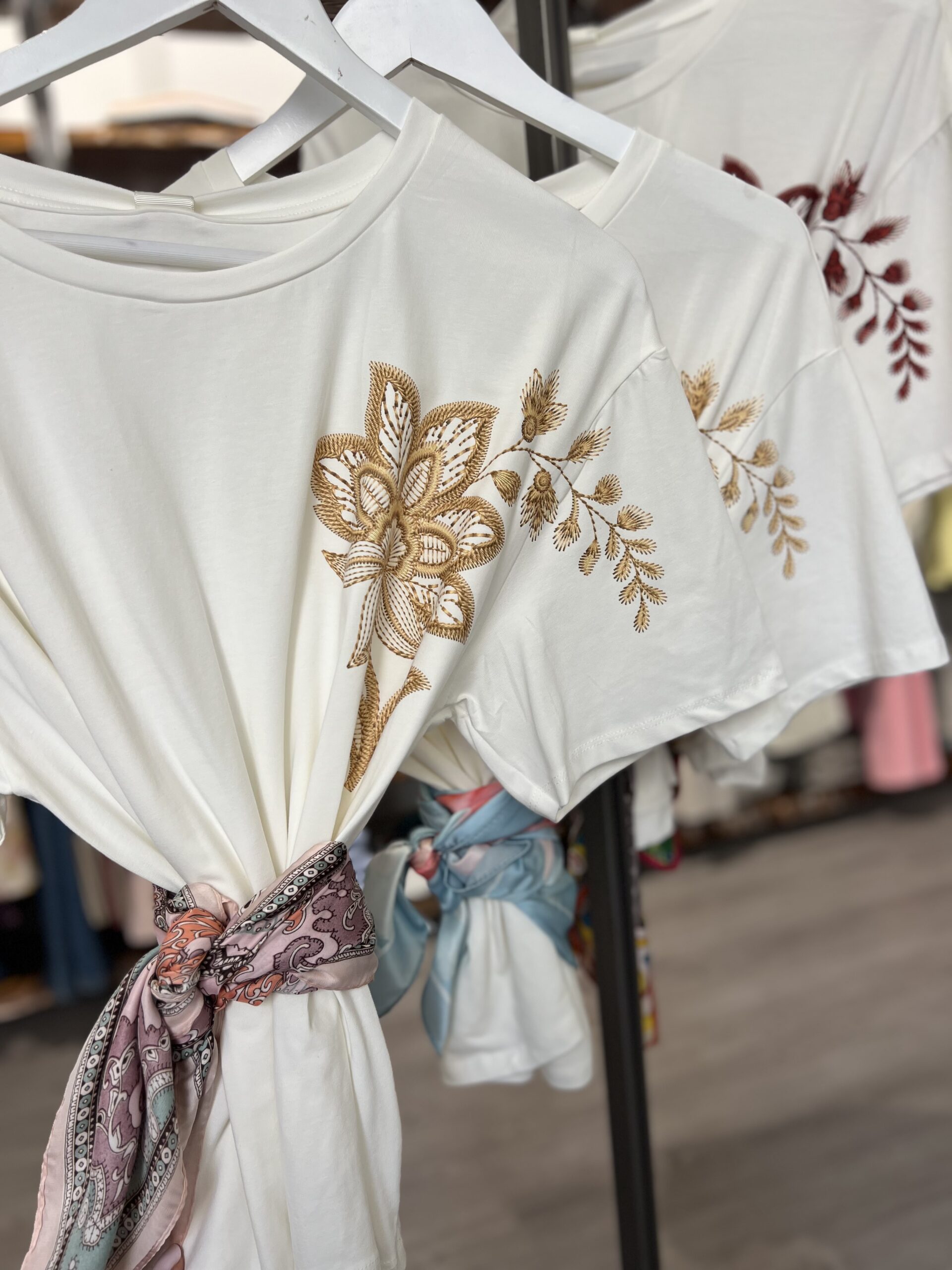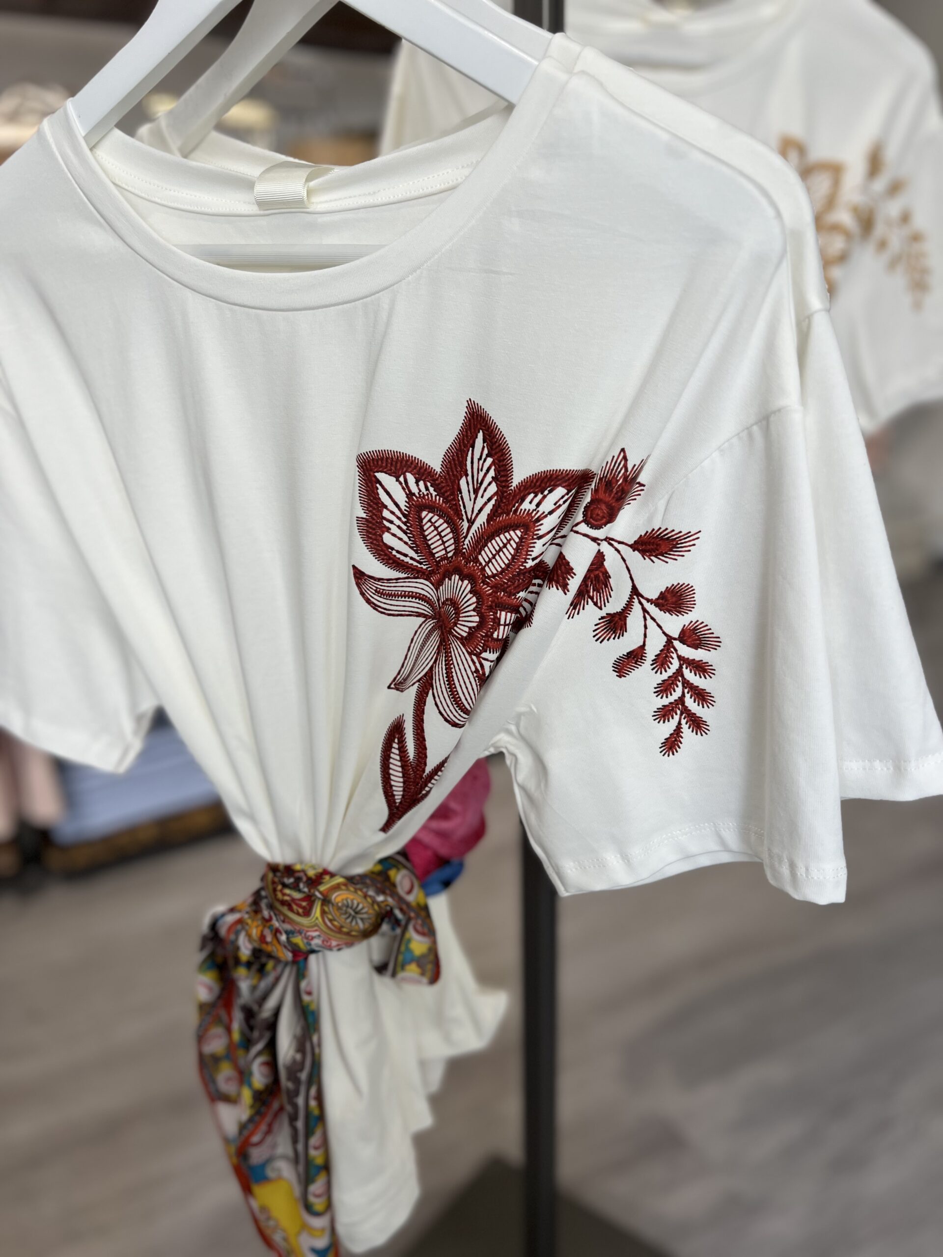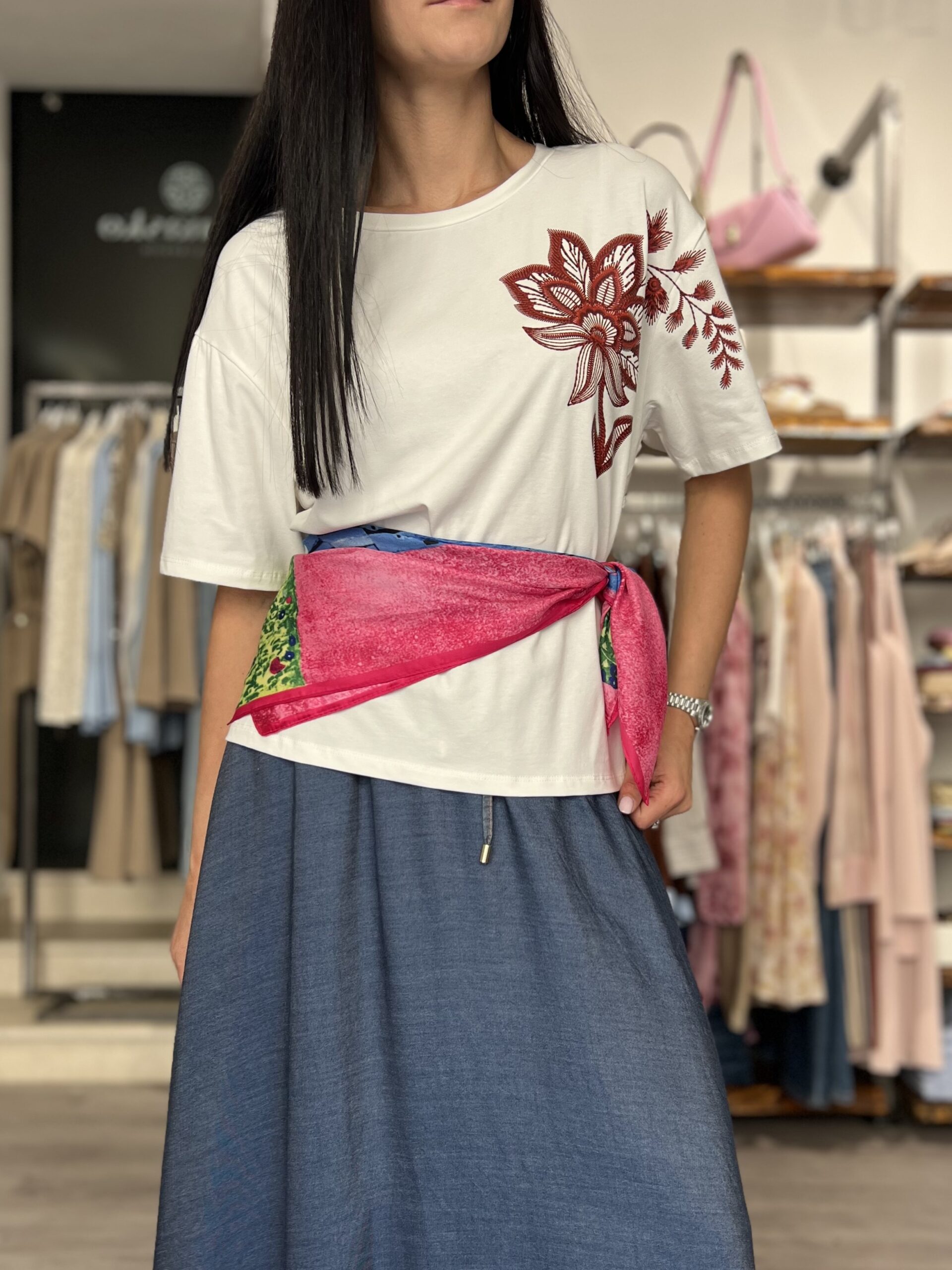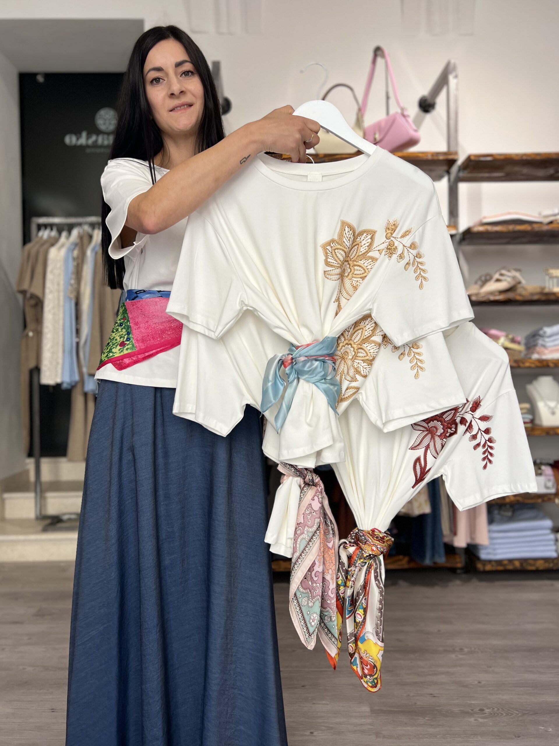 T-shirt in cotone, modello girocollo dalla linea leggermente più ampia sopra e più regolare sul fondo. Incluso il foulard separato in diverse fantasie. La taglia S veste 38/42 e M 444/46.