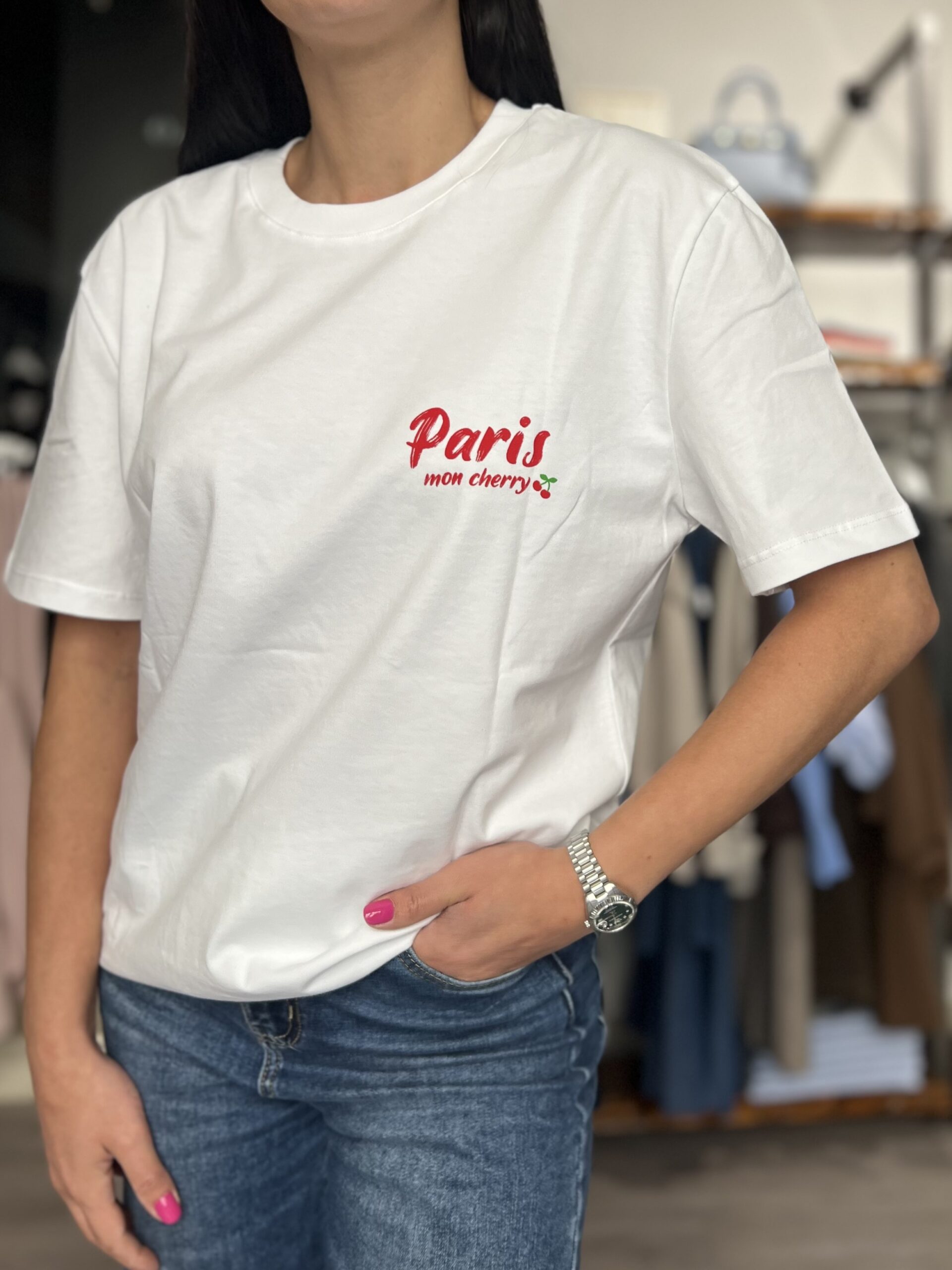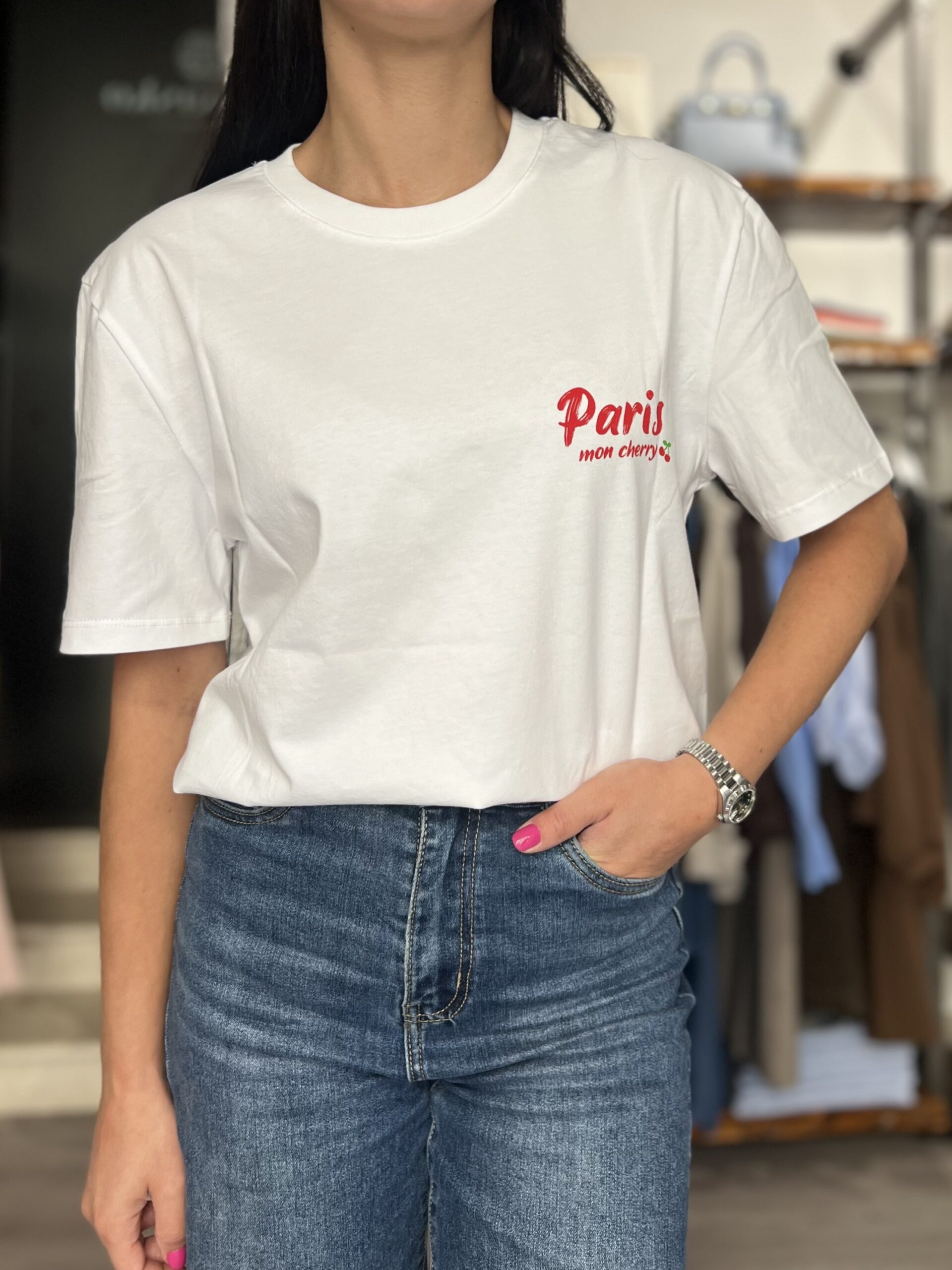 T-shirt modello ampio in cotone con stampa sul retro. Taglia unica veste fino alla L.