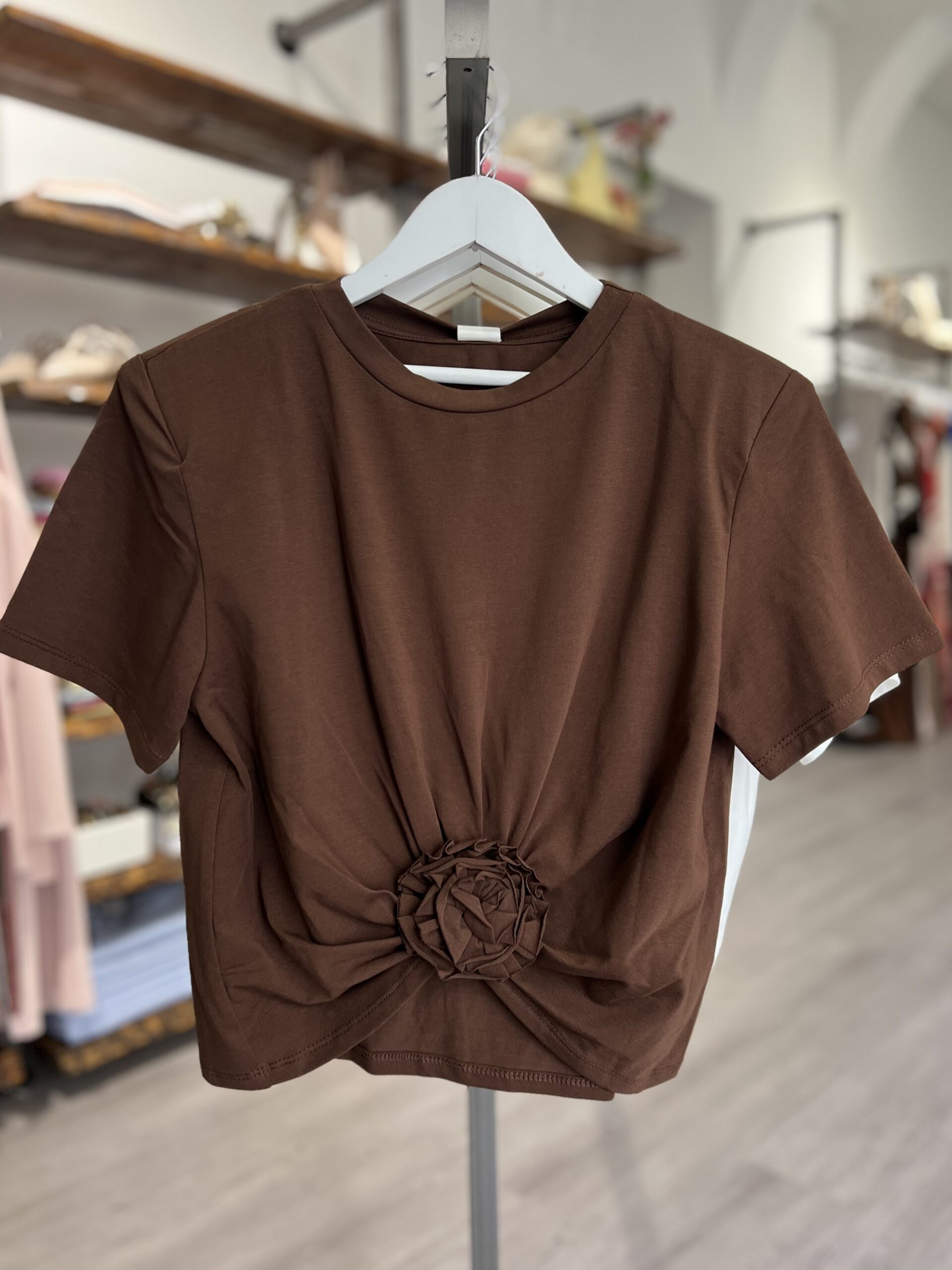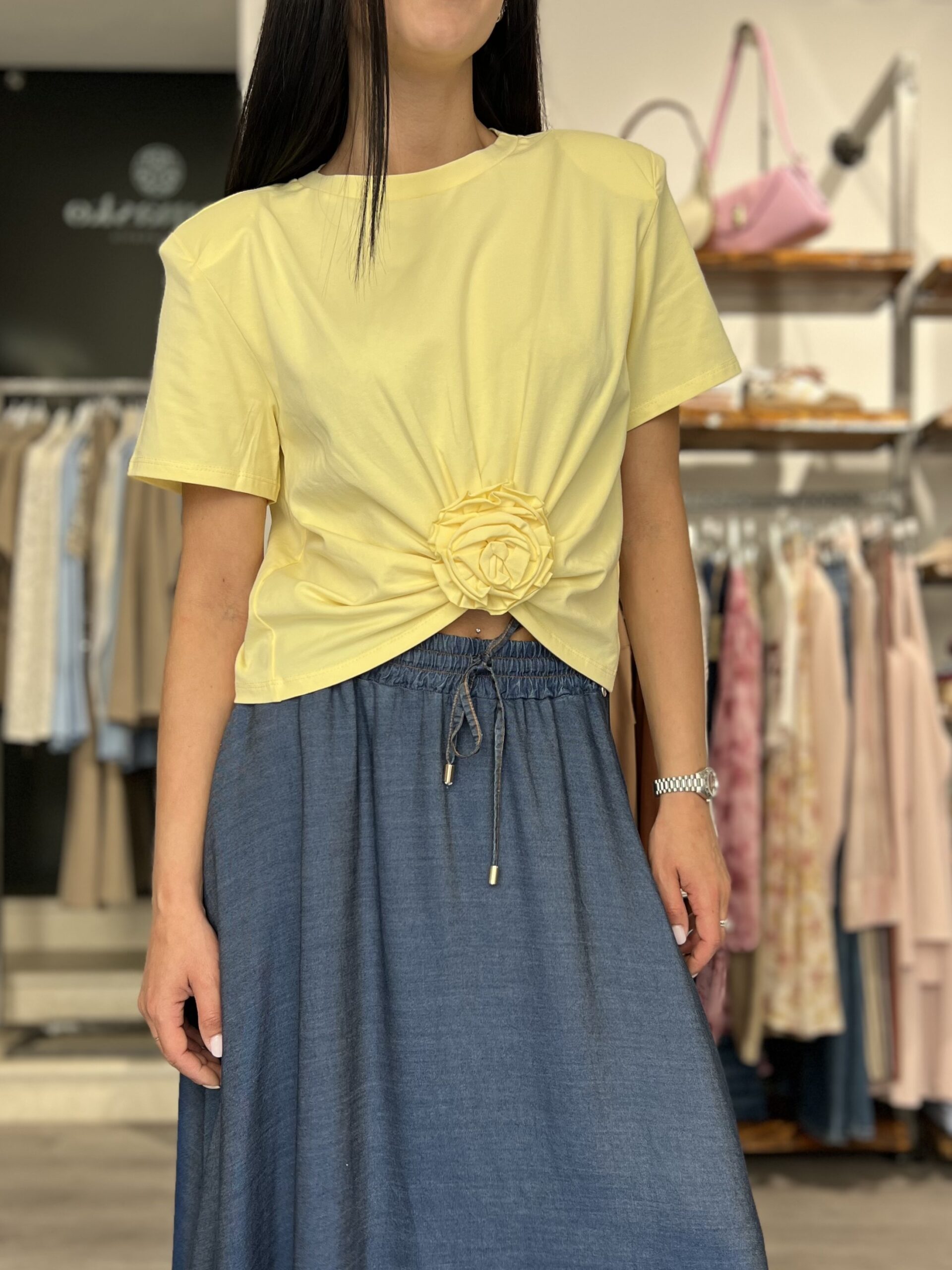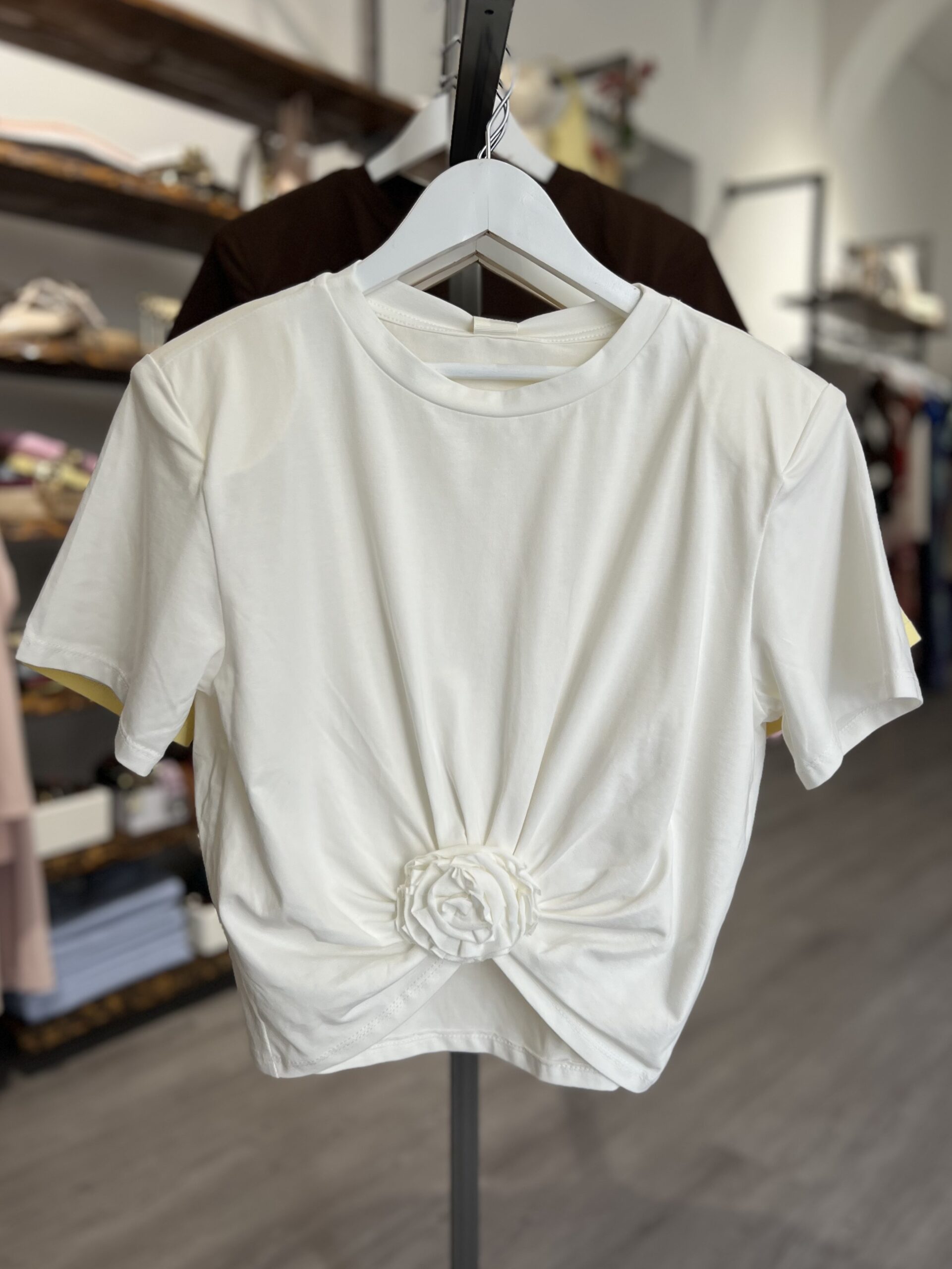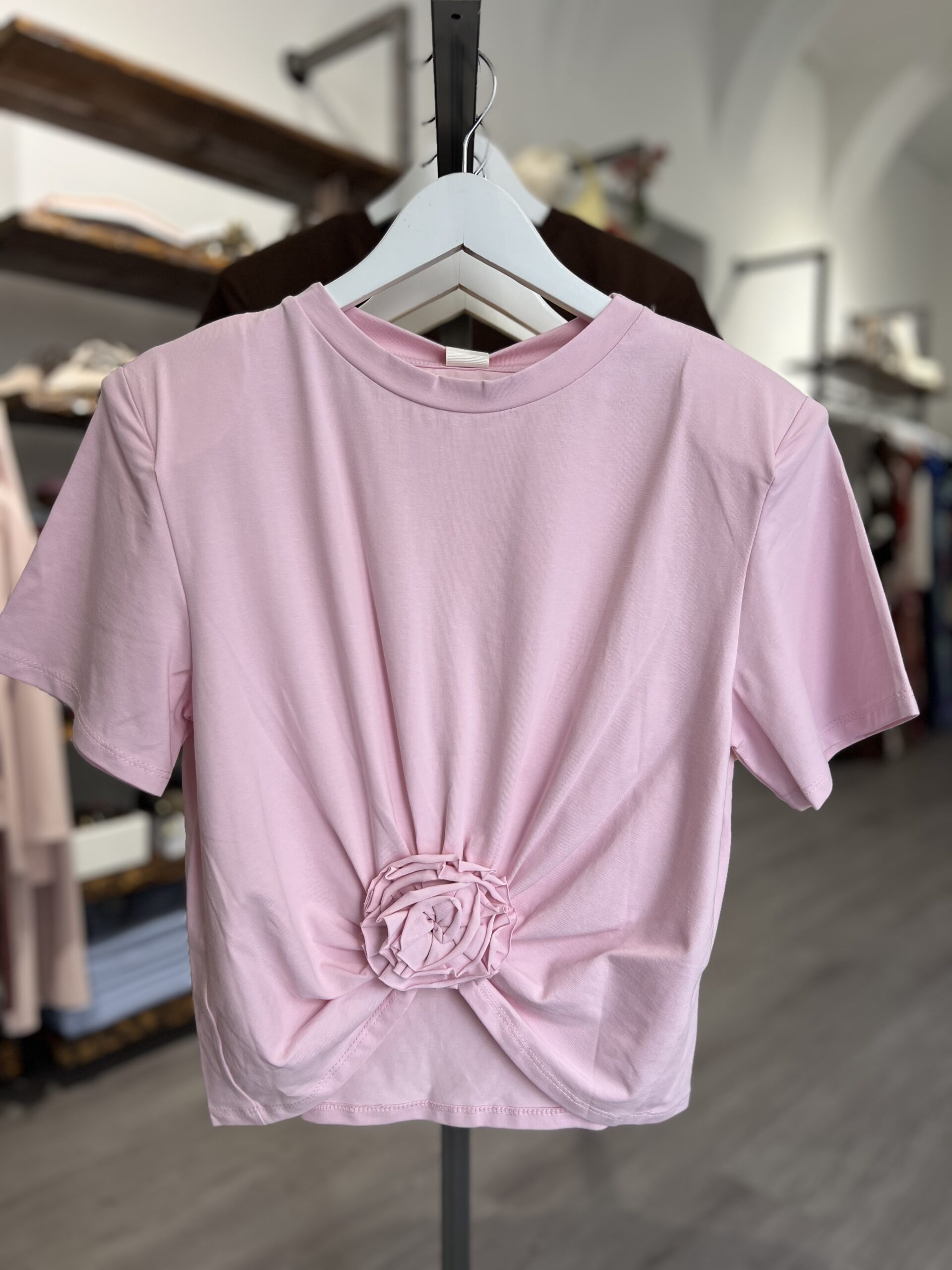 T-shirt in cotone, modello girocollo sfiancato con spallina imbottita e rosa centrale.