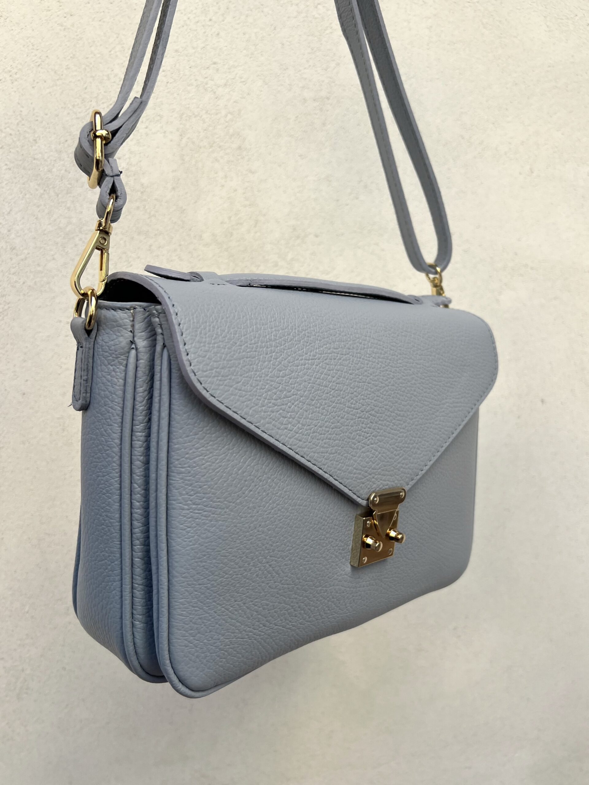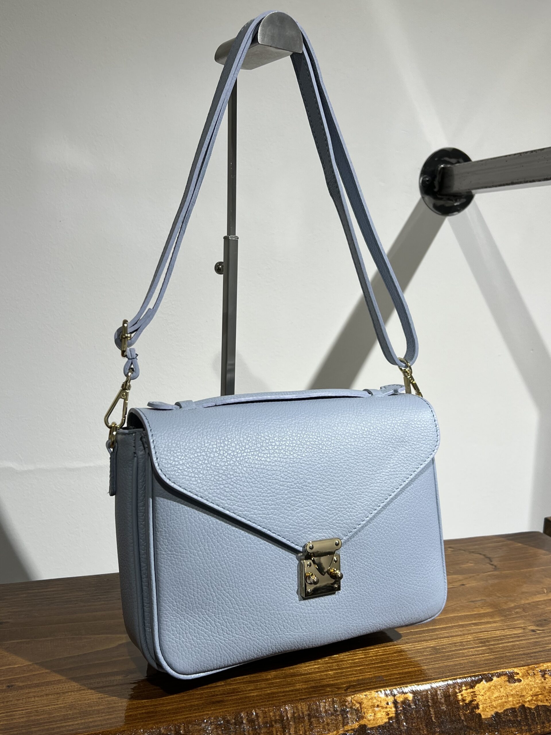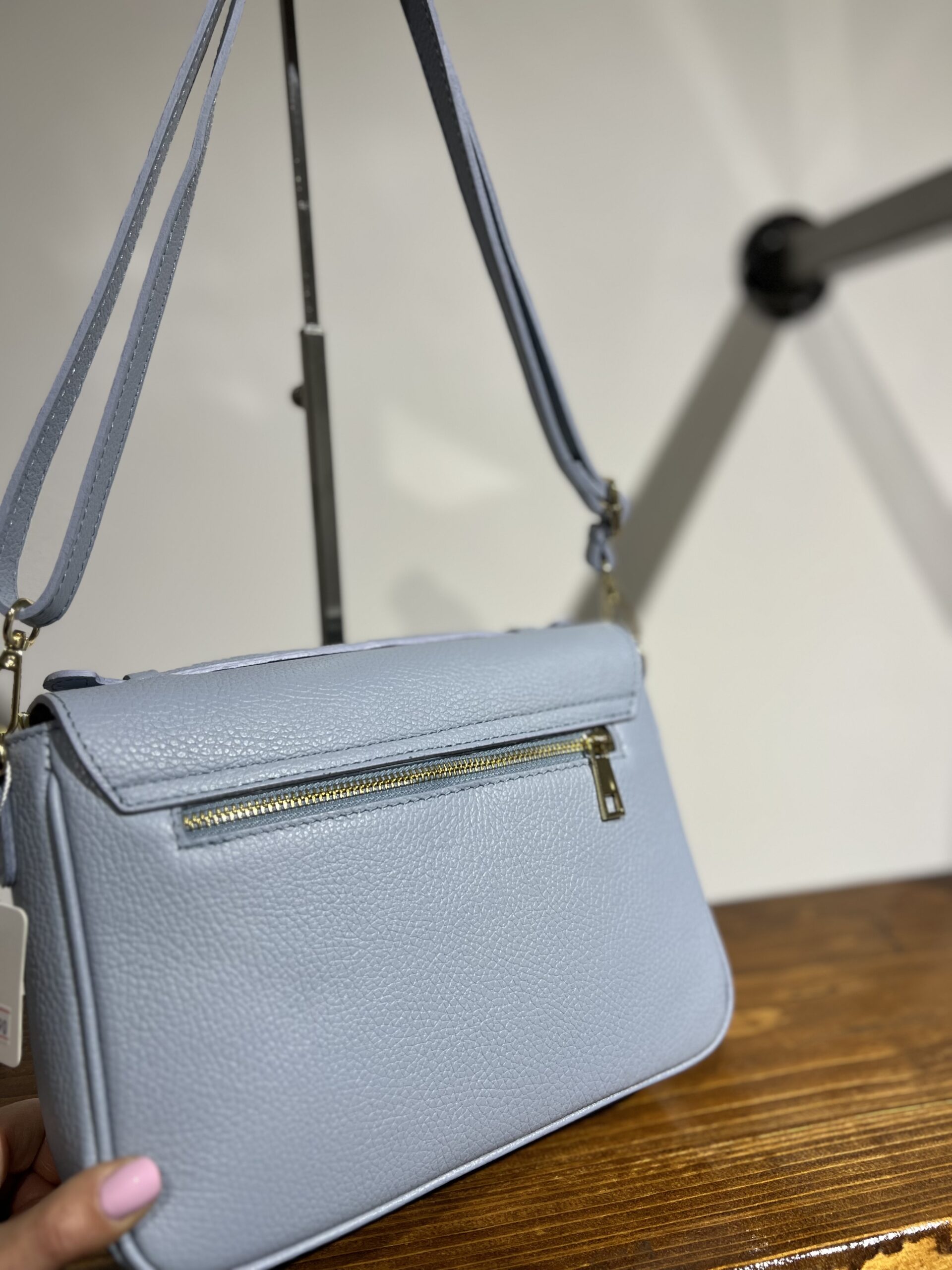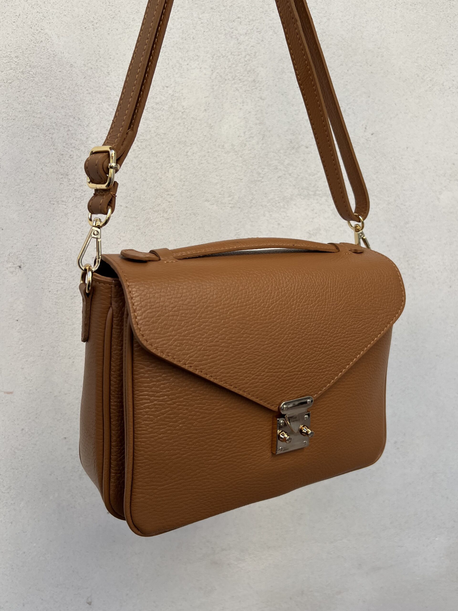 Tracolla in vera pelle, modello capiente e compatto con doppio scomparto interno, quello più grande chiuso da zip.