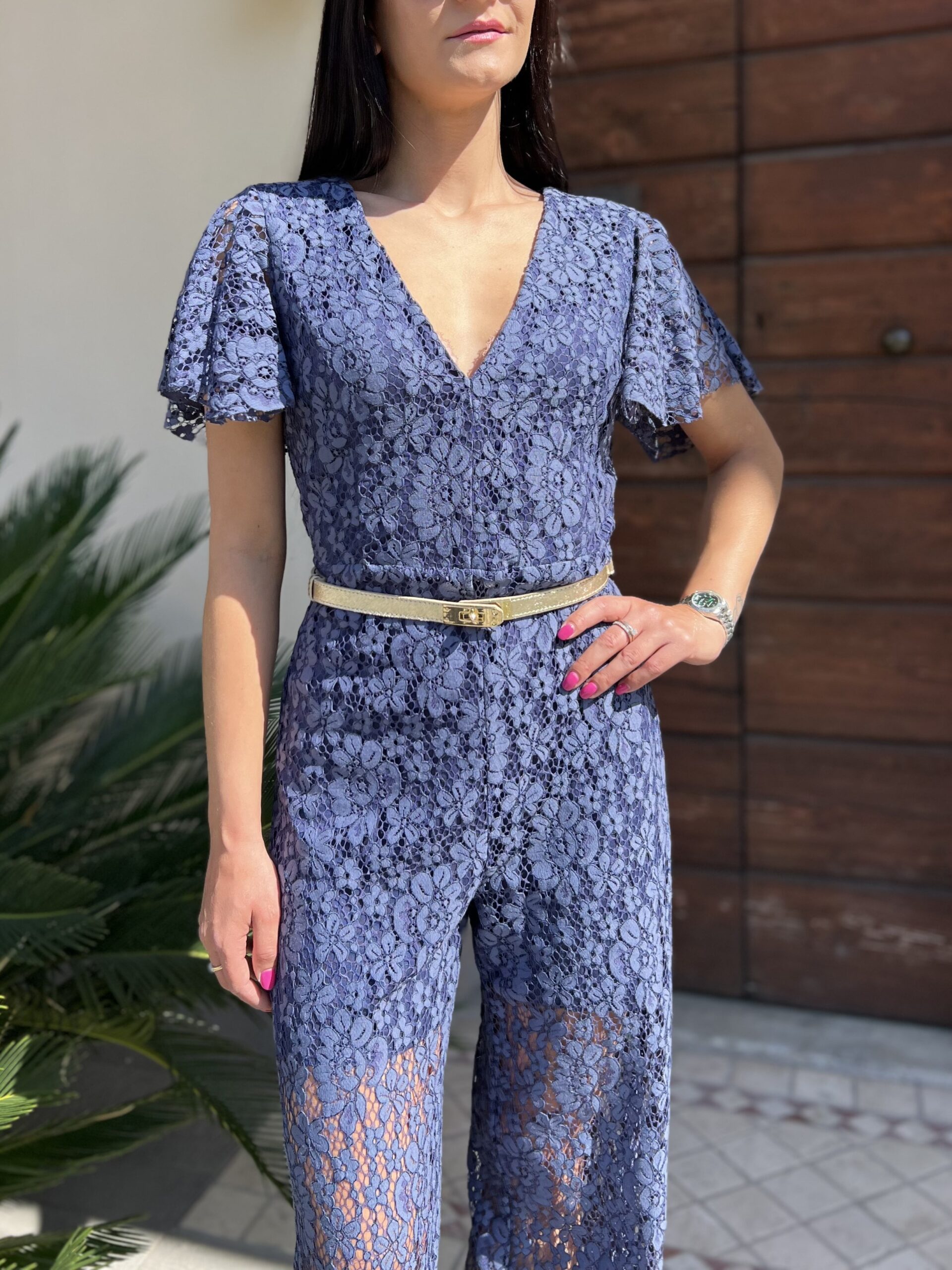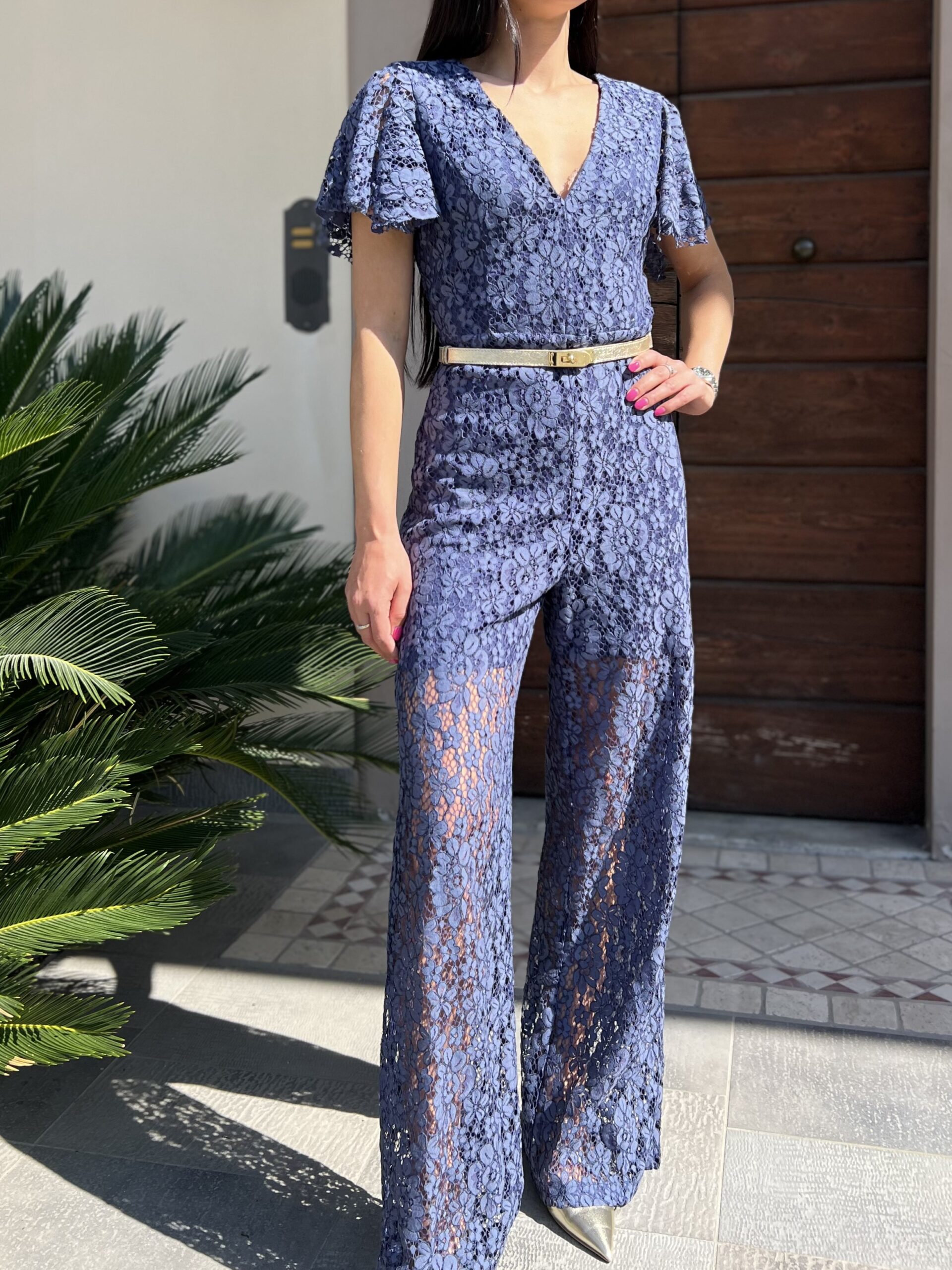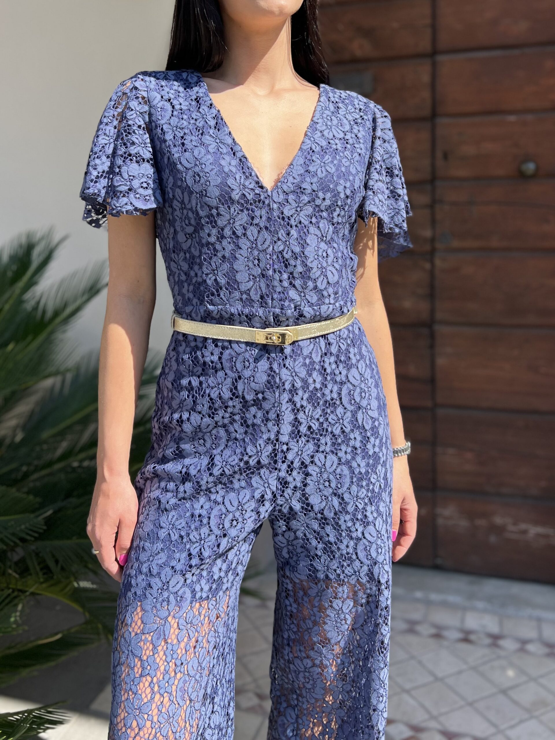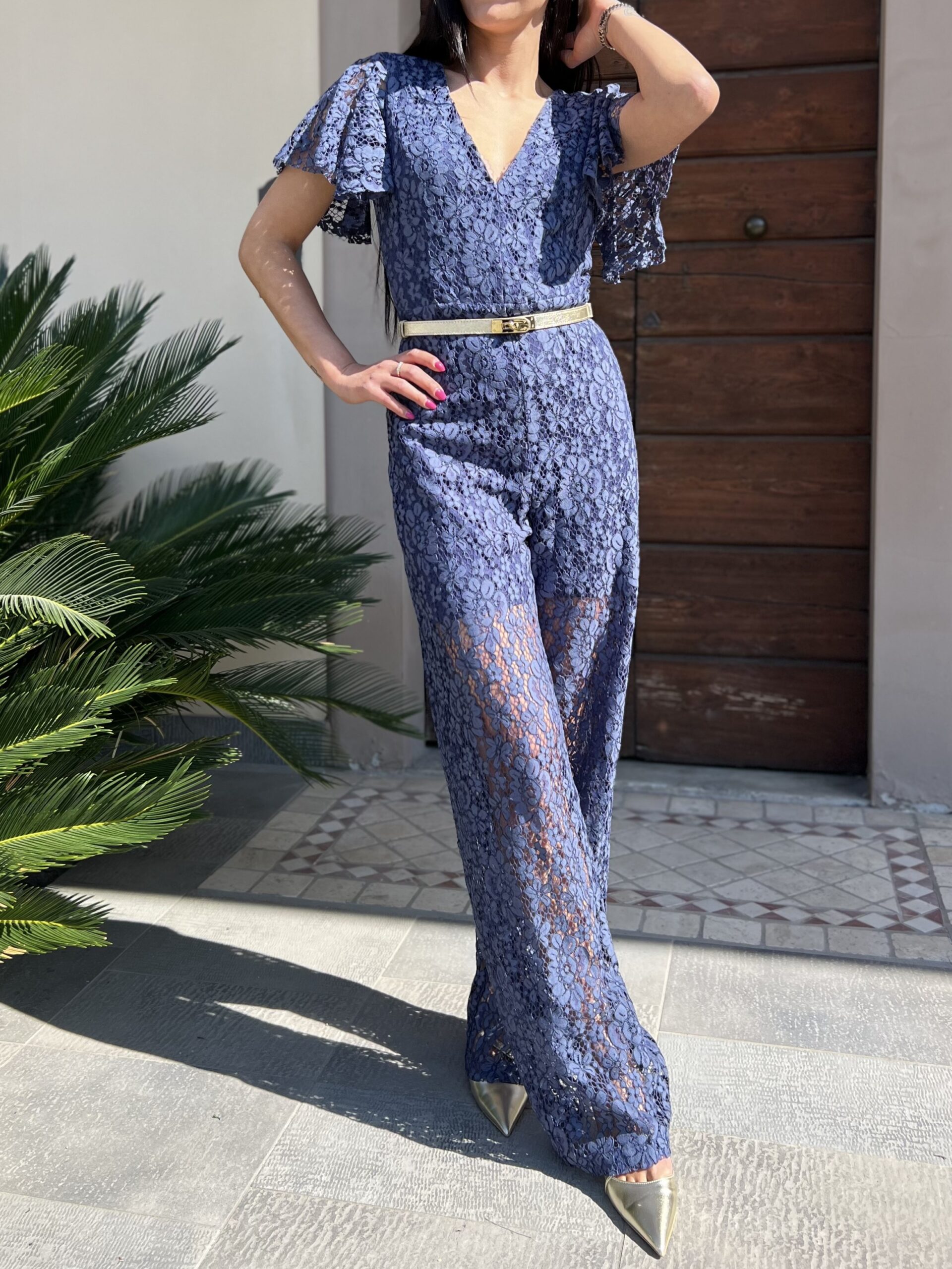 Tuta intera in pizzo con manica a farfalla. Foderata con chiusura zip sul retro. Pizzo in 50% cotone, 35% nylon, 15 % viscosa, fodera in poliestere.