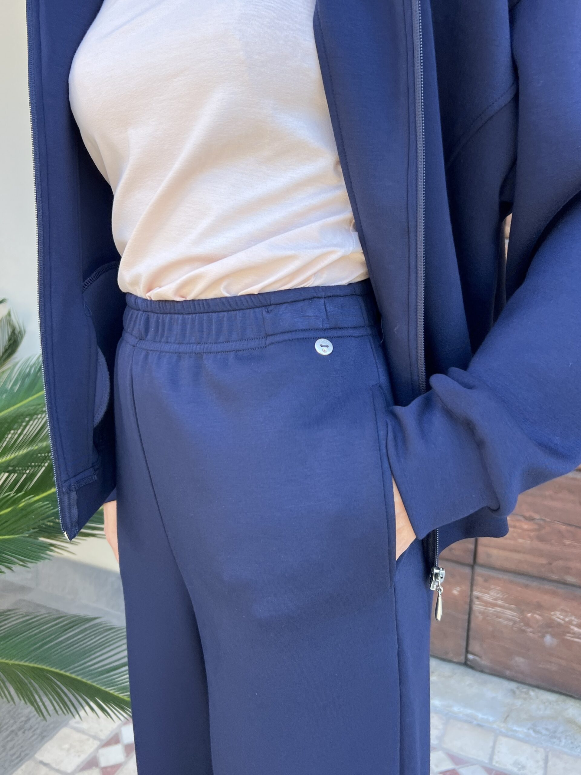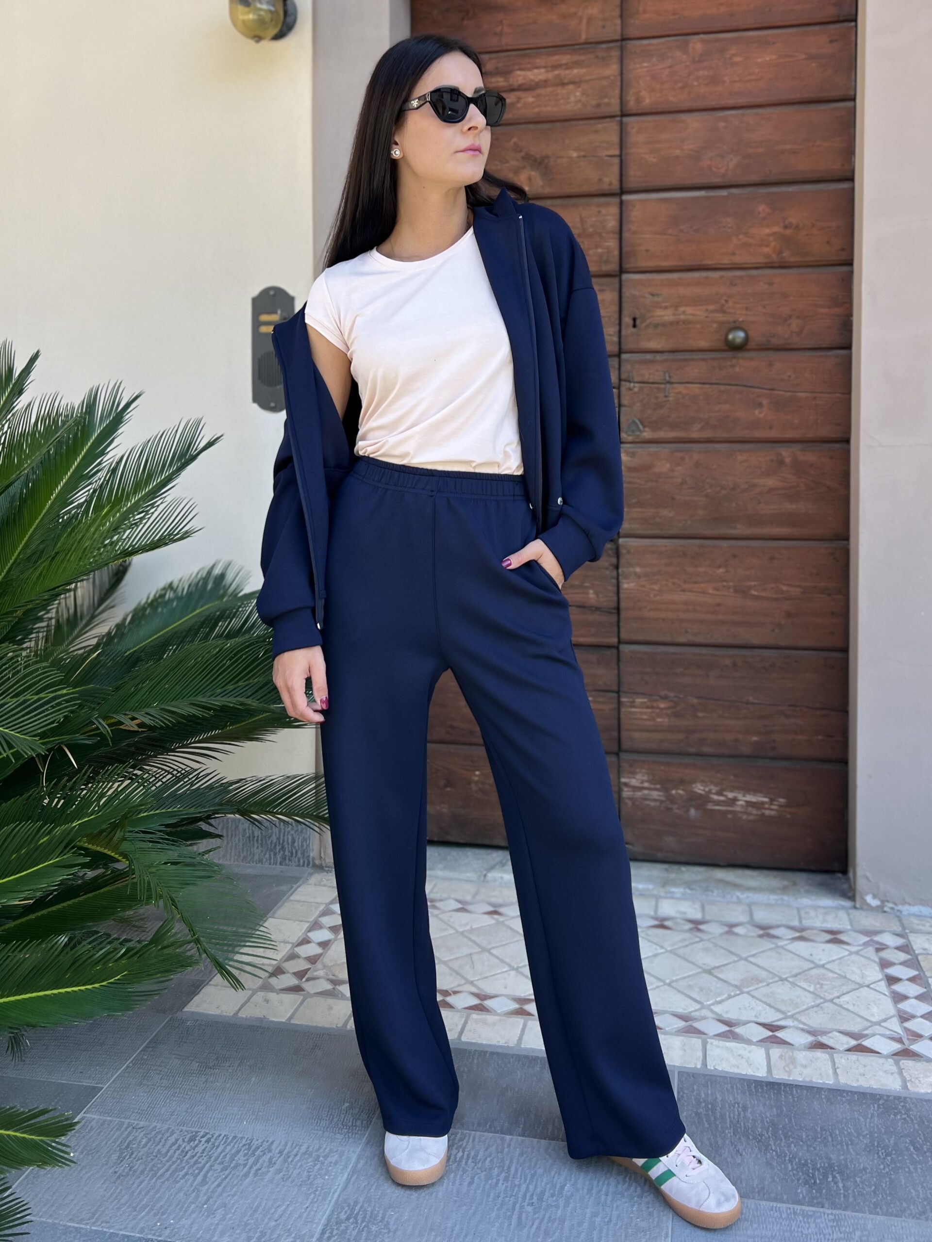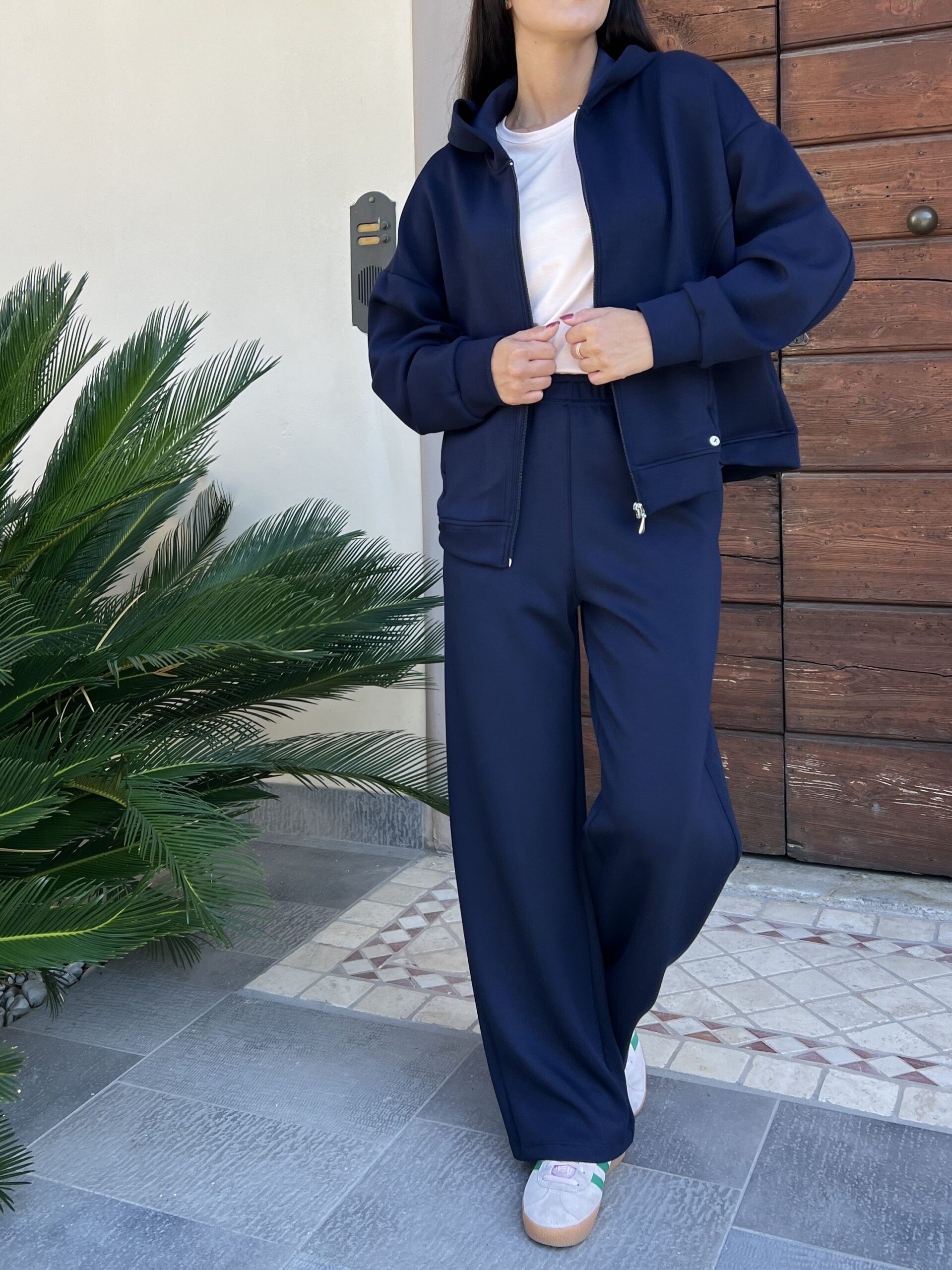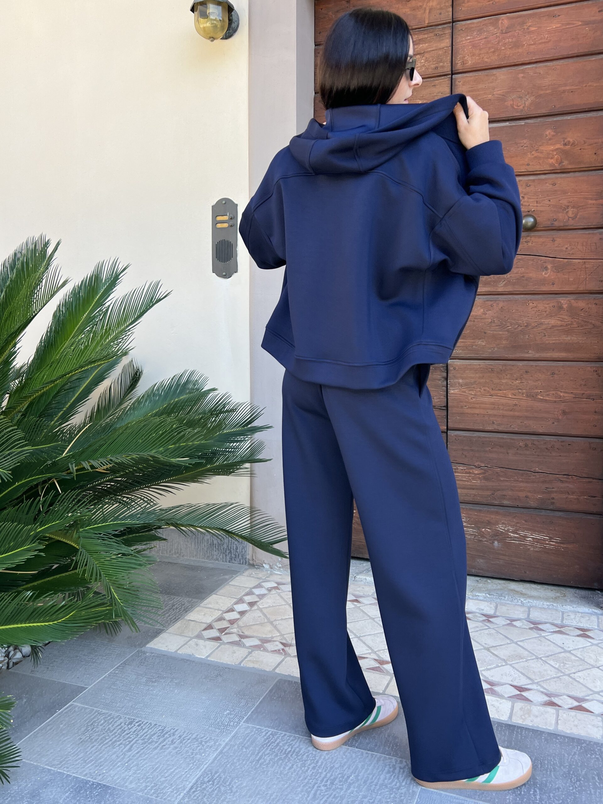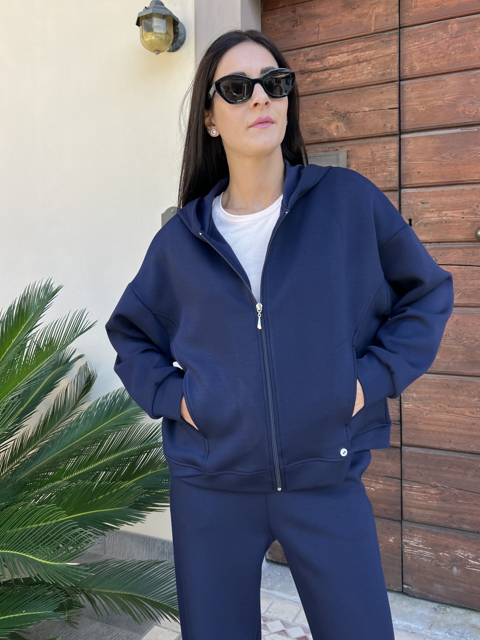 Tuta completa in tessuto di medio peso morbidissimo al tatto in misto viscosa. Pantalone dal taglio dritto con elastico in vita e tasche laterali. Felpa con cappuccio dal taglio leggermente a scatoletta, con zip e tasche. La taglia XS veste 38/40, S per 40/42 e M per 44/46.