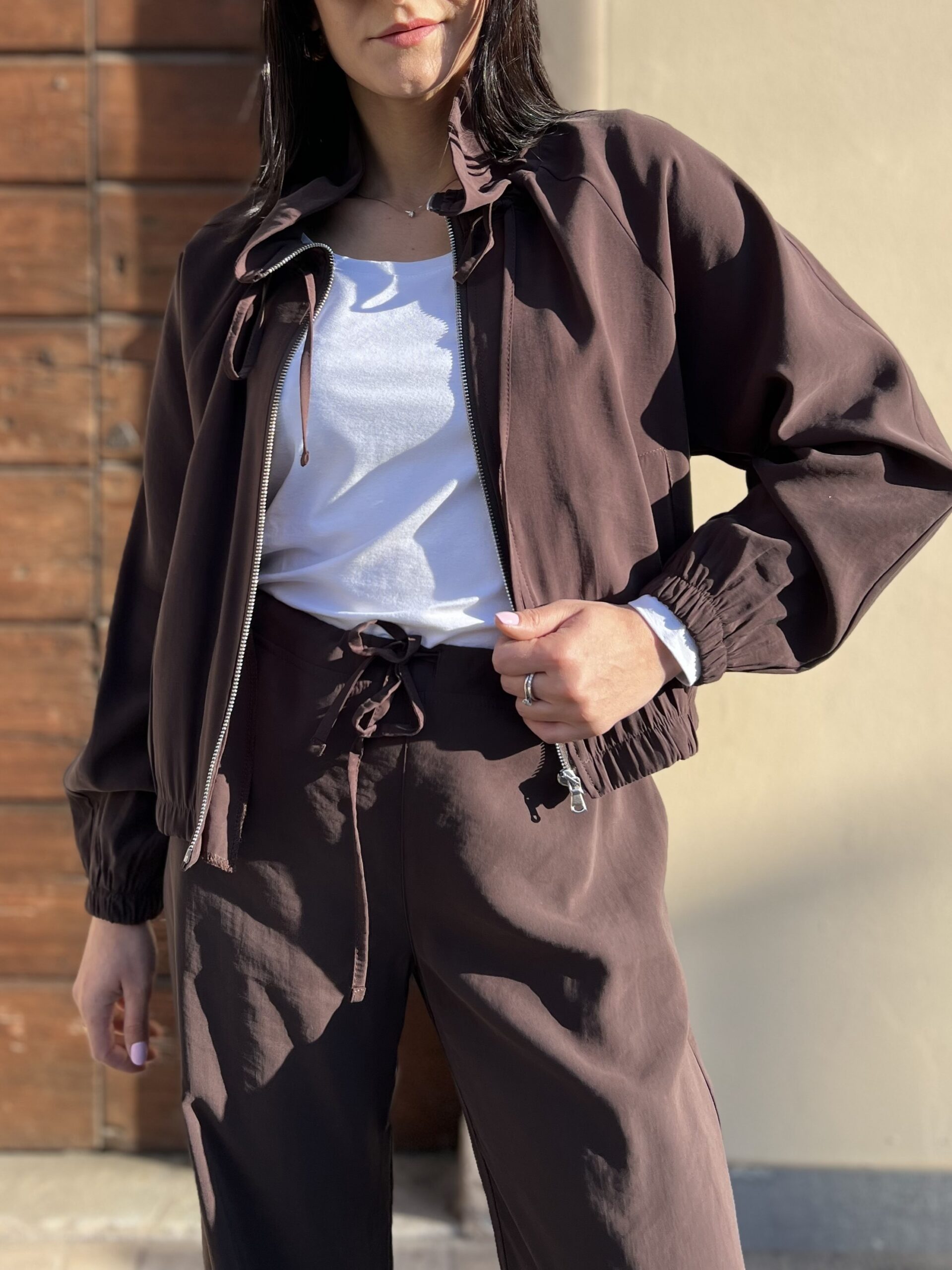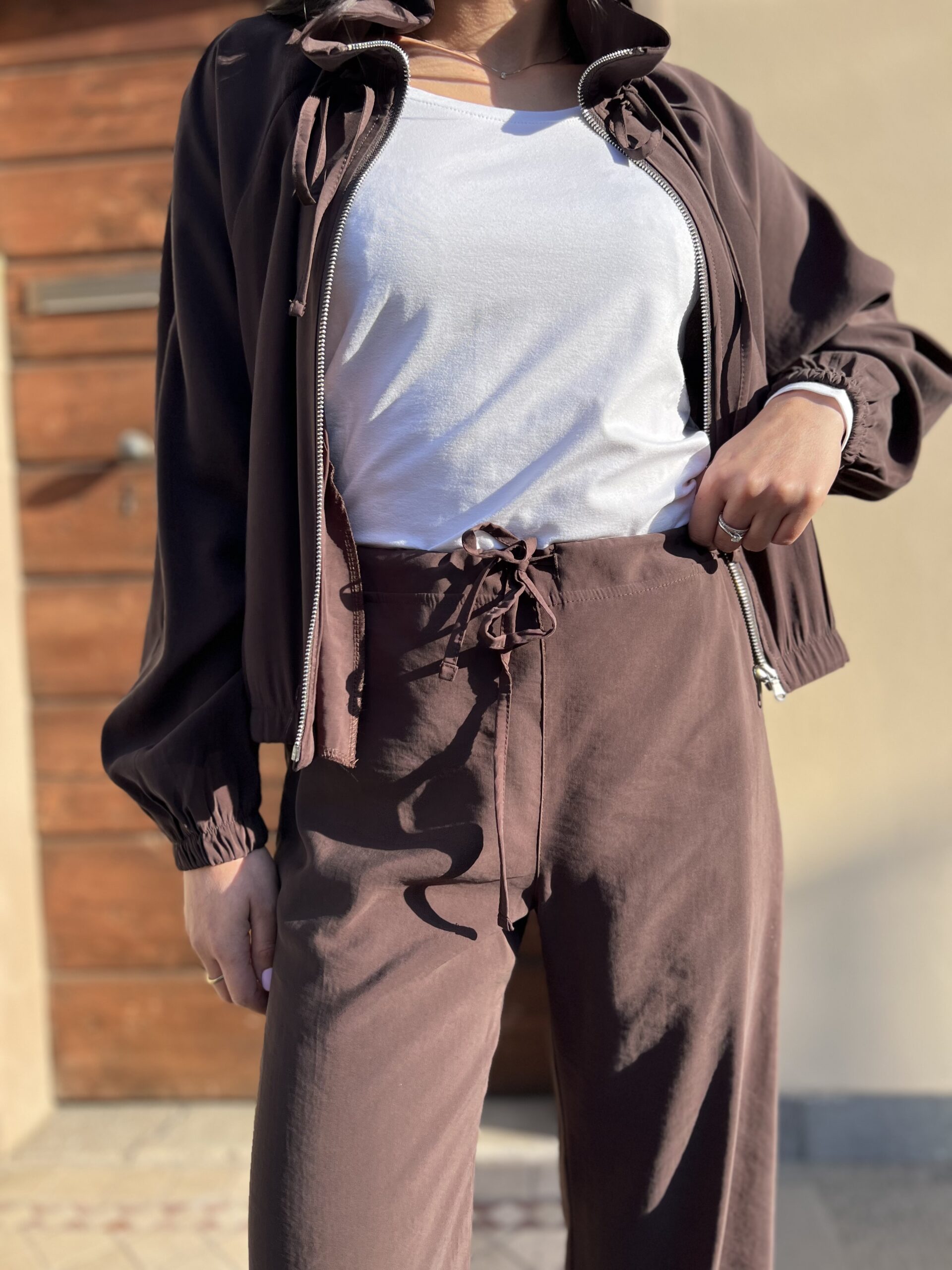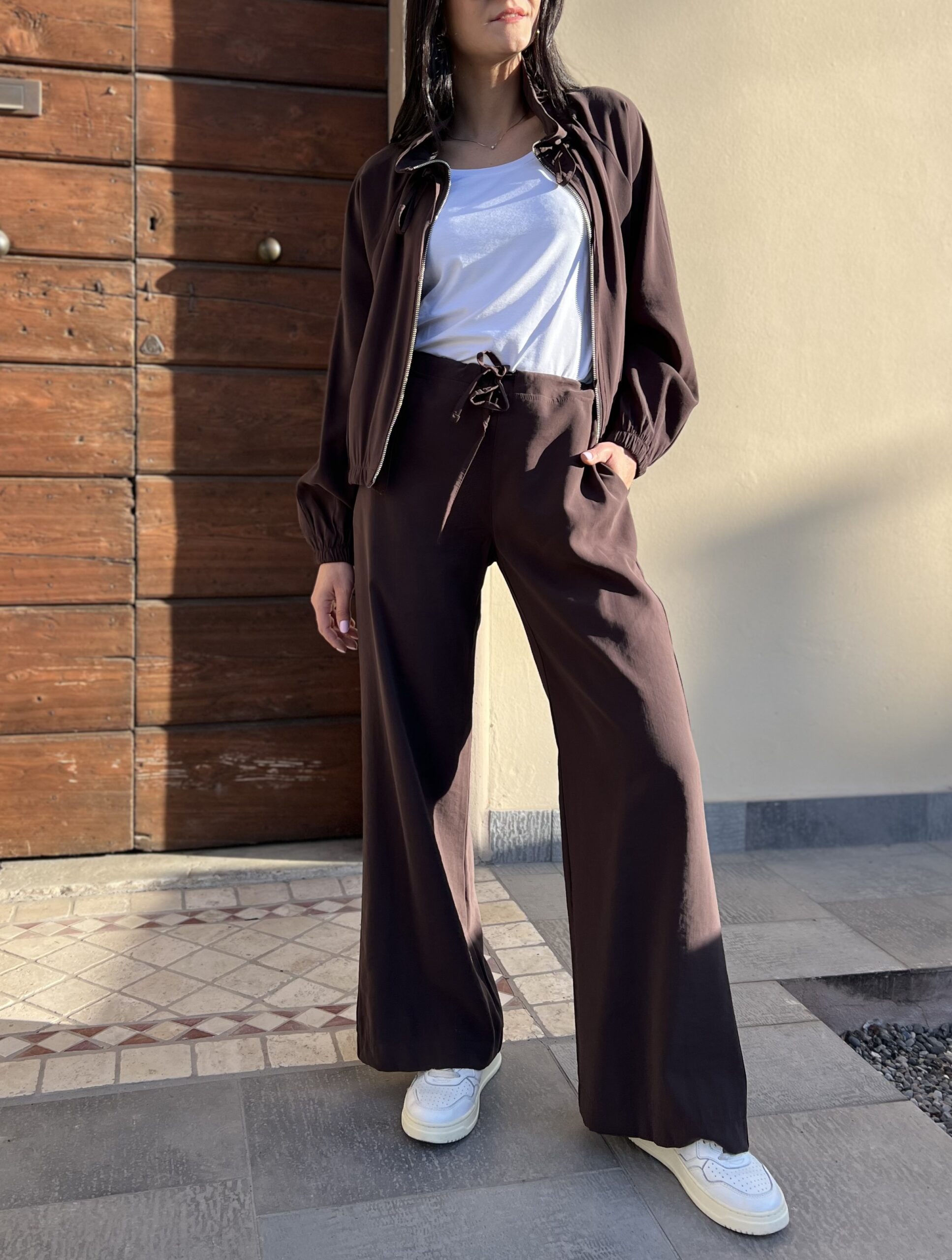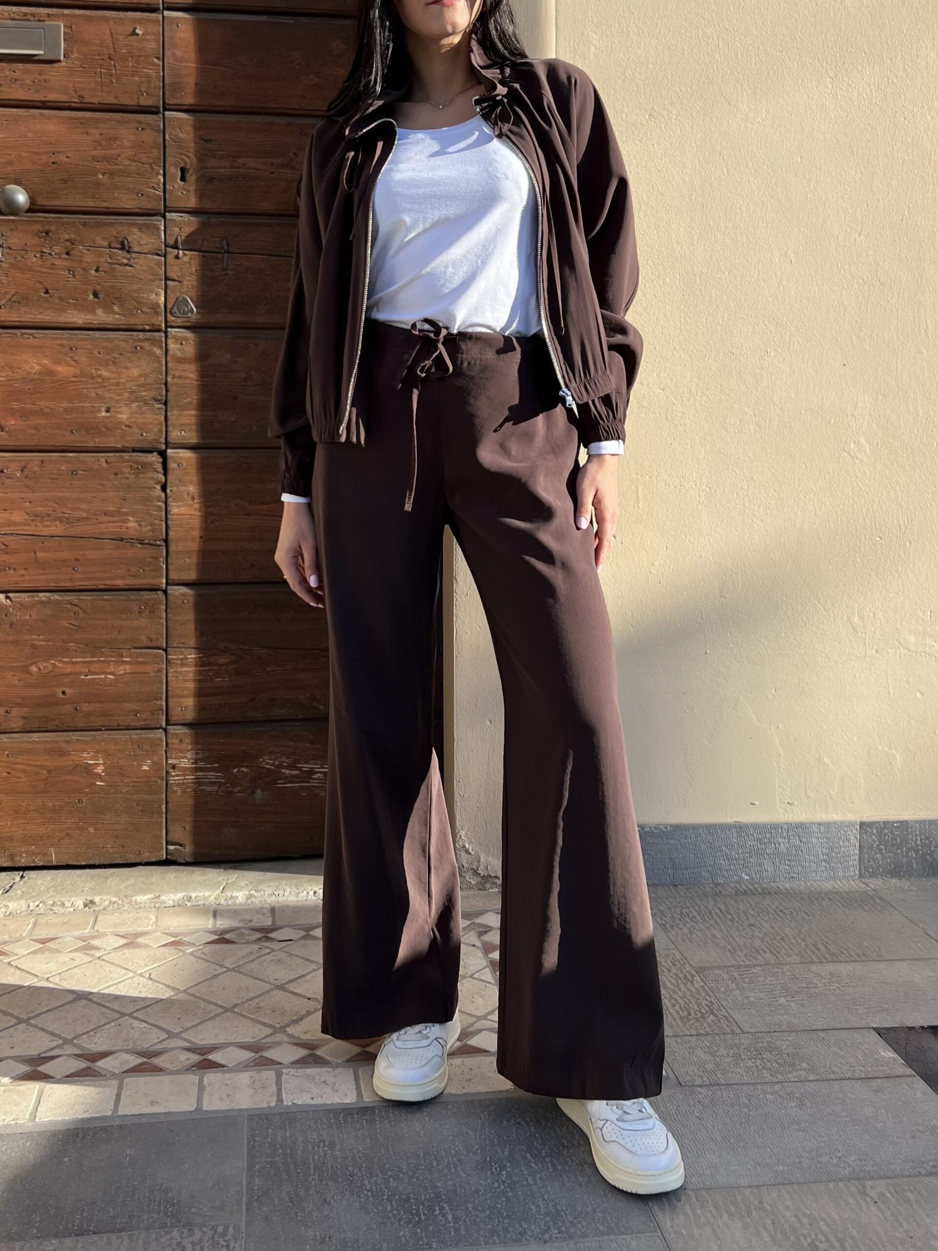 Completo in modal composto da pantalone a palazzo con coulisse regolabile abbinato alla felpa con zip e collo alto. Taglia S per 38/42 e M per 44/46.